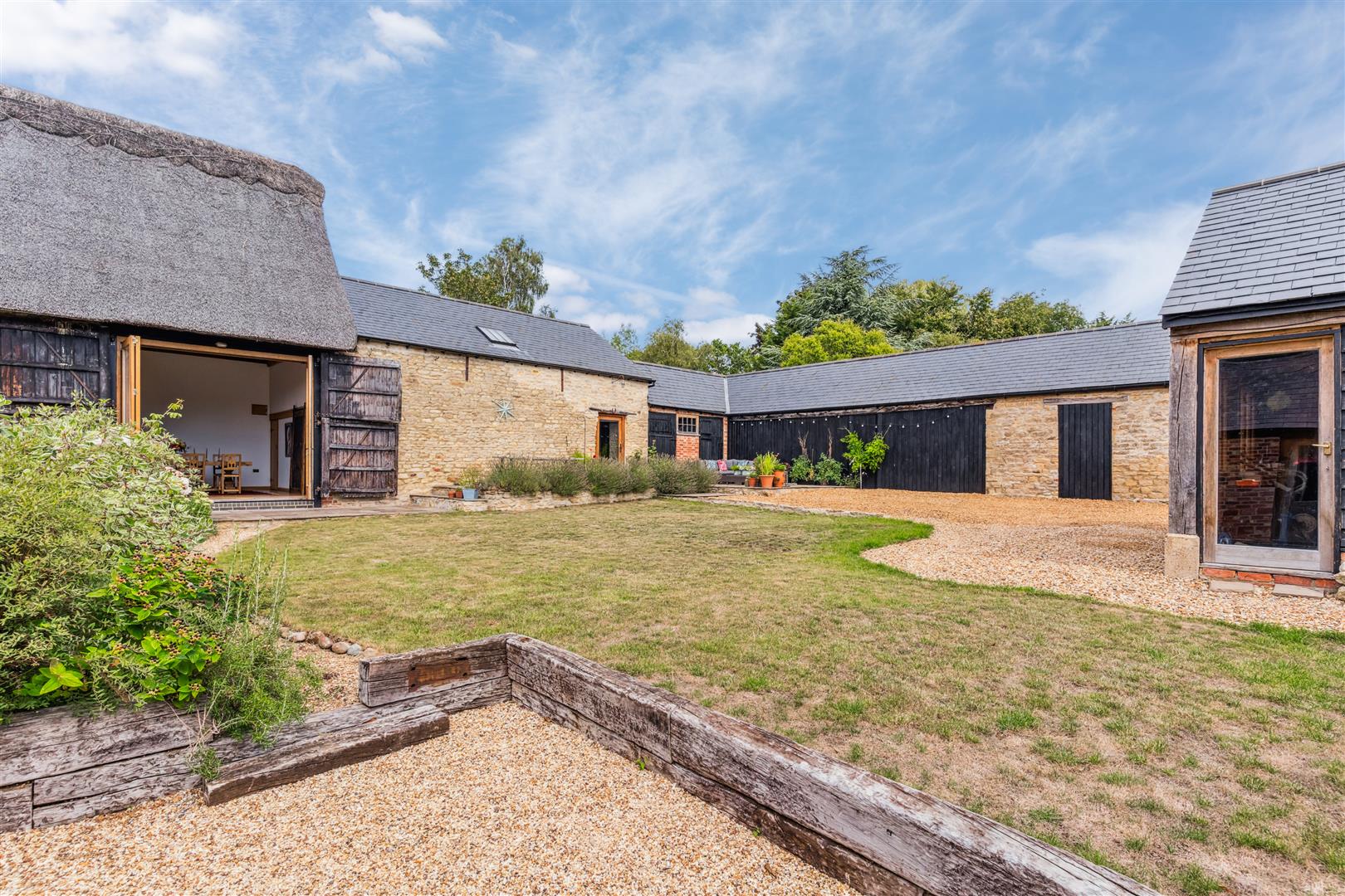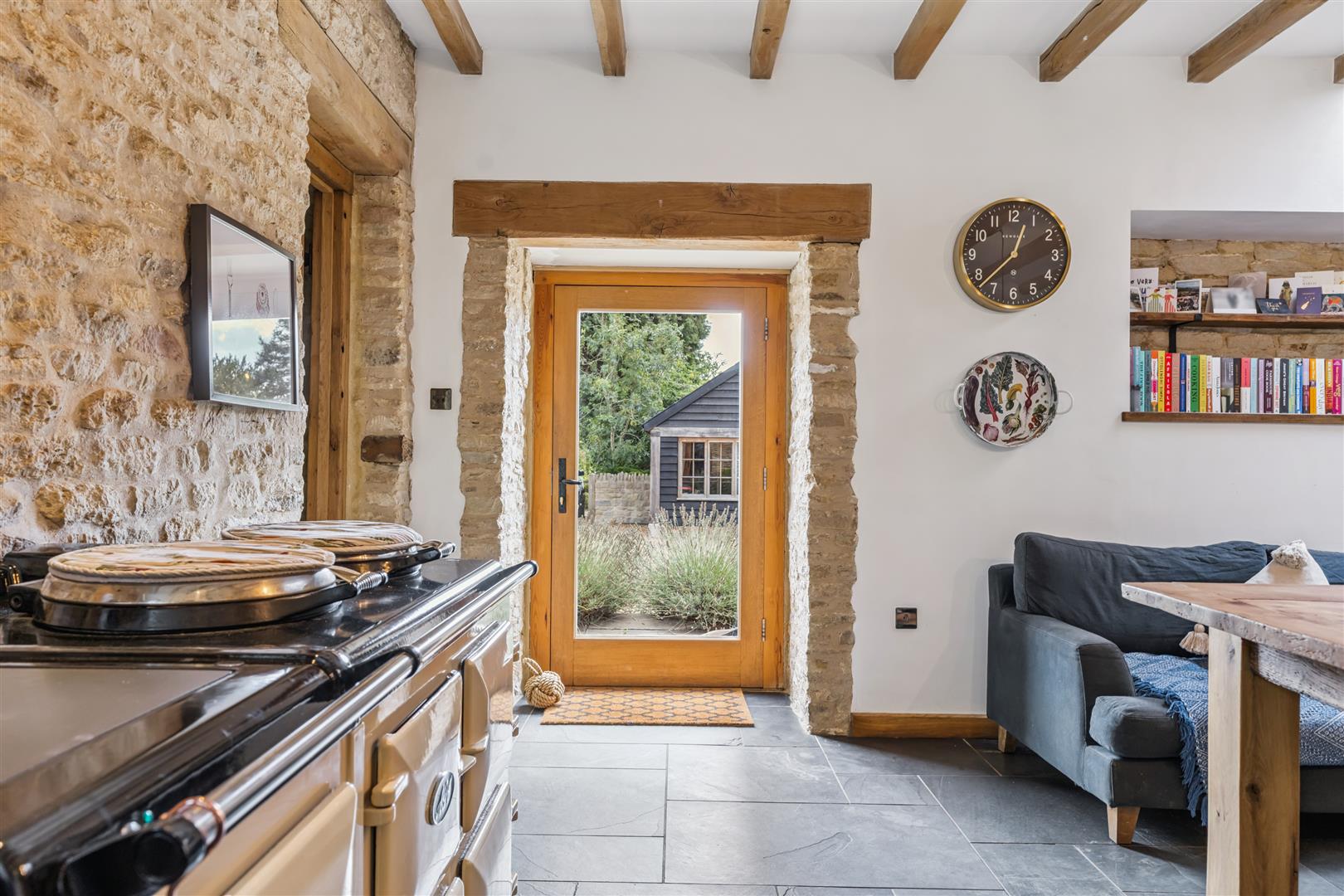 The property stands within a group of three stone built properties, the others being Westcott House and Chestnut Cottage. A stone walled entrance gives access to all three homes. Past Chestnut Cottage you enter the private drive of Willow Barn. A large garage with double wooden doors stands to the left hand side with a gravel drive and turning area. Attic storage is available overhead, The very private and secluded garden is so peaceful with no passing traffic. There is a neat lawn area with shrub borders fronting an expansive stepped area of terrace. There are sheltered and discreet seating areas arranged around the garden.