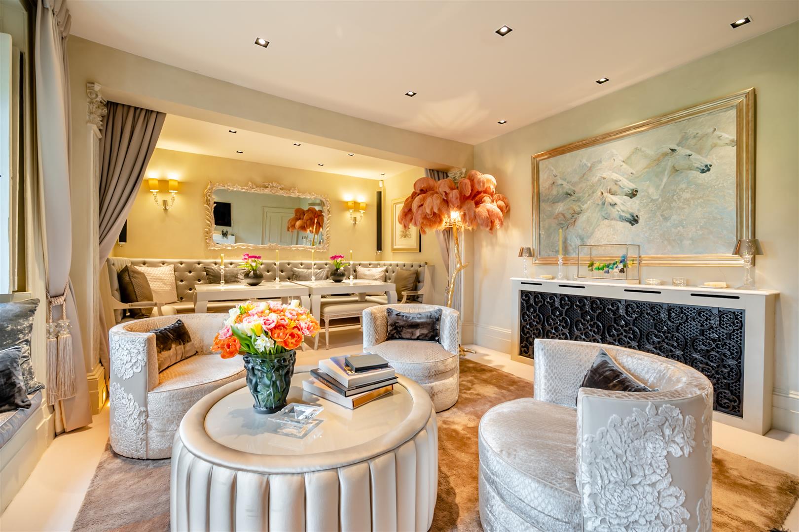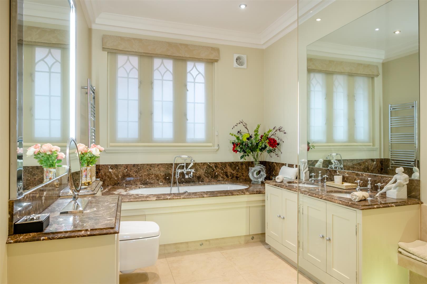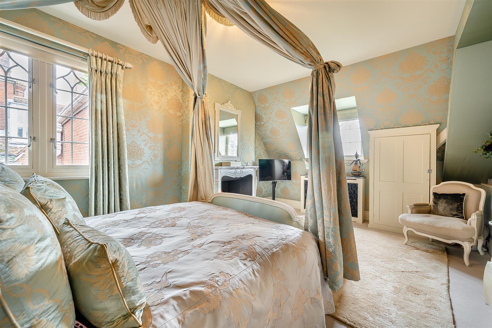 The principal bedroom has a walk in wardrobe and a bathroom. Four further bedrooms are on the first and second floors in addition to an en suite shower, wet room and bathroom. The second floor "Marie Antoinette" bedroom is rather breathtaking on entry with its Queen size bed adorned with Lilieve matching cushions and drapery. These are entirely coordinated with the pattern displayed on the rooms' "Lilieve"'silk wallpaper. One of the other bedrooms is currently used as a cinema room and equipped accordingly. A separate suite on the top floor is suitable for an au pair or nanny and consists of a bedroom, shower, cloakroom and laundry area which houses a washing machine and dryer.