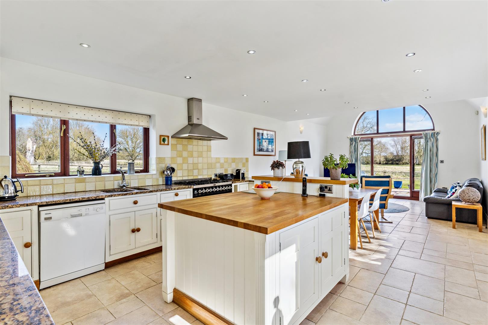 The entrance door opens into a spacious hallway. From the hallway a bespoke staircase with oak balustrades rises to the first floor. A cloakroom with WC and wash basin is found in the hallway. Entering the principal reception room, the Sitting Room and Orangery, a delightful focal point is the splendid stone fireplace mounted over a brick hearth which accommodates a wood burning stove. There are attractive aspects over the garden from the sitting room which is open plan to the Orangery. The present sellers are responsible for the building of this stunning Orangery which looks out over the carp pond towards the historic Grange. A dining room has double doors to the garden and a studio is located on the ground floor of the tower and is currently used as a music room and occasional hobby room. These rooms have a connecting door. The kitchen/breakfast room is open plan with a vaulted ceiling creating a light and airy ambience with an arched window to the gable end wall and double doors to the garden. This hand crafted kitchen has a vast array of cabinets arranged to base and high levels with deep storage drawers and wine store. Work surfaces are in granite whilst a central island provides additional storage as well as a raised breakfast bar. Integrated to the kitchen furniture are a fridge, dual fuel range cooker with two ovens, a six ring gas hob with extractor over. Space is available and plumbing provided for a dishwasher. The flooring is in Italian tile and this area has underfloor heating which continues into the family area where there is a log effect gas stove and delightful views over the garden and paddocks beyond. Alongside is a utility room with additional cupboard space, a sink unit and space and plumbing for white goods.
