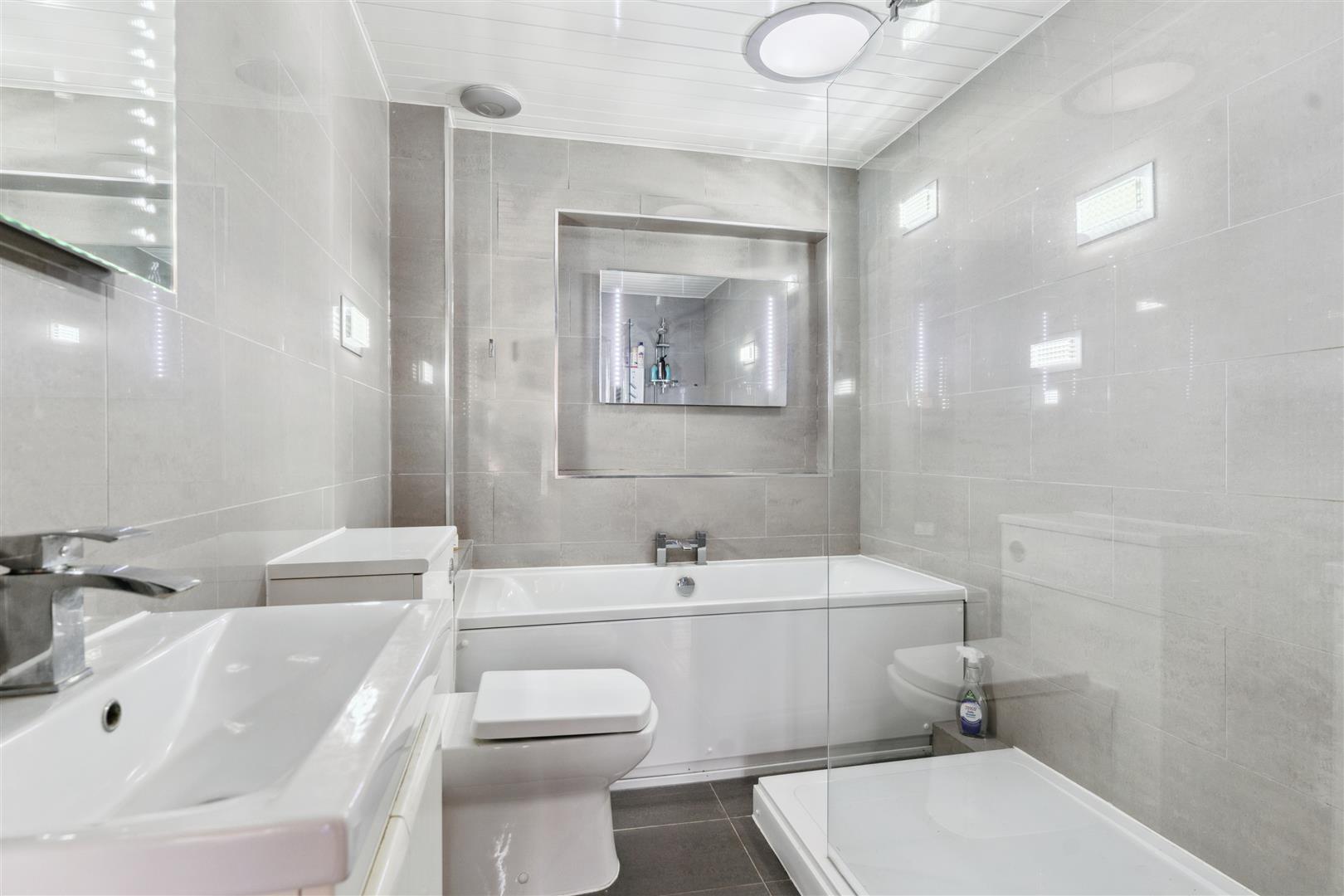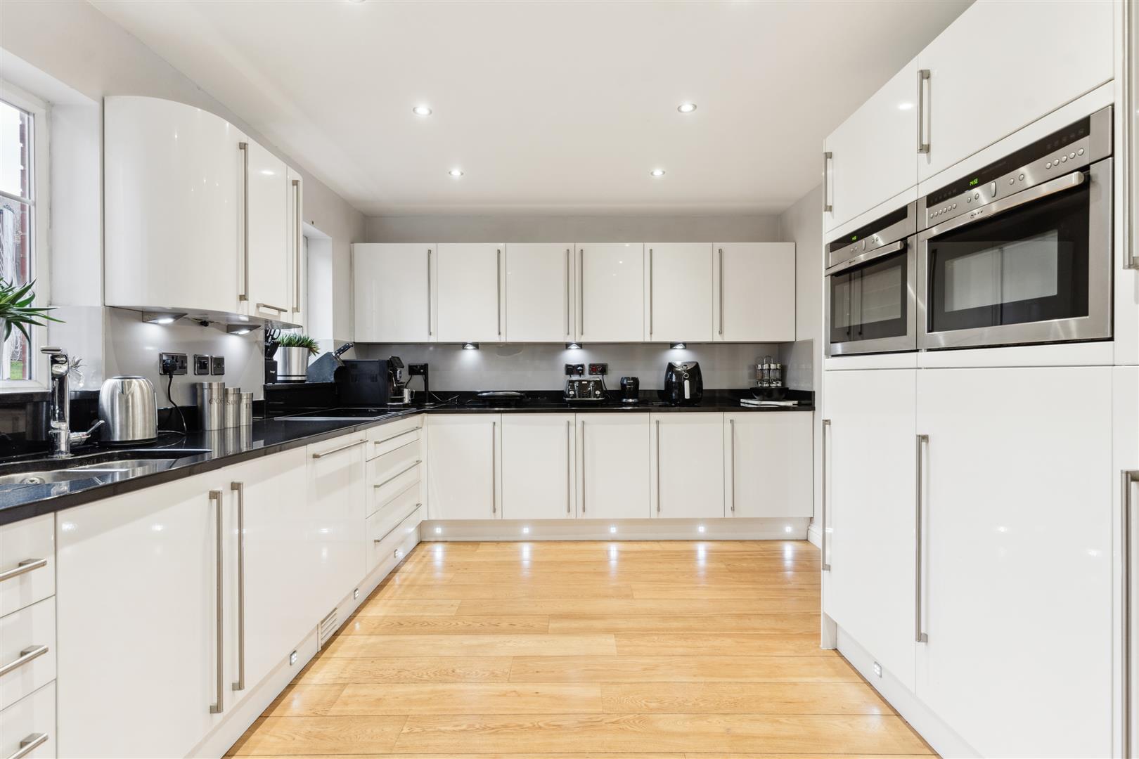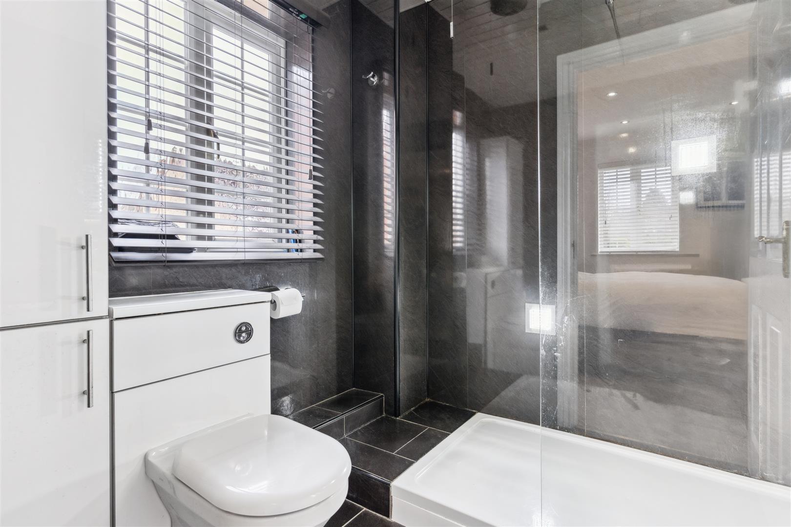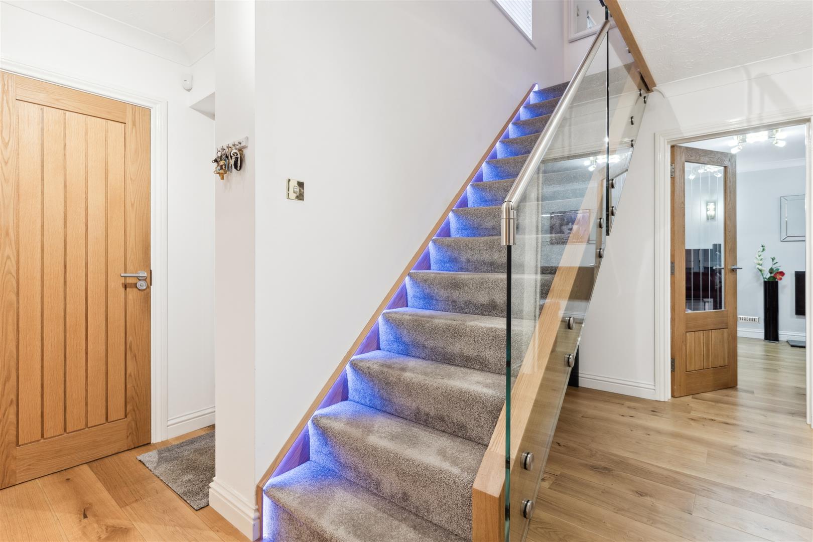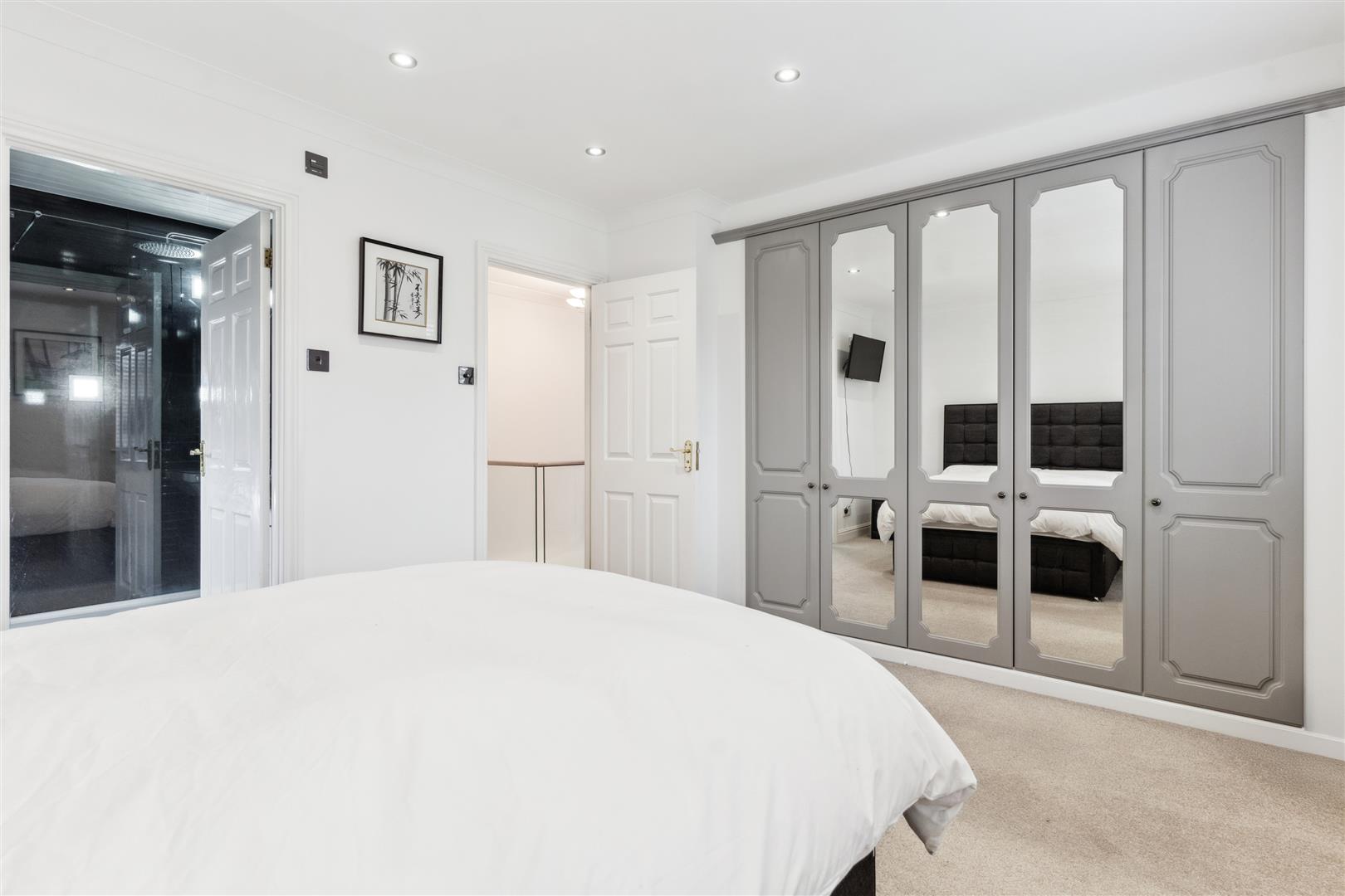 The staircase to the first floor has discreet low level lighting to every tread and a bespoke tempered glass protection screen to one side which also extends along the landing area where there is a large airing cupboard and a loft access hatch.. There are 5 bedrooms on the first floor all capable of housing a double bed and all with fitted wardrobe furniture. The master bedroom has an en suite shower room and waterproof PVC panels to the ceiling.. This en suite facility is state of the art with a large walk in shower, WC and wash basin all of which are contemporary in design. The family bathroom follows the same high standards and has a large walk in shower, full size bath, WC and wash basin. The flooring is fully tiled as are the walls which have integrated lighting arranged randomly around the room. The ceiling is fitted with tongue and groove PVC waterproof panels. A heated towel rail is mounted to one wall.