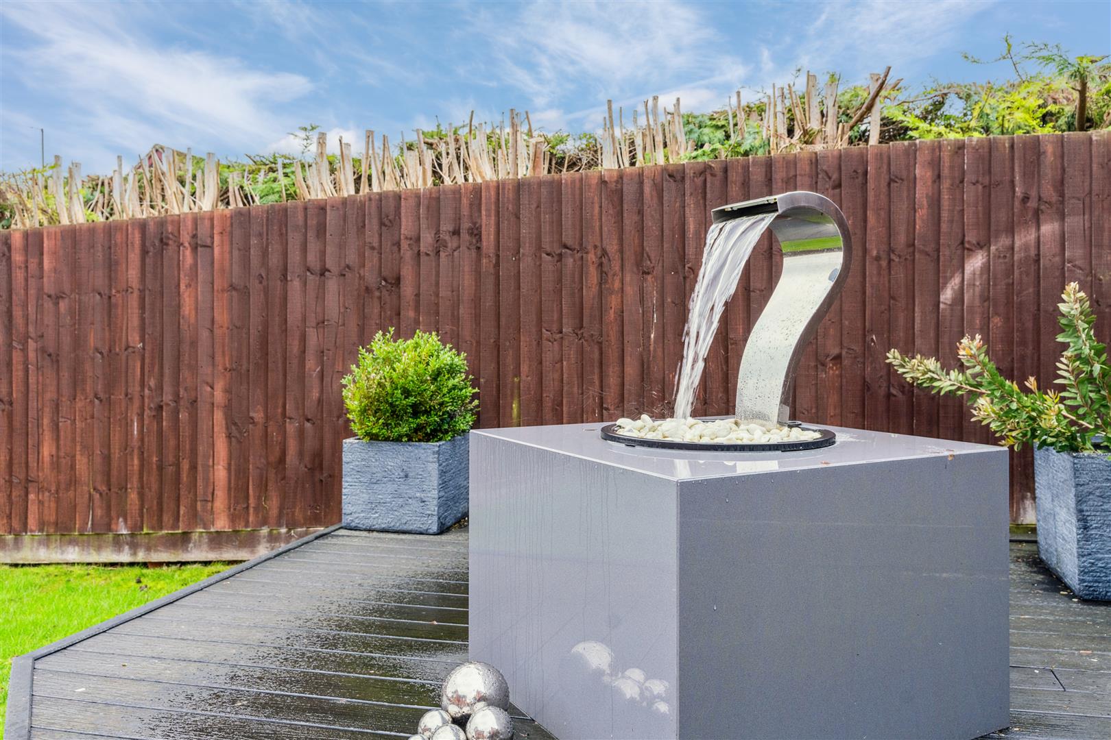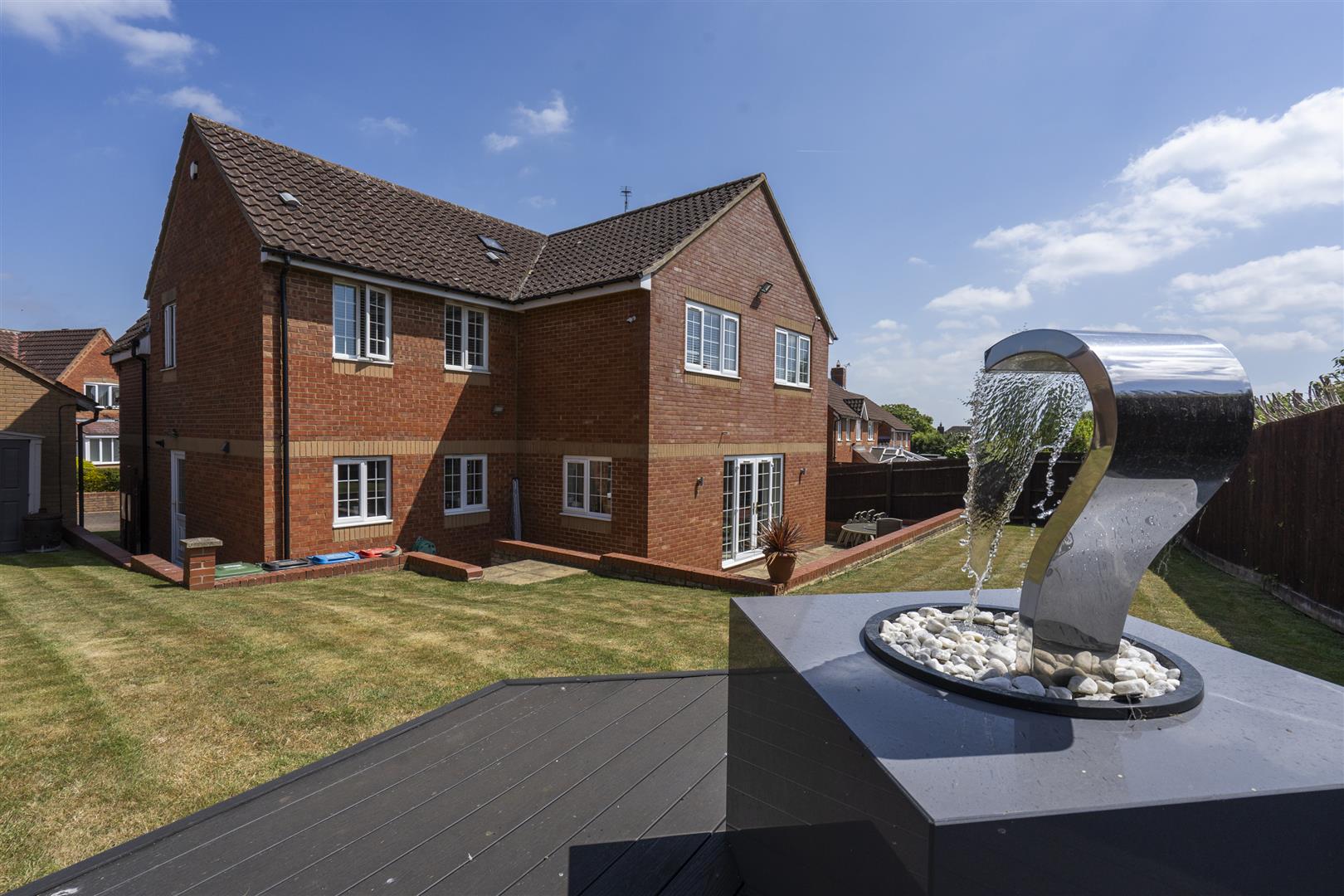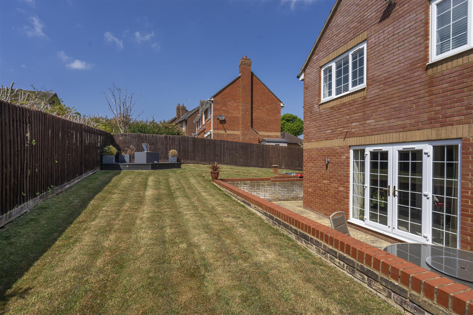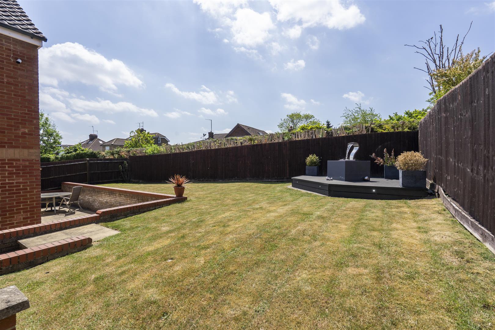 A driveway to the front of the property leads to a double width garage, both up and over doors having additional security locks. The garage unusually is much higher than normal with storage space in the roof void and Duratread PVC non slip interlocking tiling applied to the floor. There are planting areas to the front of the property and a side pedestrian access to the gardens at the side and rear. The rear garden is predominantly lawn with paved areas and patio at a lower level abutting a brick built retaining wall. A secluded area of decking is set to one corner.