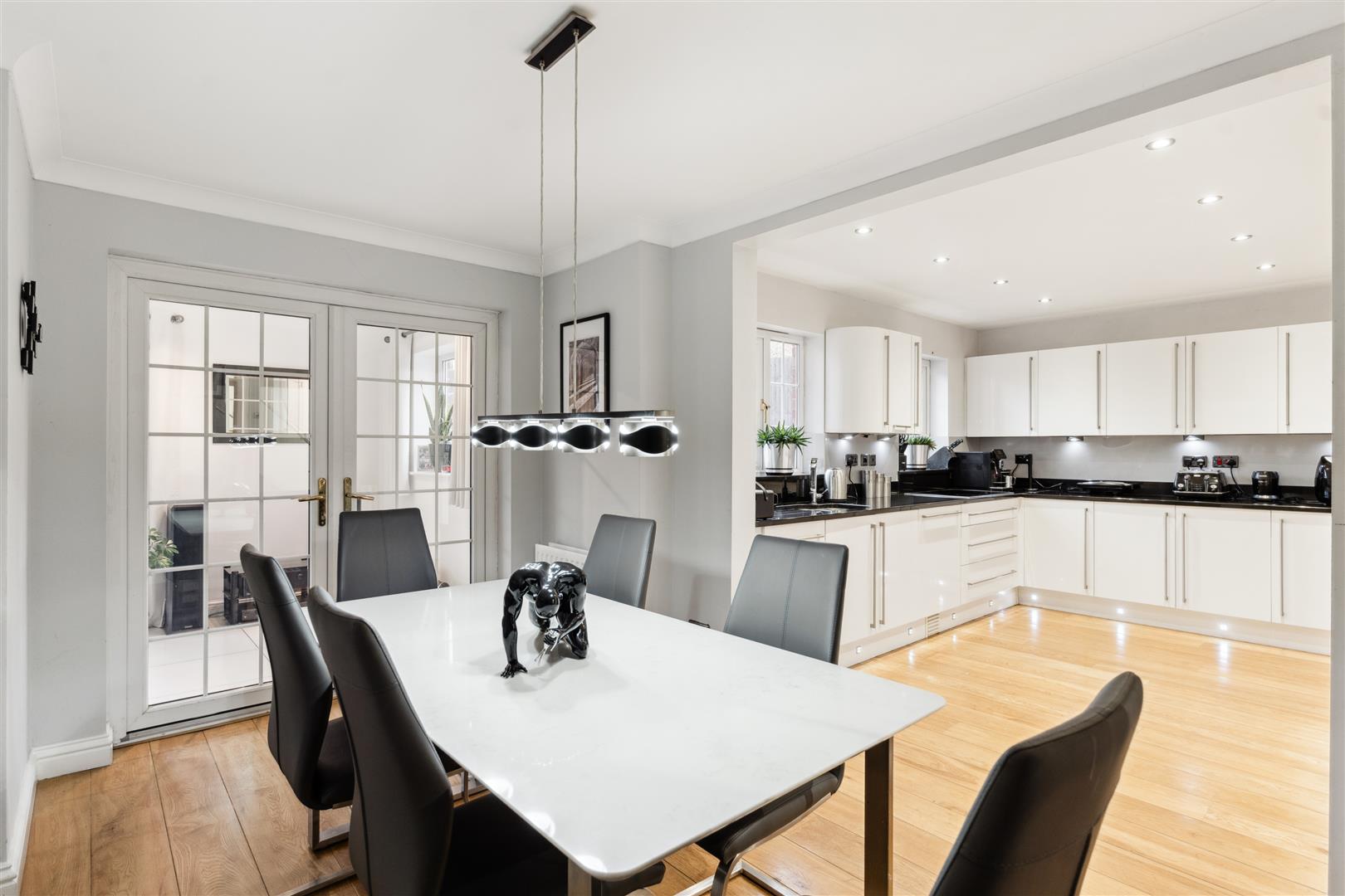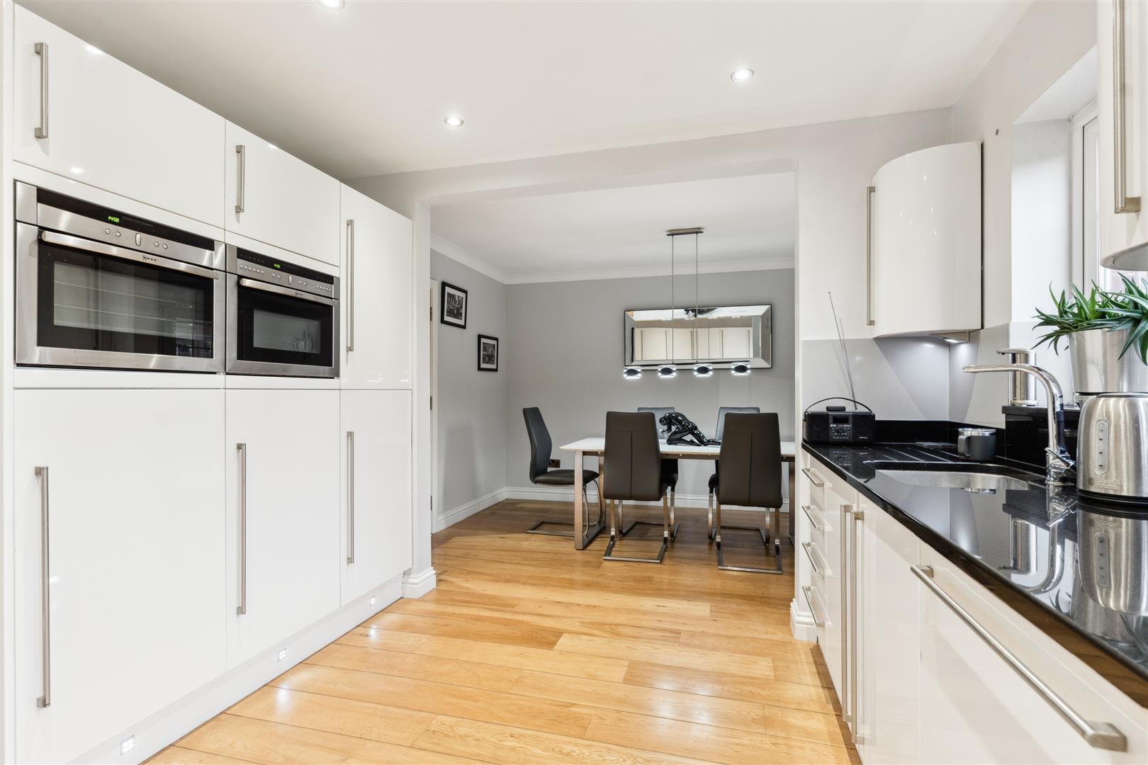 A replacement door in UPVC with glazed centre panel opens to a delightful entrance hall of spacious proportions with engineered oak flooring which continues around the majority of the ground floor. The staircase rises from this area to the first floor and offers a built in store cupboard and cloakroom. The cloakroom has a modern suite of WC and wash basin with wall and floor tiling. Doors lead off the entrance hall to the study, kitchen and sitting room. The study has a walk in window bay and wooden flooring and is located to the front of the property. The sitting room is accessed by a part glazed door opening to a well proportioned room with a bay window, There is an interesting focal point of a hole in the wall log burning fire with protective hearth under. Fitted wall and ceiling lights are an attractive feature with natural light flooding in from the window to the front. Glazed double doors open to the garden room which has tiled flooring and small pane double glazed doors opening to the rear garden and patio area. The kitchen and dining area are combined, the kitchen providing an integrated dishwasher, two fridges and a freezer and two built in Neff ovens with a matching hob unit. There are an extensive range of cupboard units and pan drawers arranged around the kitchen. Door off to the utility room with a sink unit and plumbing for an automatic washing machine and space for a tumble dryer. Door opens to a garden area at the side of the property. Open plan to the kitchen is the dining area which has a door giving access into the garden room. Both the dining area and kitchen have wooden flooring.