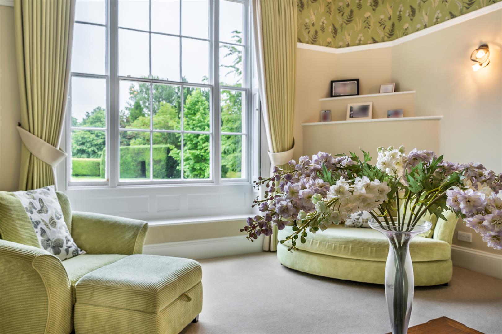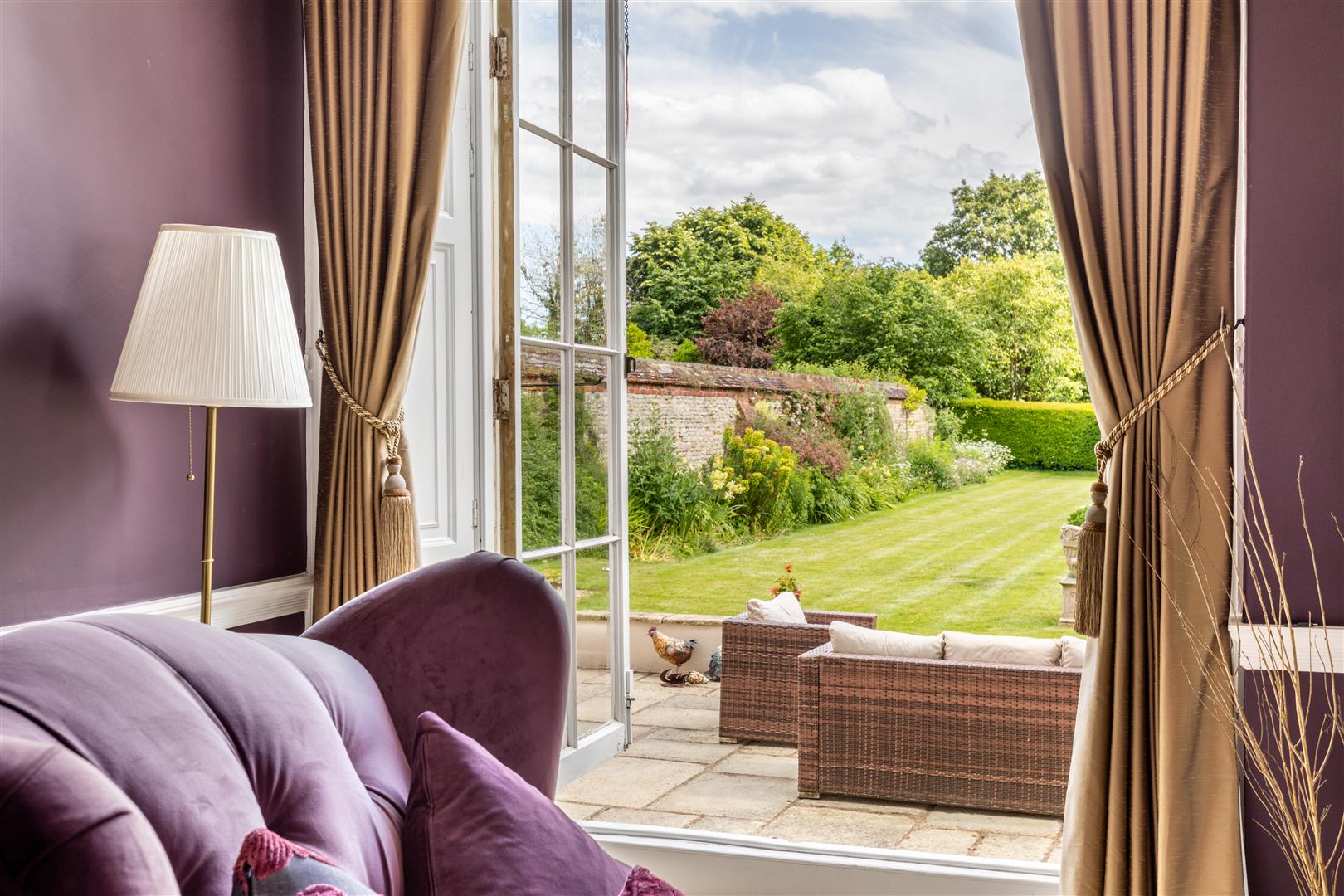 The drawing room is found at the front of the property with delightful views over rolling countryside through the full height windows whilst additionally there are “French doors” which open to an extensive and sunny paved terrace fronting the south facing formal garden. Similarly, the library which is a favourite room of the owners, enjoys the same countryside views. Both rooms have an open fireplace.