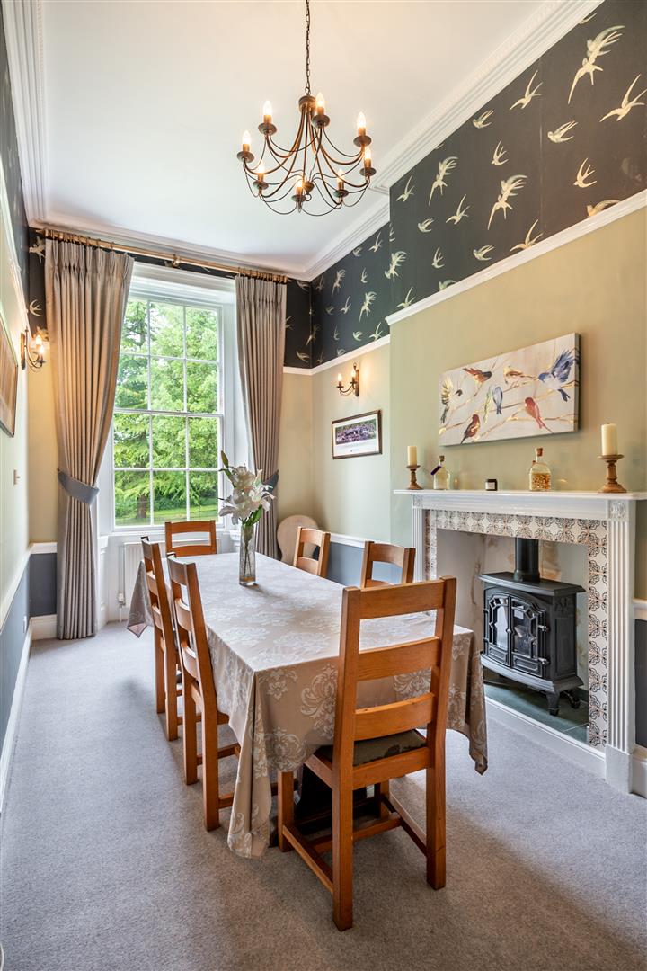 The drawing room is so generously proportioned and looks towards the formal garden. This is a marvellous room where the family can happily congregate. There is a welcoming fireplace housing a wood burning stove which spreads supplementary warmth on colder evenings. Opposite is the dining room though these rooms can be interchanged if preferred. The dining room also has a fireplace. A cloakroom is located adjacent.