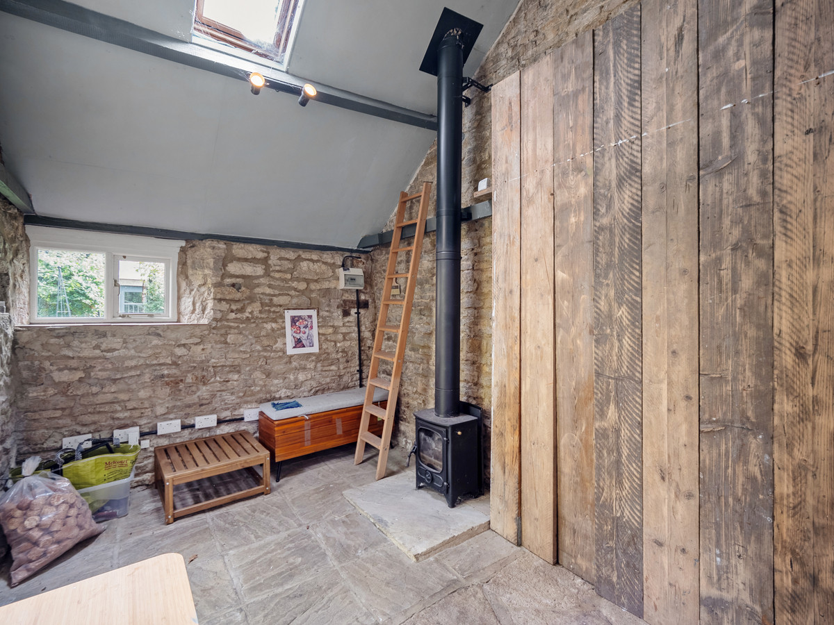 - Detached workshop/studio (former village fire station) with wood burner and power.
