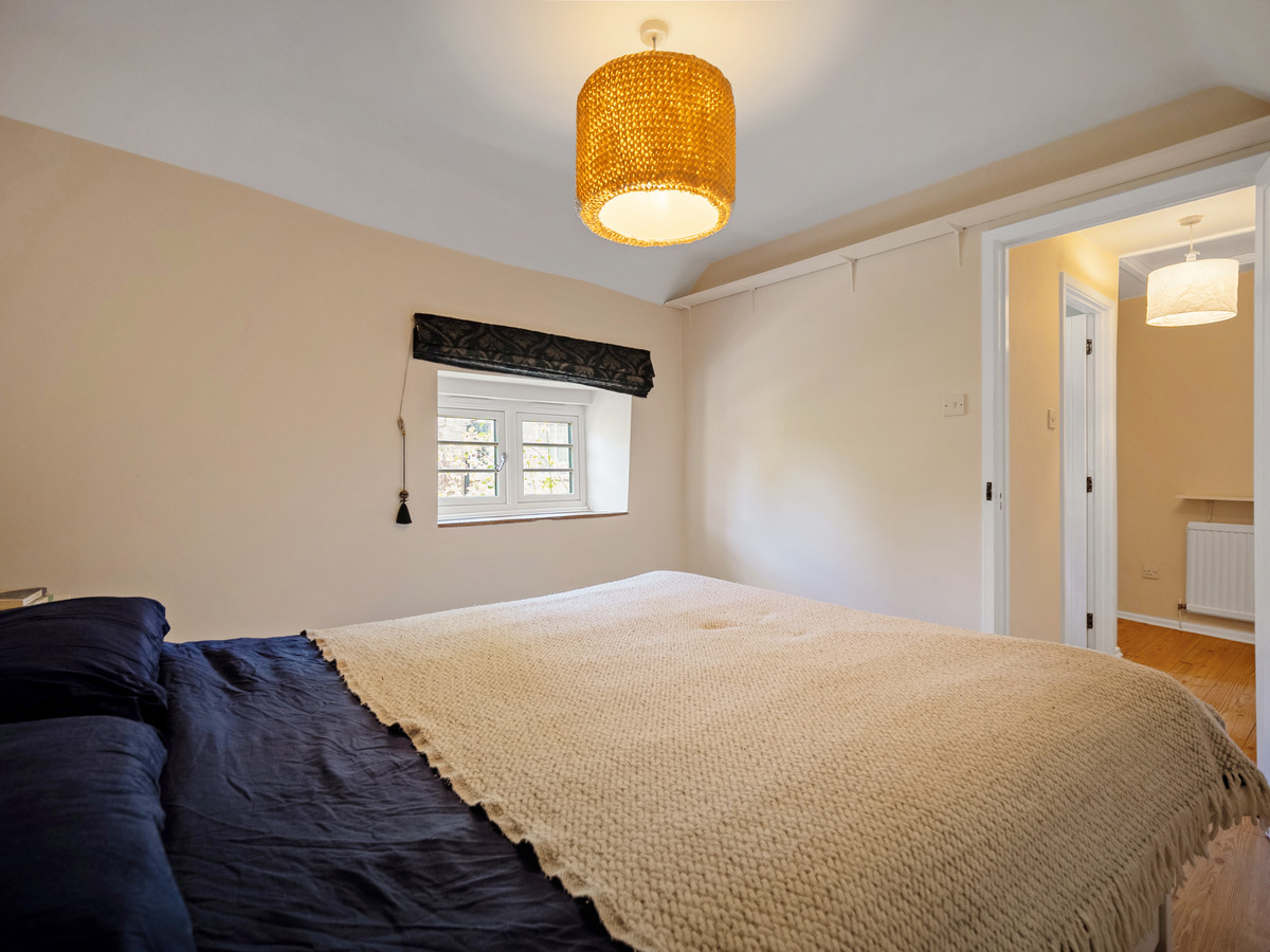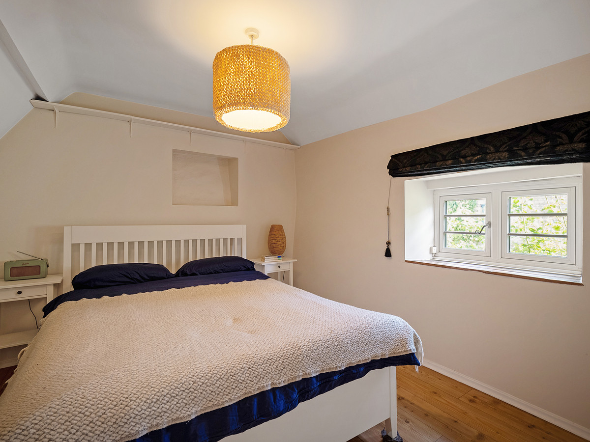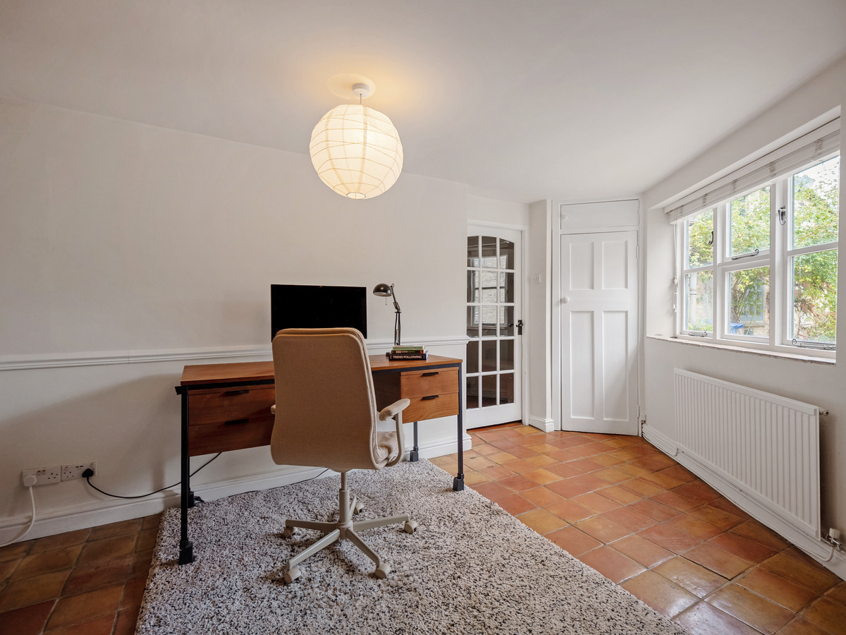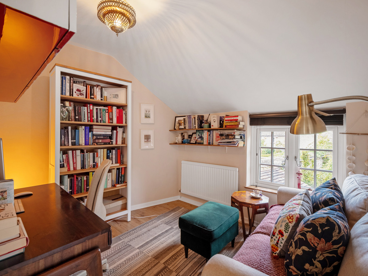 The ground floor comprises an inviting entrance hallway, a well-appointed kitchen with a gas range cooker, a dining area, and a charming sitting room with wood-burning stove. Both the kitchen and sitting room enjoy direct access to the rear garden, creating a natural connection between the indoor and outdoor living spaces. In the 1990s, the former garage – and prior to that the village blacksmith’s forge – was converted to create a further reception room, now a study, with an additional mezzanine level currently accessed via a ladder. This space offers excellent scope to be reconfigured as an additional bedroom, subject to the necessary consents. A ground-floor shower room completes the accommodation on this floor.