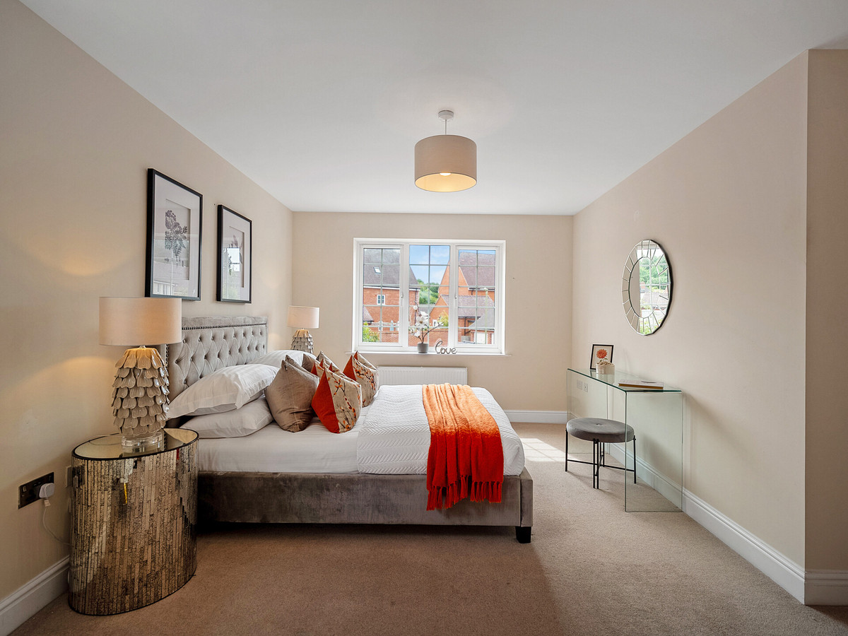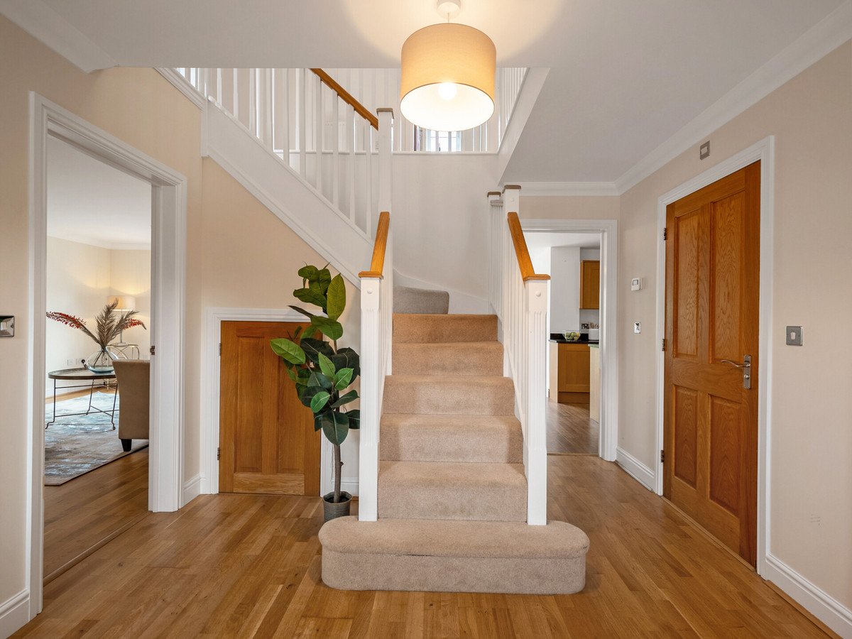Upstairs, four well-proportioned double bedrooms are accessed from the central landing. The principal bedroom includes a dressing area and en suite shower room. A second guest bedroom also benefits from fitted wardrobes and an en suite. The remaining two bedrooms are served by a family bathroom.