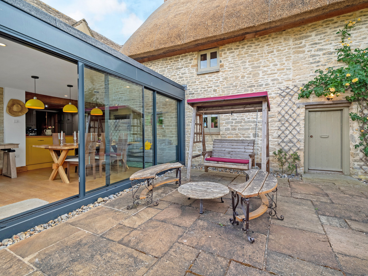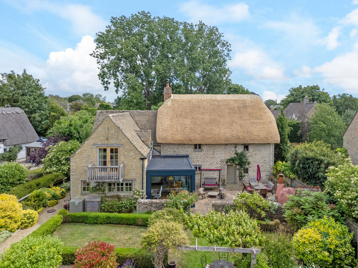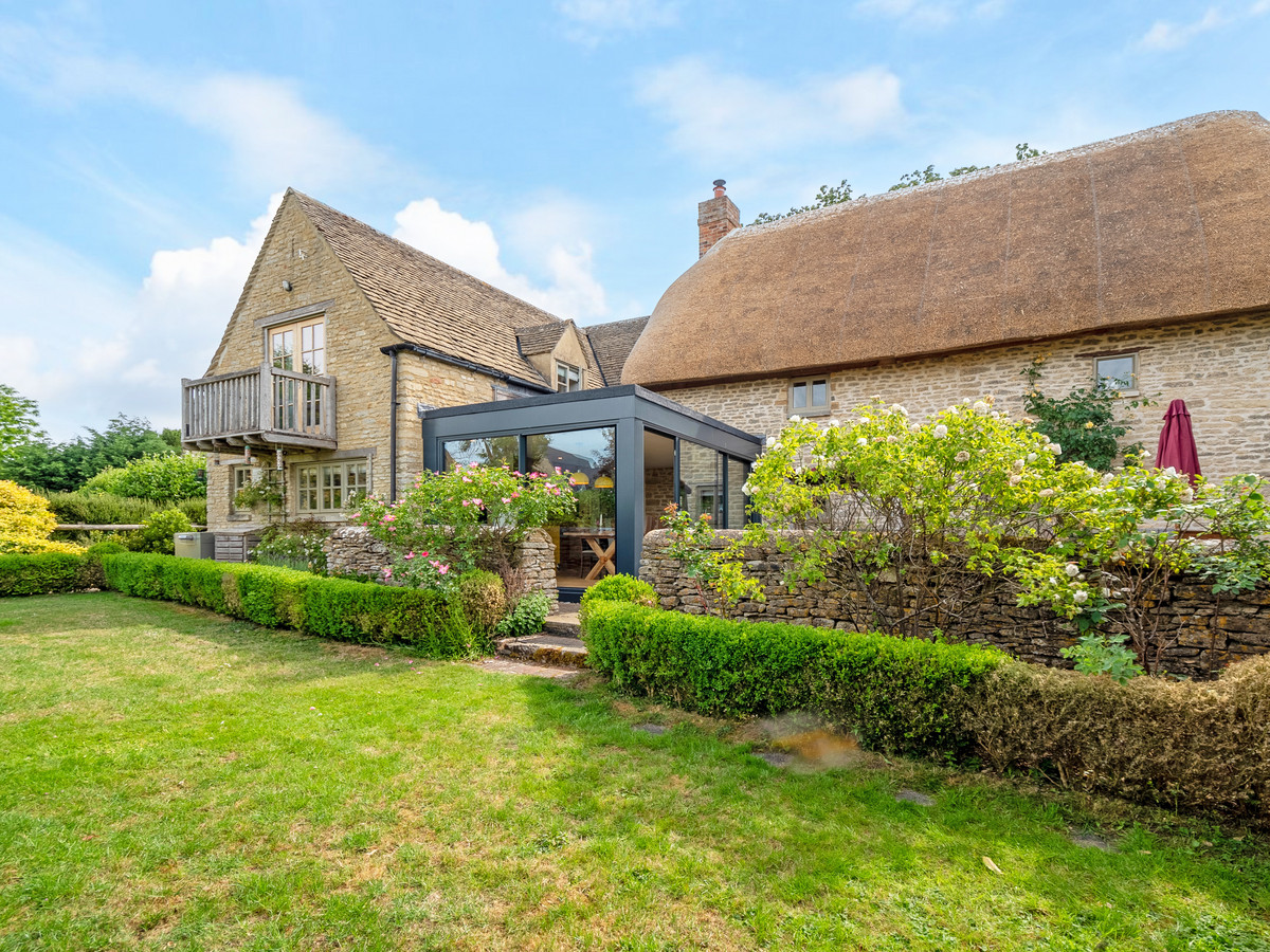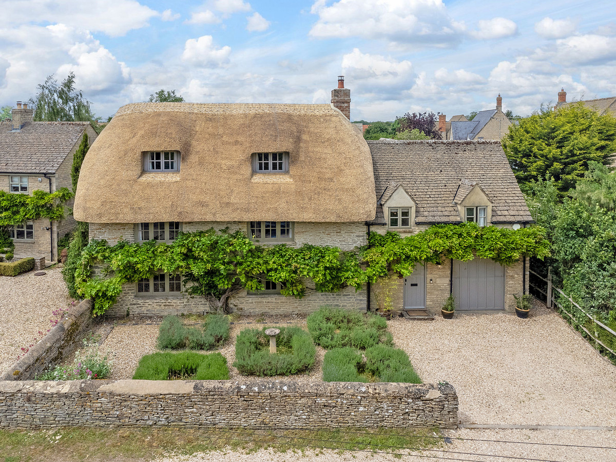 Constructed from traditional Cotswold stone with a partially thatched roof, the