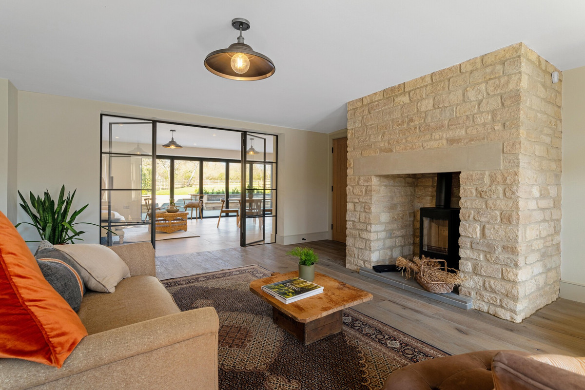 The heart of the home is a bespoke kitchen by Steven Brooker, using Masterclass cabinetry with Oak details, Quartz worktops, and a feature island with a Neff induction hob and downdraft extractor. Dual Neff ovens, a Quooker tap, and LED lighting complete the picture. This open-plan space flows into a light-filled dining and living area, where Crittall-style doors lead to a sitting room with original fireplace, a porcelain hearth, and a Contura wood-burning stove.