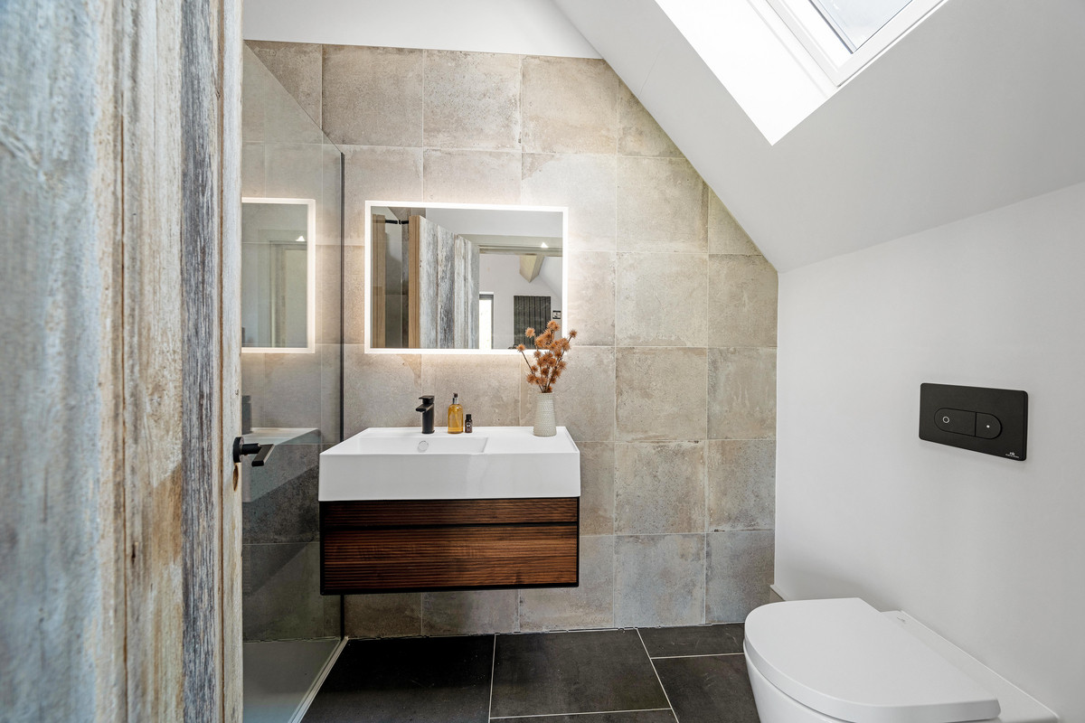 The ensuite bathroom is a luxurious sanctuary, with vaulted ceilings and a Velux roof light allowing natural light to flood the space. The high-end Porcelanosa sanitaryware is complemented by a rainfall shower with a separate hand-held showerhead. Electric underfloor heating ensures warmth underfoot, while a matt black heated towel rail adds to the spa-like experience. An integrated motion sensor mirror with low-level lighting and a shaver charging point makes for discreet night-time use, enhancing the bathroom’s quiet, tranquil ambiance.
