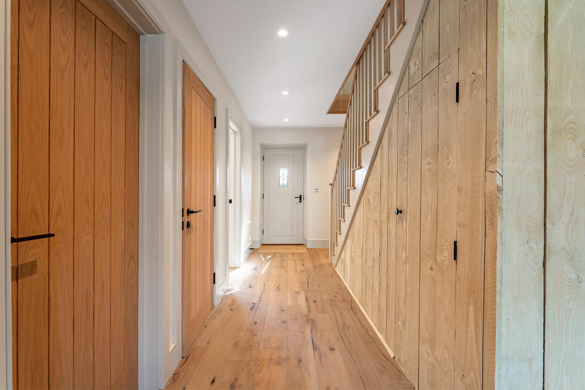 From the Minster Cotswold paving and French Oak-framed porch to the hand-finished hardwood front door, every detail has been considered. Internally, a palette of engineered grey-washed oak flooring, custom oak joinery, and locally sourced materials reflect both quality and restraint.