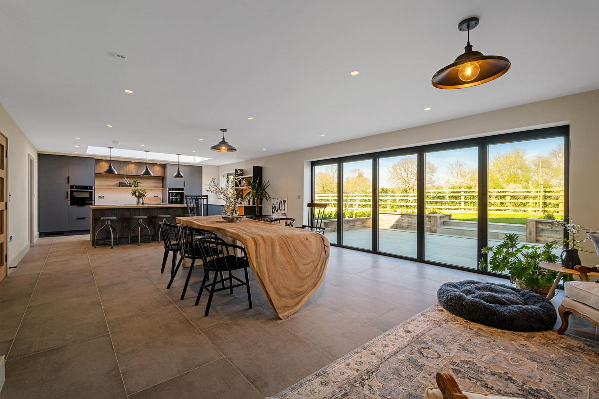 The open-plan layout flows effortlessly into a dining and living area, where expansive bifold doors lead directly onto a porcelain tiled patio, seamlessly blending indoor and outdoor living. Crittall-style doors open to the sitting room, complete with a bay window and Jøtul wood-burning stove, offering both style and substance.