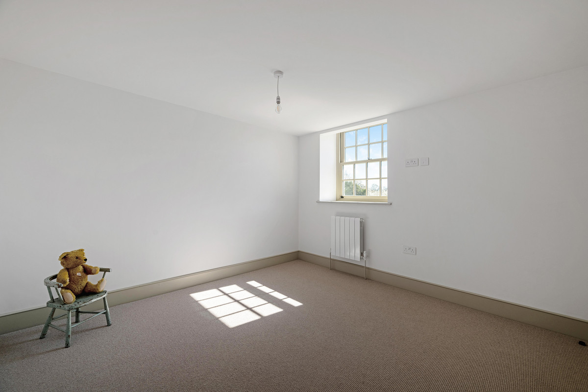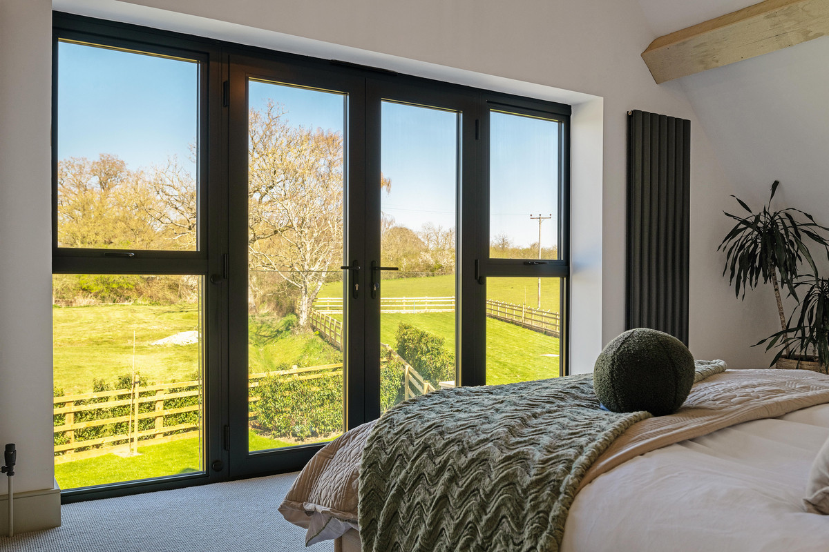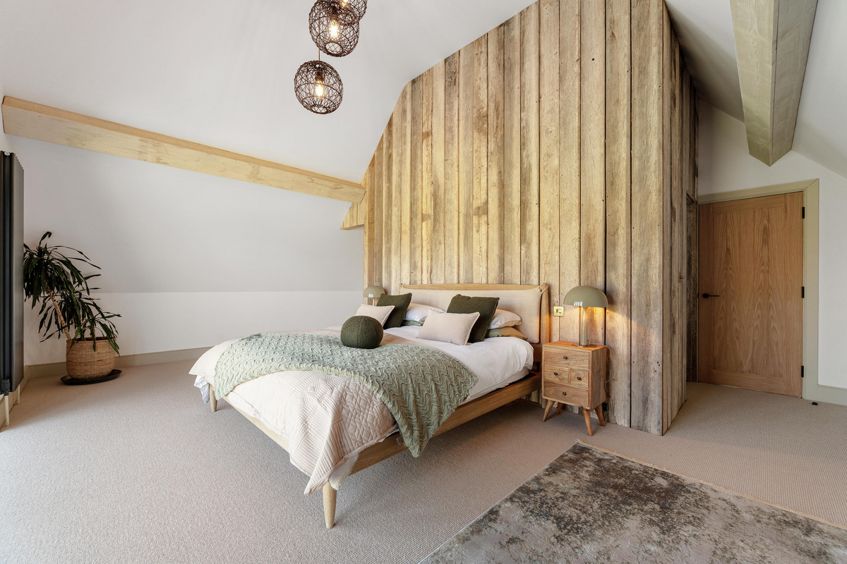 The principal suite enjoys French doors opening onto a Juliet balcony with glass balustrade, perfectly framing the uninterrupted countryside views. Vaulted ceilings enhance the sense of space and light, while a feature wall of reclaimed Romanian floorboards brings warmth and tactility. Anthracite grey radiators and integrated USB bedside sockets offer style and practicality.