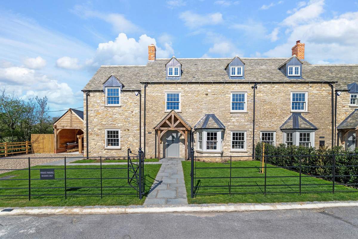 To the front, estate fencing and traditional planting- including lavender- frame the home beautifully. To the rear, a modern rendered elevation contrasts elegantly with the Cotswold stone frontage. A private driveway offers off-road parking for several vehicles, in addition to a stylish carport with an integrated electric vehicle charging point. Adjacent to the carport is a convenient outside storage shed, providing further practical space.