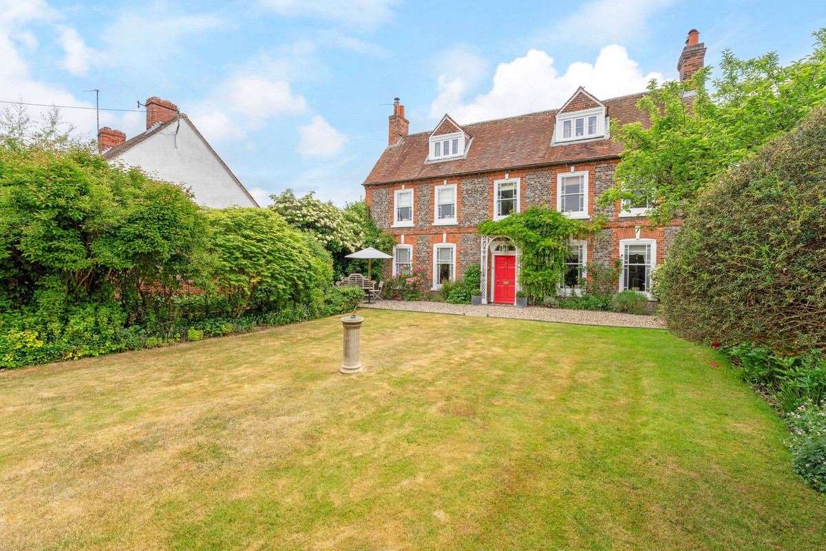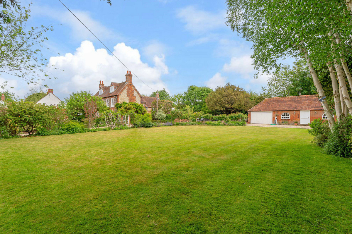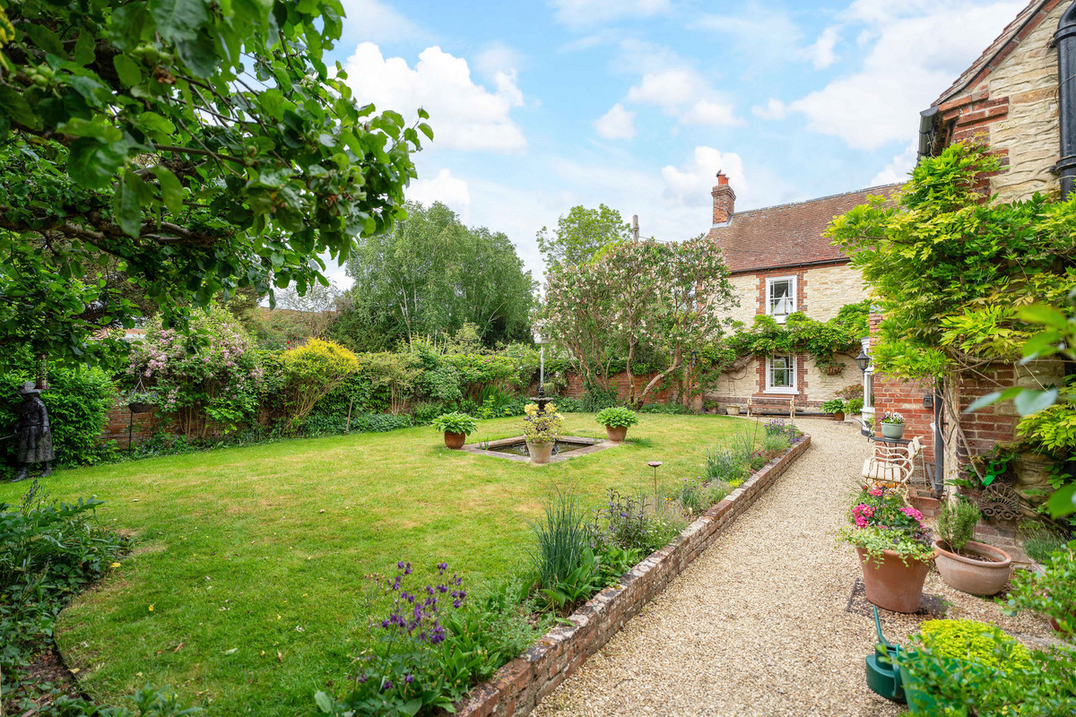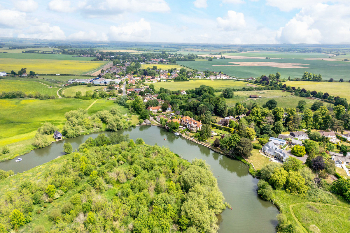 The Riverside House showcases Georgian charm with blue/red brickwork and stone sides. Set on a half-acre walled garden with a detached barn, two garages, and studio/office potential. Just a minutes walk from a scenic bend of the River Thames.