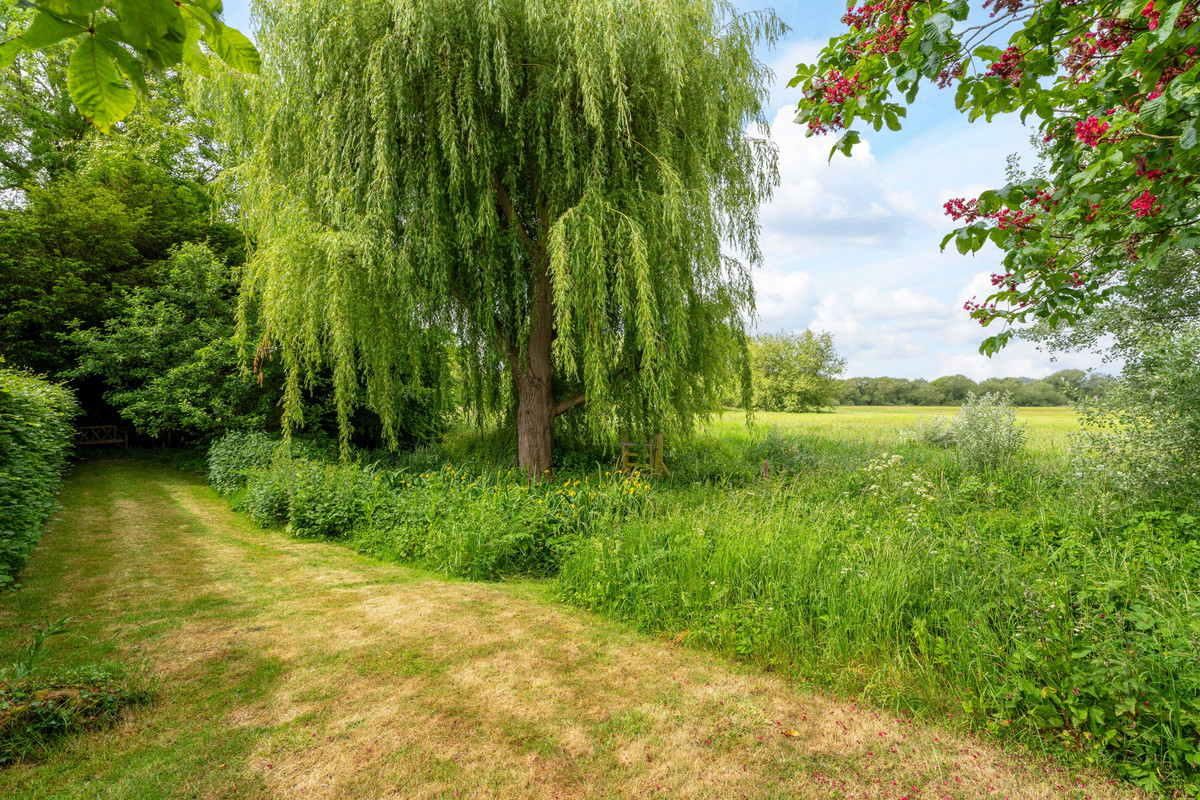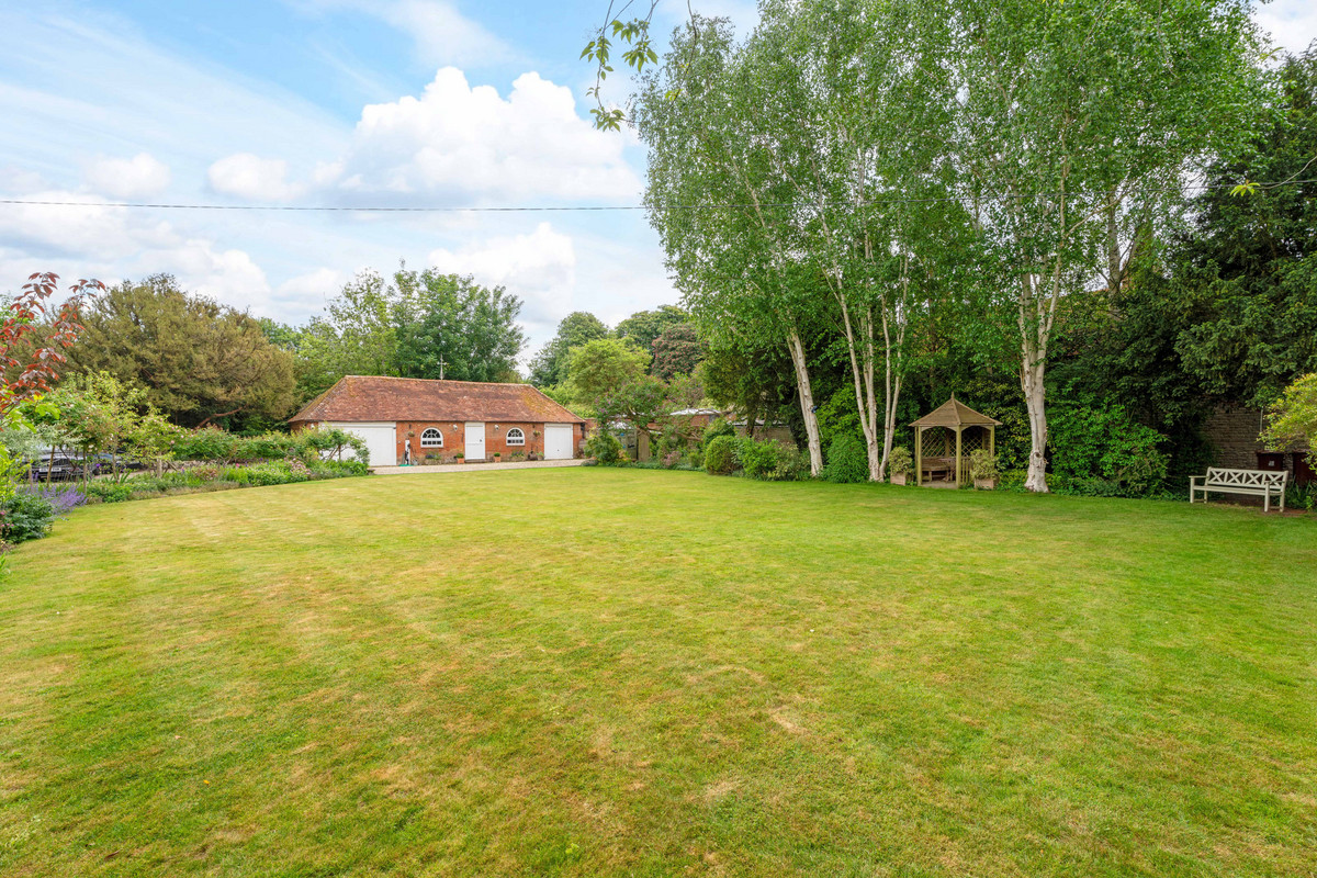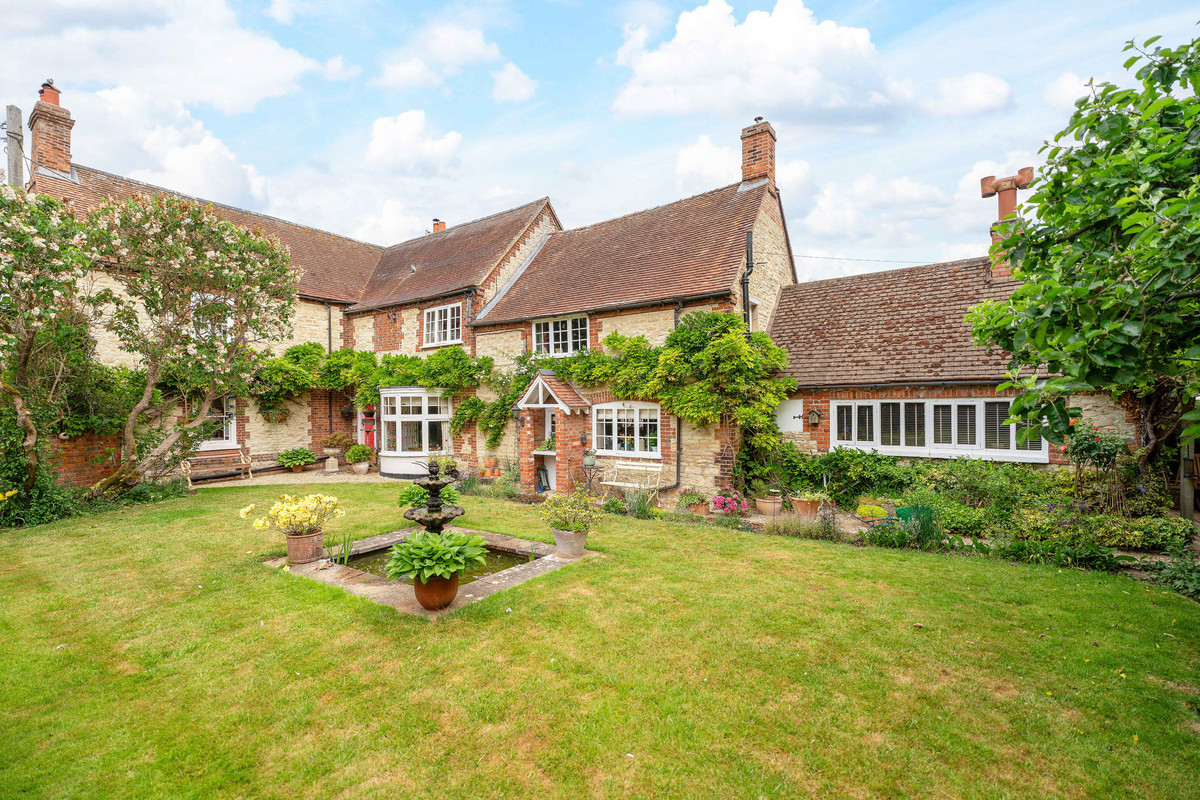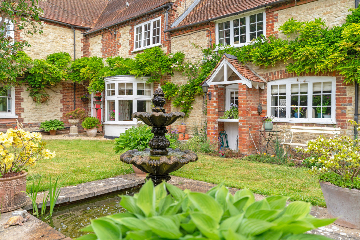 The Riverside House showcases Georgian charm with blue/red brickwork and stone sides. Set on a half-acre walled garden with a detached barn, two garages, and studio/office potential. Just a minutes walk from a scenic bend of the River Thames.