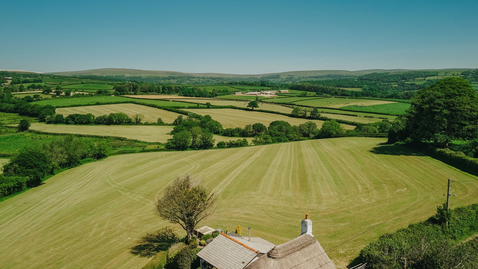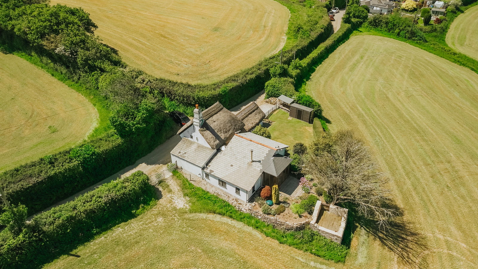 This delightful 16th Century thatched cottage boasts breathtaking panoramic views and features three bedrooms, two modern bathrooms, and a dedicated office space, along with two inviting reception rooms highlighted by feature fireplaces. This character home has fabulous country kitchen, complete with an Aga-style oven and a cozy breakfast area.