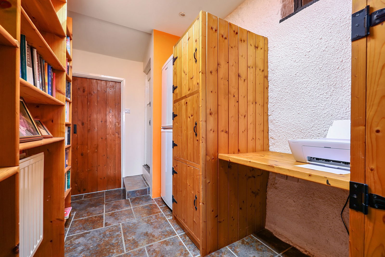 Step onto the ceramic-tiled hallway, which brilliantly serves dual purposes as a study and office space, complete with a dedicated pine wooden desk area, a cupboard, and charming bookshelves. This inviting hallway boasts doors leading out to the garden, into the spacious main sitting room, into the third smaller bedroom, the second double bedroom, the wet room, and a convenient entrance into the single garage/utility area. This area would make a perfect boot room area and ideal for those occupants with dogs.