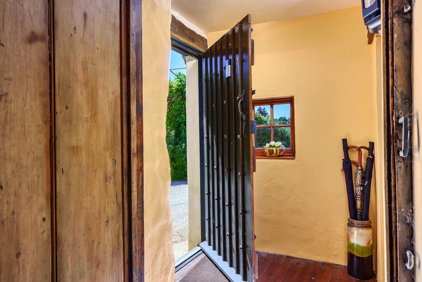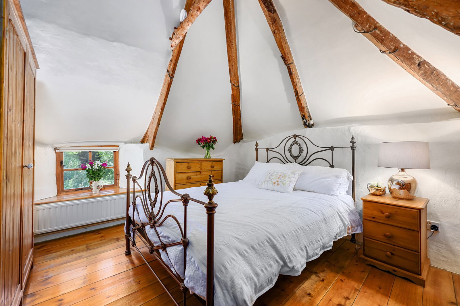 The principal bedroom is a true marvel, showcasing rare wigwam-style spaced upright ceiling beams, ancient curved walls, gorgeous wooden flooring, and a low-level window that beautifully frames the view of the lane.
