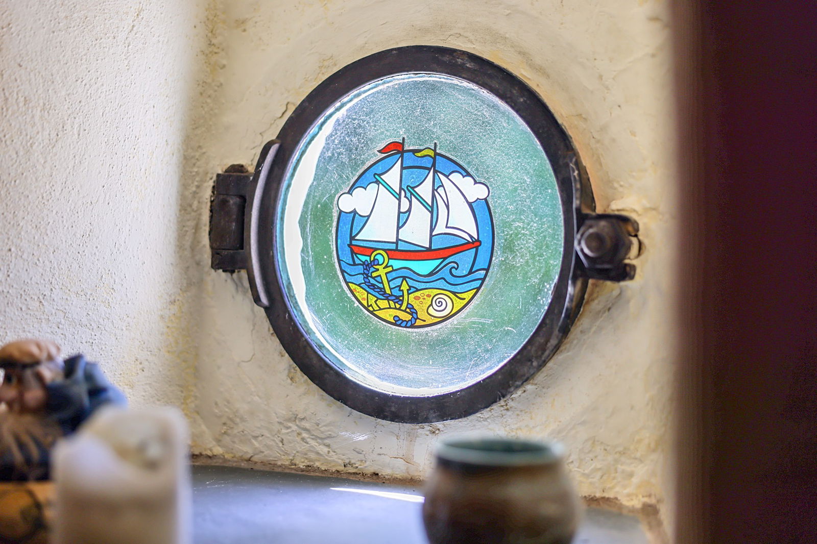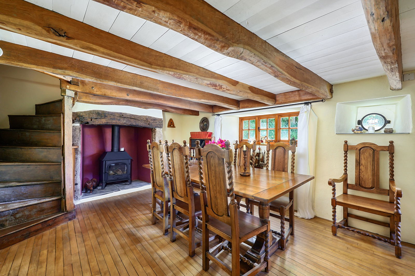 Within the charm of the original historical cottage is the dining room. This enchanting space brims with character, featuring a low beamed ceiling and a beautifully crafted timber beamed lintel above the striking fireplace. The fireplace, complete with a capped-off chimney, houses an appealing wrought iron wood burner, elegantly encased and resting on a slate-tiled base. The wooden floors are wonderful. You have to take a moment to admire the unique porthole window that provides a delightful view toward the lane, accentuated by a tall ship motif, possibly a nod to the local Ocean City of Plymouth with its incredible history of Sir Francis Drake and the Mayflower setting off to America.