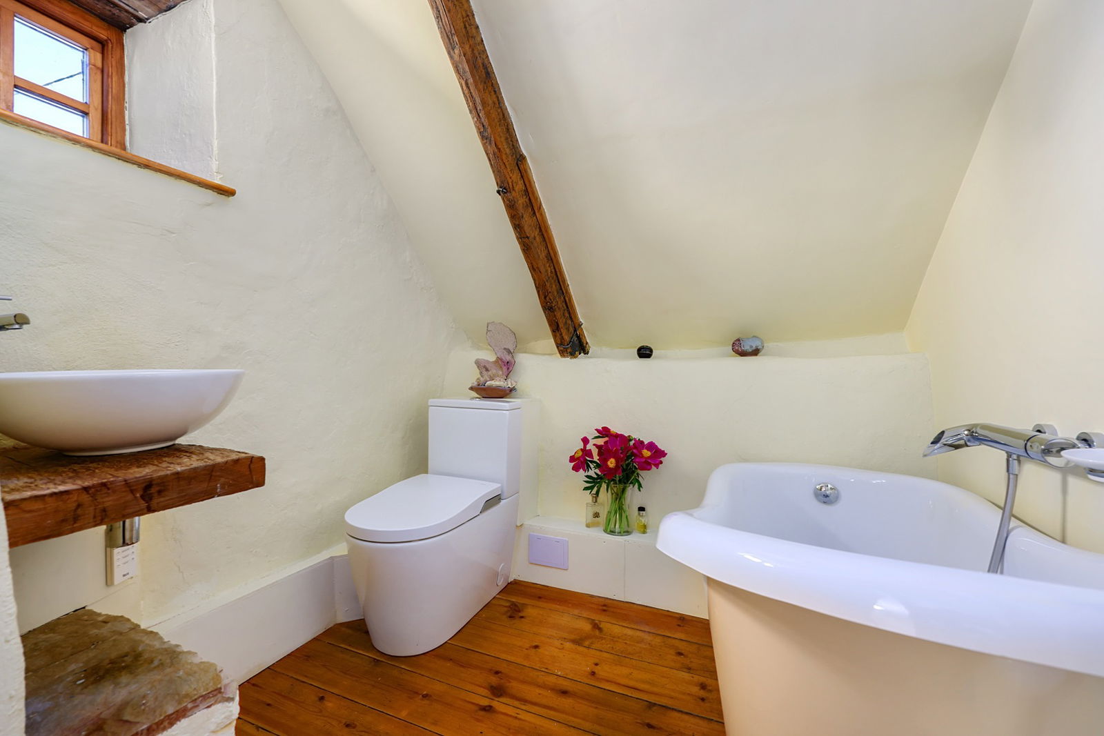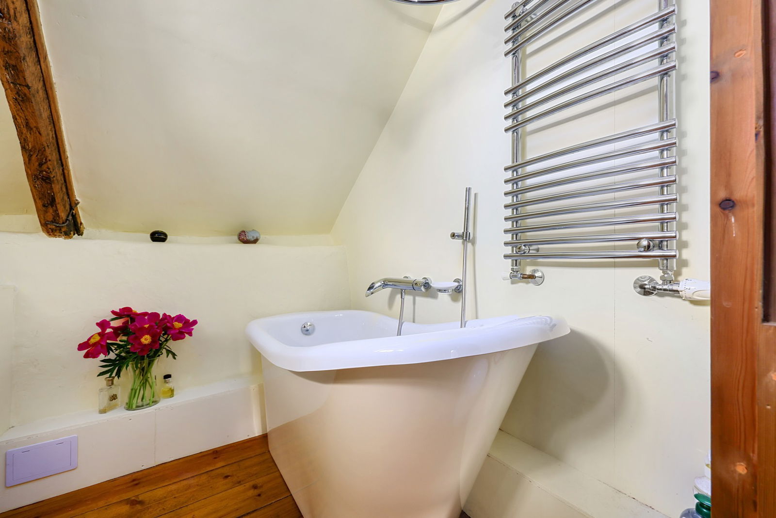 Ascend the lovely old curved wooden staircase to discover a landing that connects to the bathroom and principle bedroom. Here, you’ll find a luxurious white slipper-shaped bath complete with a shower overhead, a circular shower curtain, a white wash hand basin, and a toilet, all benefiting from a window overlooking the serene neighbouring field.