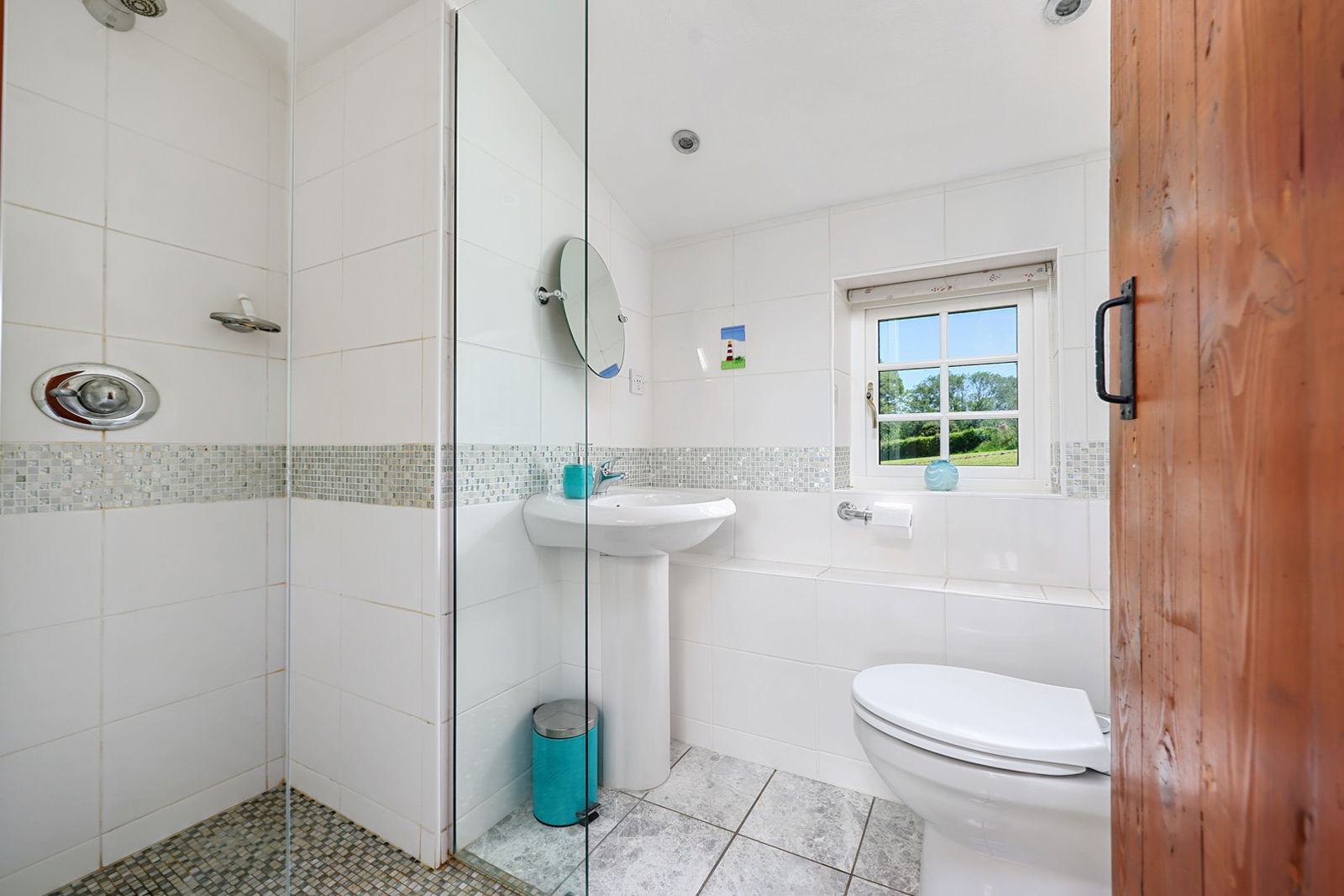 Right next door, the modern wet room awaits, featuring a sleek shower with glass panels, a pristine wash hand basin, and a white loo. The decor exudes elegance, with a white and grey palette complemented by the mosaic dado height tiling and marble ceramic-style flooring. Like every other room in this exceptional home, this bathroom is enhanced by a window that frames a spectacular country view.