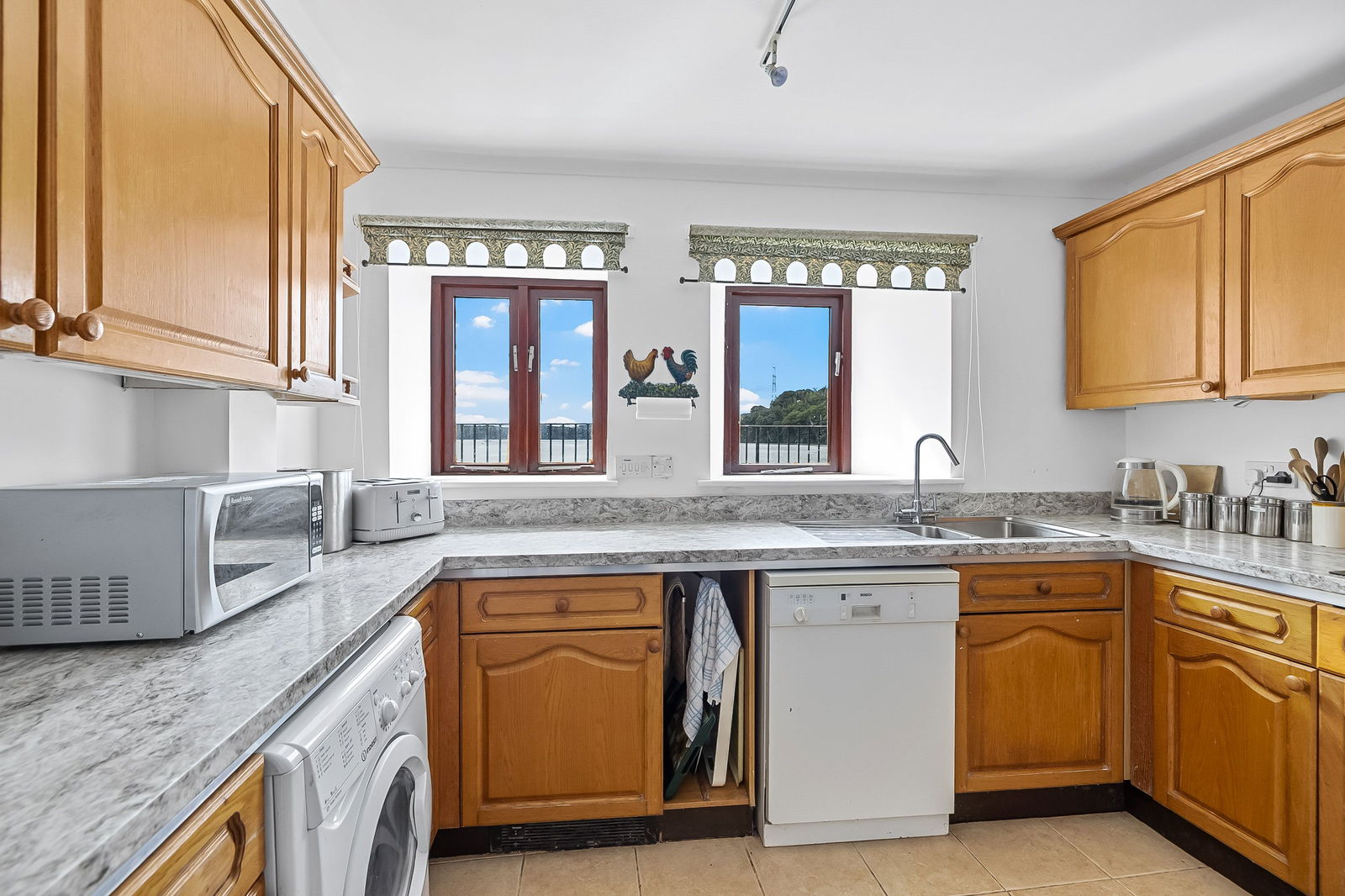 The gated driveway leads to a secure, covered parking area with additional storage space and an extra allocated space on the quay. From the welcoming entrance hall, the apartment unfolds into a spacious dual-aspect lounge/diner with wood-burning stove and private balcony overlooking the river, perfect for morning coffee or sunset evenings. The adjacent kitchen features a range of fitted units, double oven, and space for appliances.