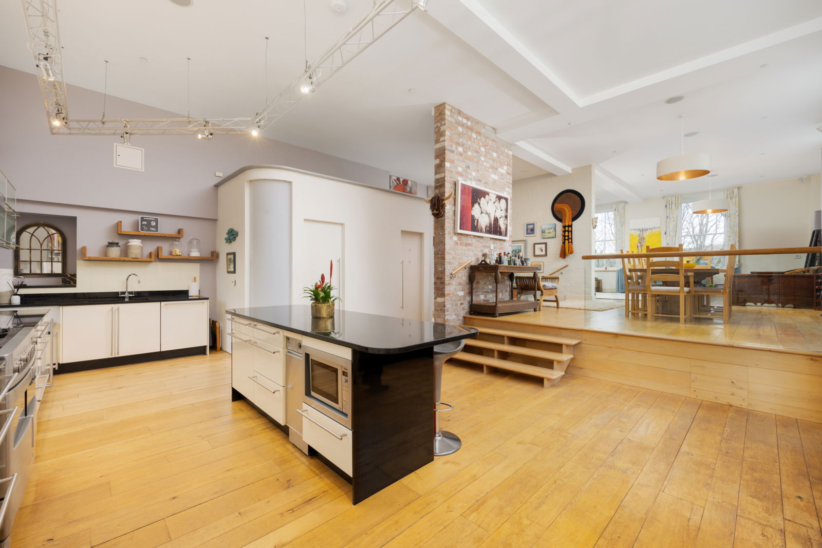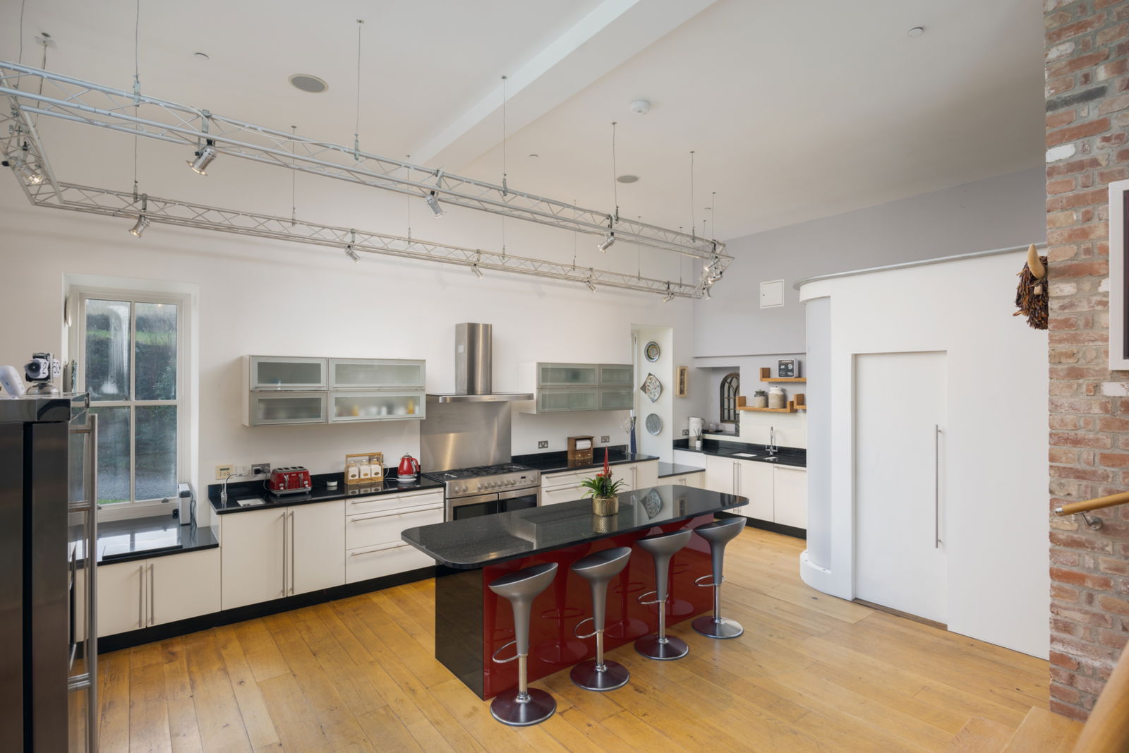 A charming brick-decorated archway beckons you into a vast modern kitchen, which boasts a second stylish pod that houses the laundry room and additional storage.
