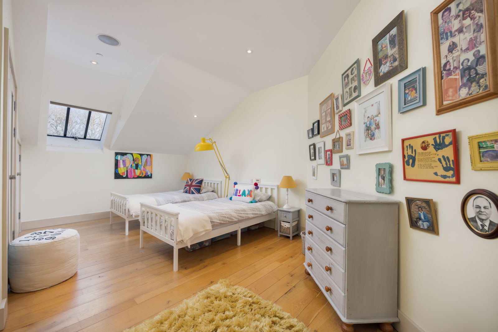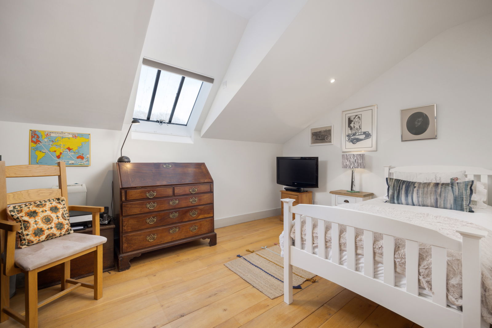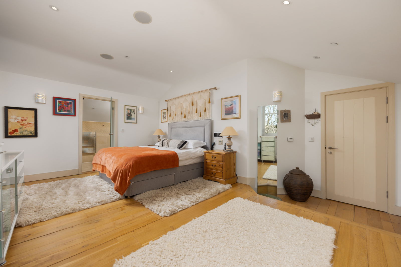 To the right and left, are two luxurious super king-sized double bedrooms. The right side this room boasts a generously sized south-facing window at the front and a west-facing skylight, filling the room with light. This suite includes a private completely fitted en-suite shower room.