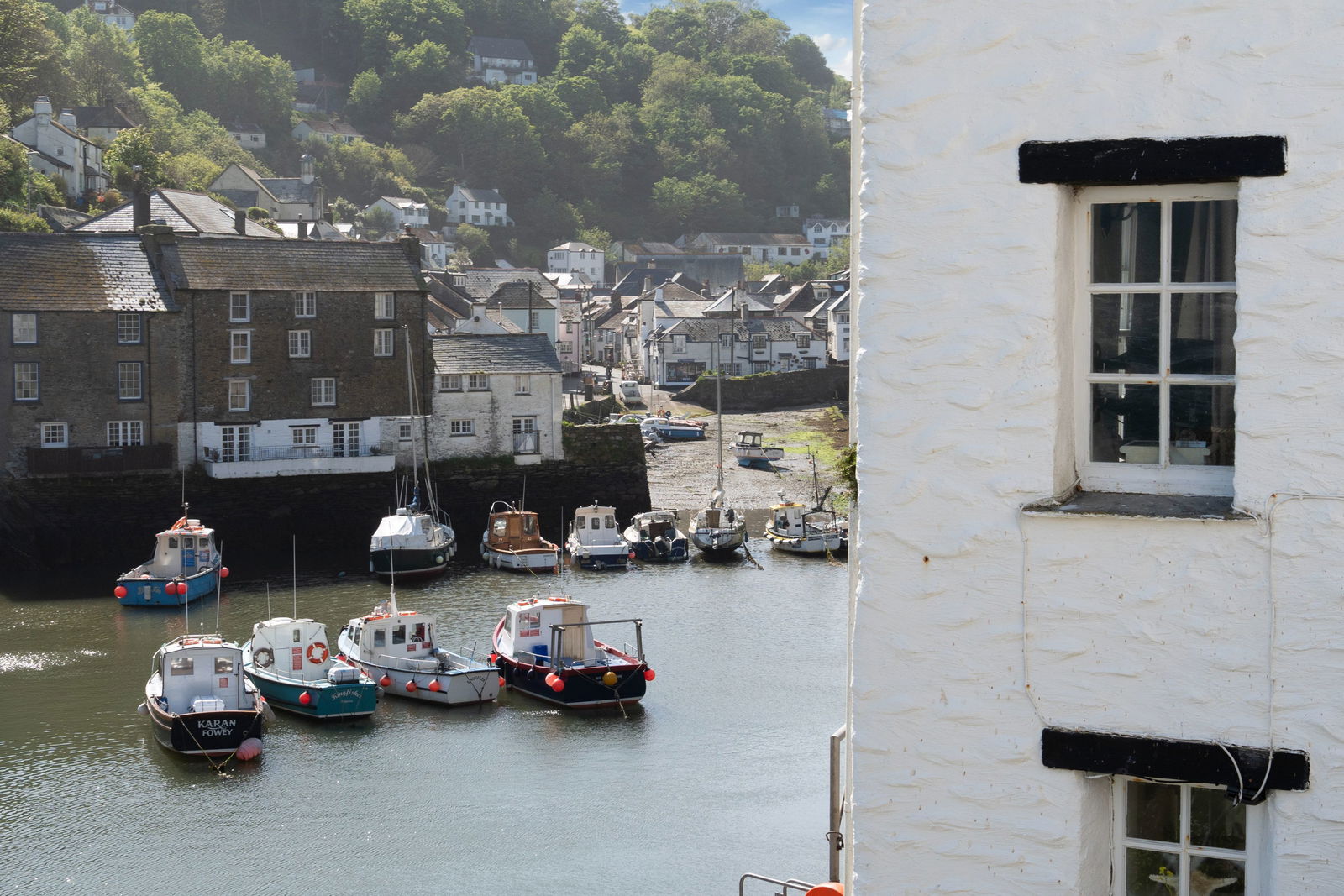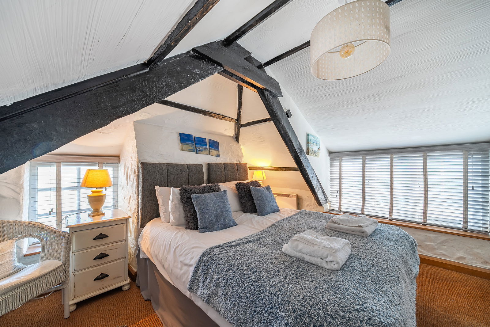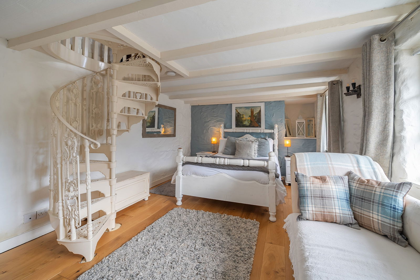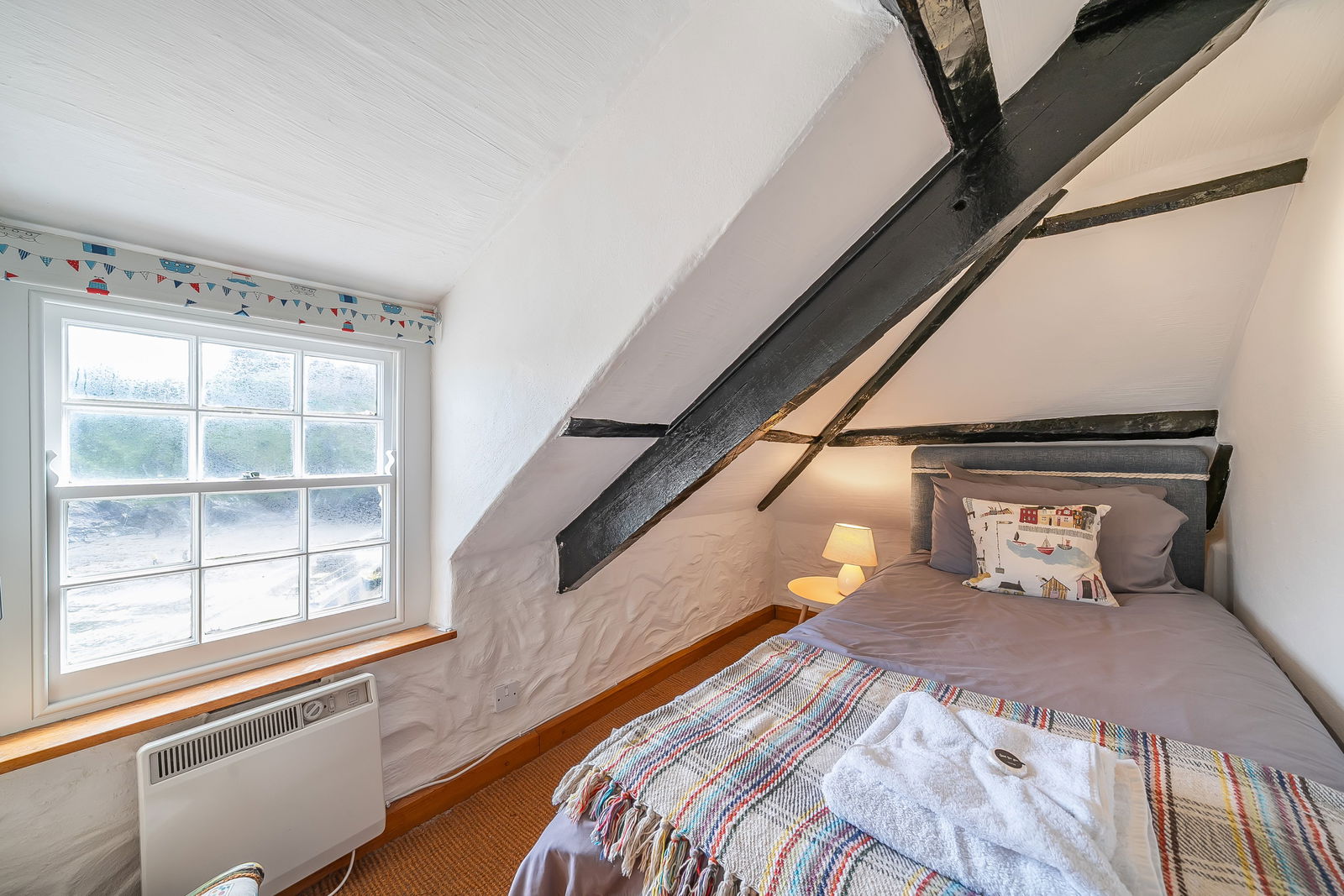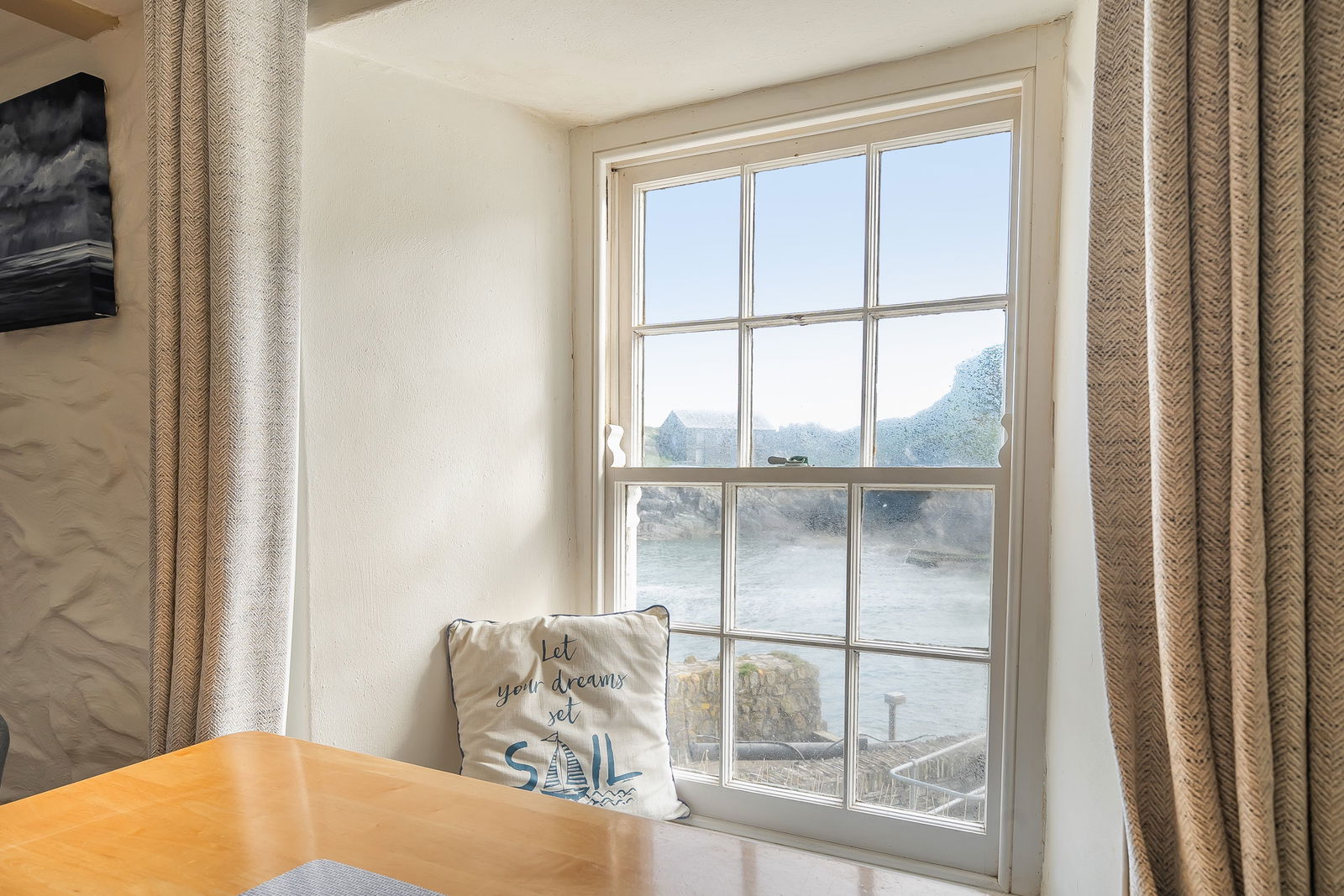 On the first floor, the principal bedroom offers a generous footprint with period detailing and peaceful harbour views, served by a stylish family bathroom. The top floor comprises two further double bedrooms—both enjoying elevated sea or village views—alongside a second bathroom, making it ideal for families or guests.