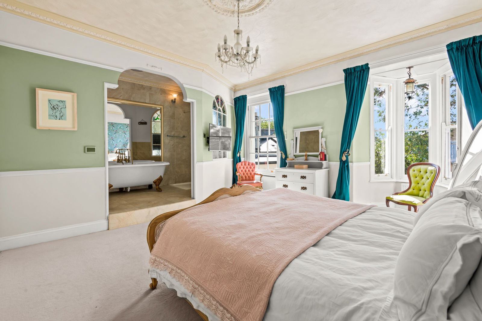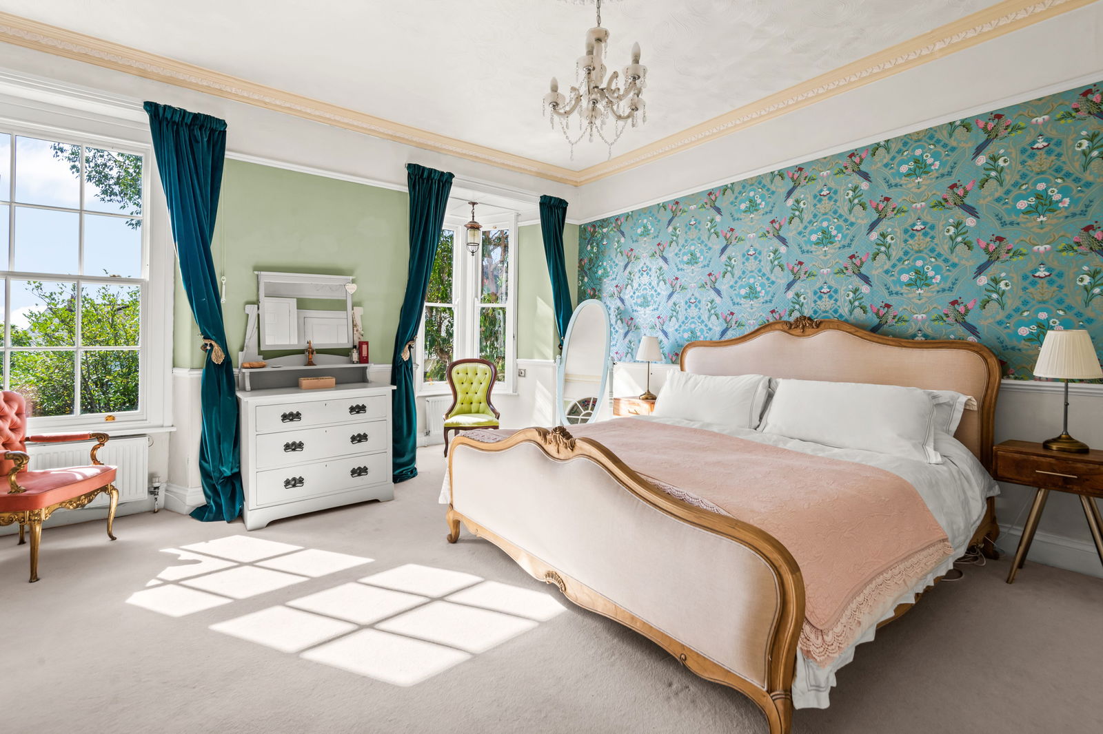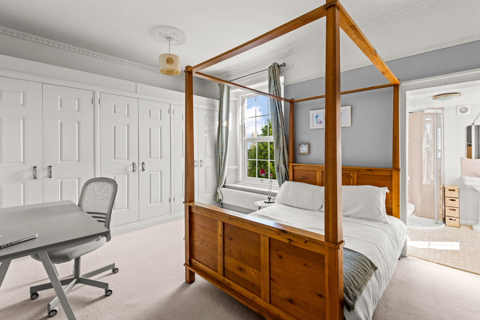 Upstairs, the principal suite is a true sanctuary, showcasing a striking bay oriel window and a beautifully appointed en-suite bathroom. Three further double bedrooms are offered, one with its own en-suite shower room, and the other two sharing a Jack and Jill suite, all finished to a high standard. Period features such as ornate plasterwork, original fireplaces, and large sash windows are found throughout, flooding the interiors with natural light and enhancing the sense of grandeur.