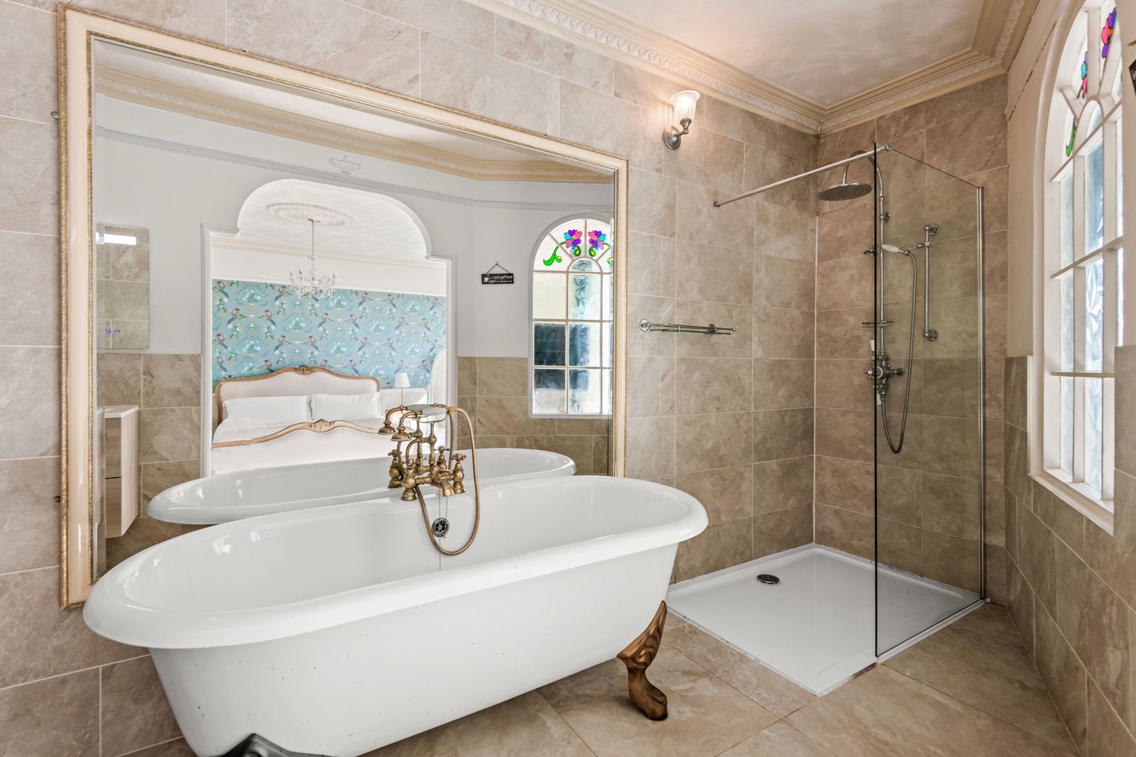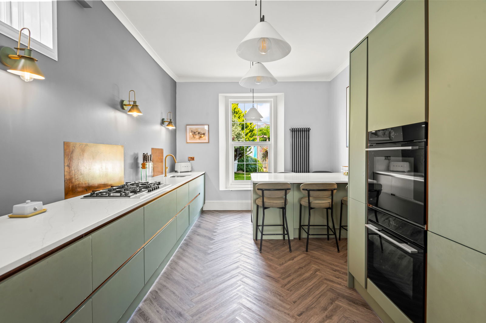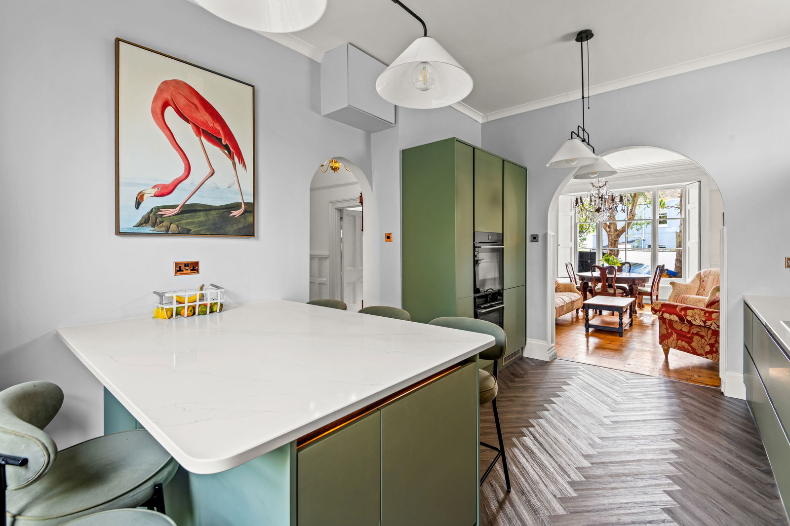 Upstairs, the principal suite is a true sanctuary, showcasing a striking bay oriel window and a beautifully appointed en-suite bathroom. Three further double bedrooms are offered, one with its own en-suite shower room, and the other two sharing a Jack and Jill suite, all finished to a high standard. Period features such as ornate plasterwork, original fireplaces, and large sash windows are found throughout, flooding the interiors with natural light and enhancing the sense of grandeur.