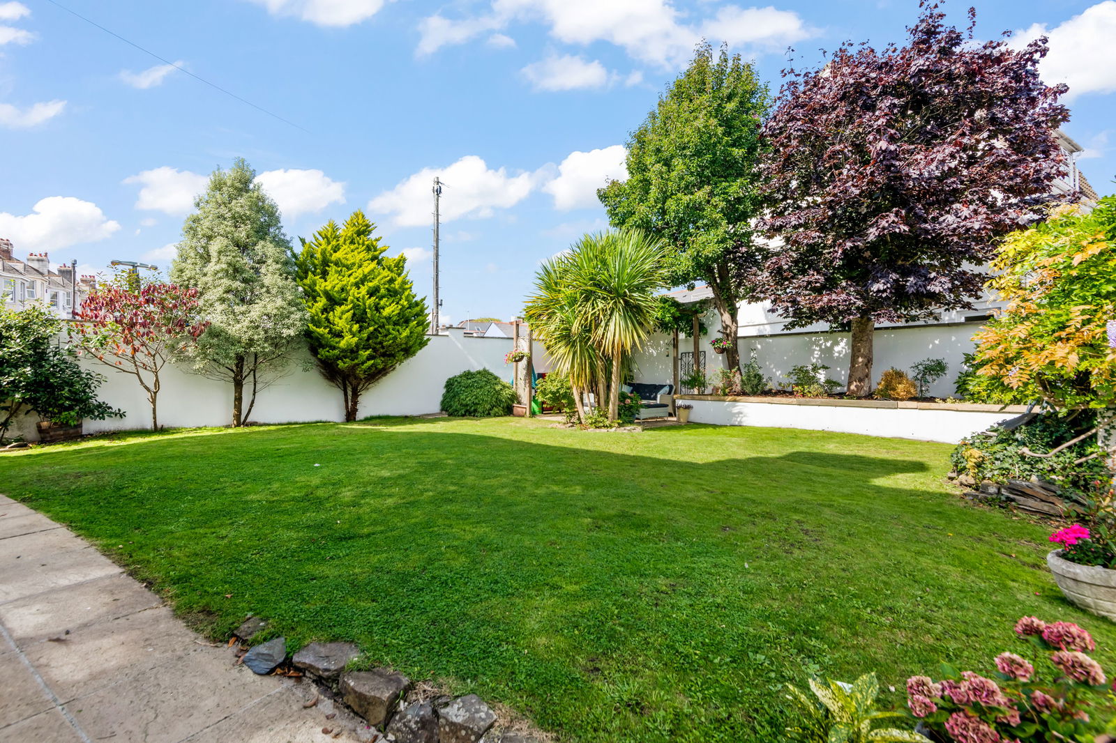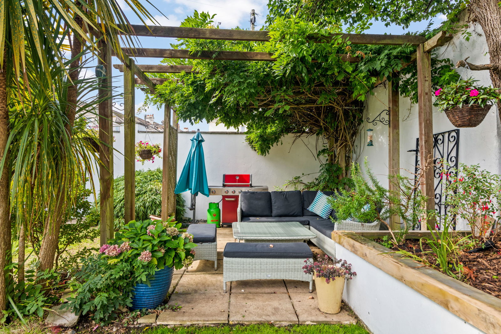 The property sits within secluded walled gardens, approached via double gates opening to a level driveway and a detached double garage with electric door. The gardens are landscaped with lawns, established beds, and mature trees, providing both beauty and privacy. A south-facing paved terrace, framed by a wisteria-clad pergola, creates the perfect setting for al fresco dining and summer entertaining.