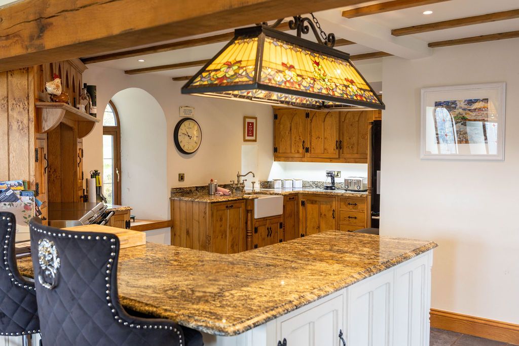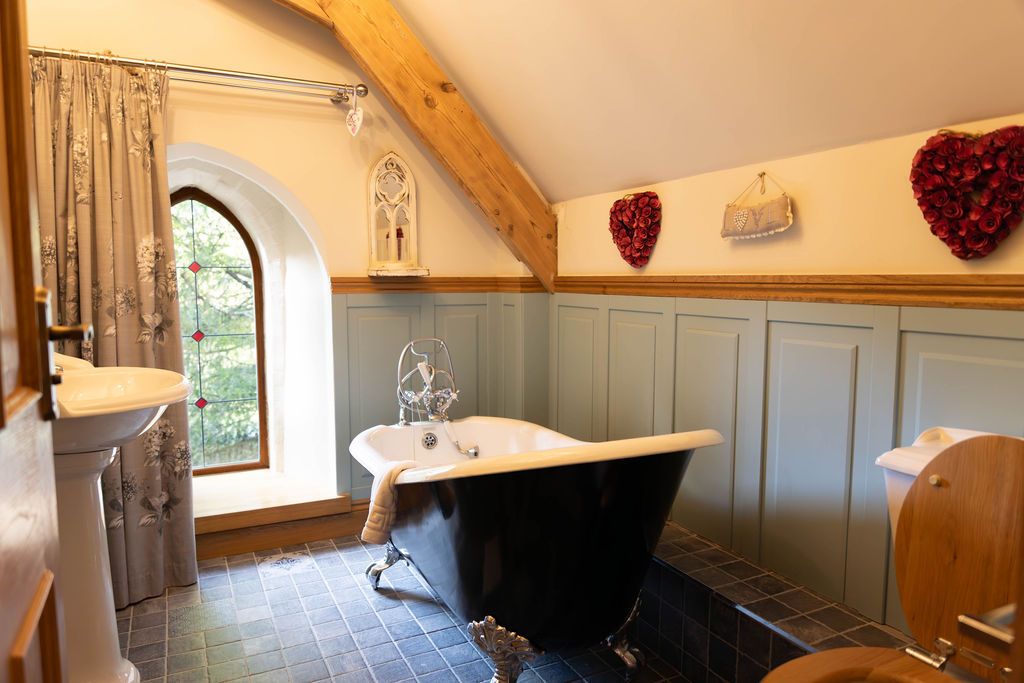 The original staircase leads to the ground floor, where a grand sitting room showcases high ceilings, exposed granite, and large windows, creating an elegant and inviting space. Along the hallway are two double bedrooms and a family shower room. At the end of the hallway, an original church door opens to the front of the property. Adding to its charm, the house even features a working church bell, which you’re welcome to try when you visit!
