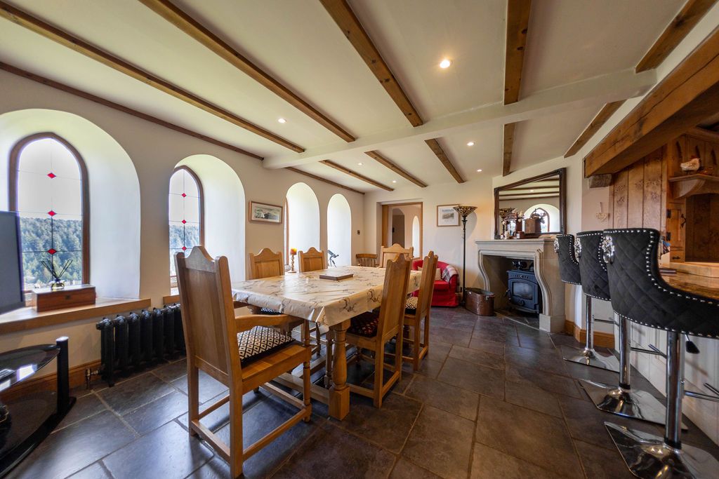 On the lower ground floor, the spacious kitchen/dining room offers ample space for entertaining, with stunning valley views, a wood burner, and original features such as exposed beams and granite window surrounds. This level also includes a plant room, W.C., and a handy boot room.