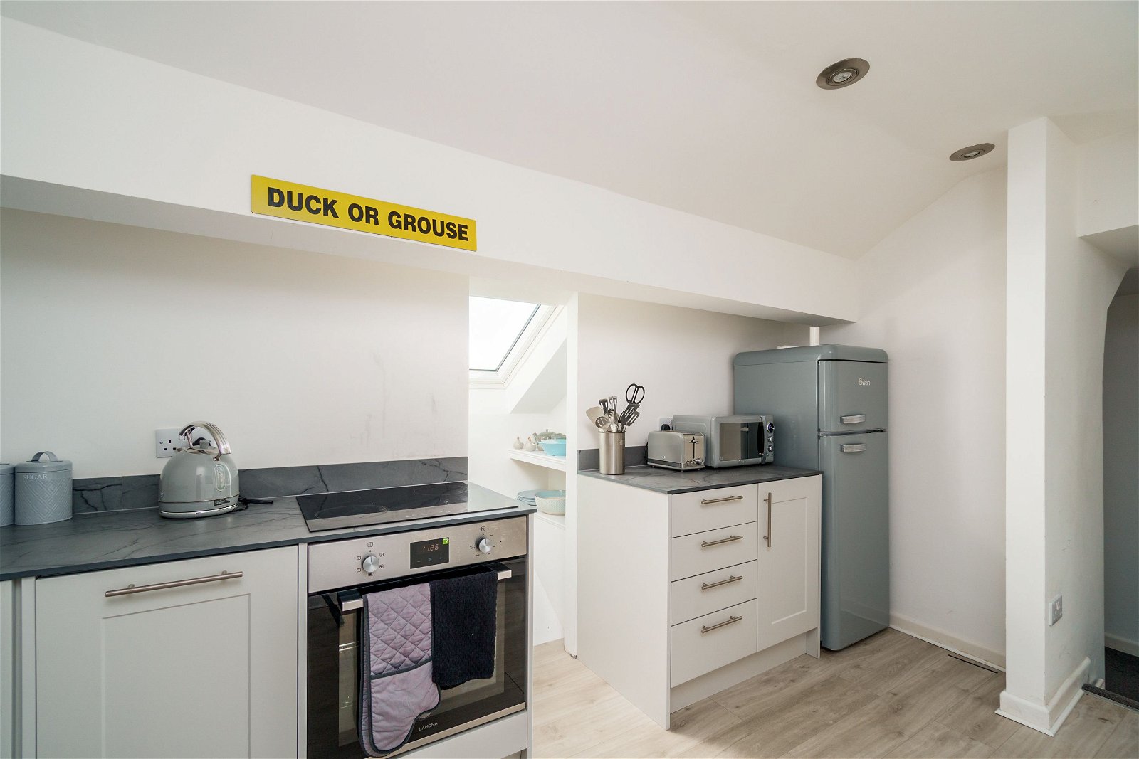 The kitchen is a contemporary space with an integrated oven, four-ring electric hob, plenty of storage within its modern units, and space for appliances. Natural light pours in through a skylight window in a vaulted ceiling, creating a bright and airy ambience prevalent throughout the entire property.