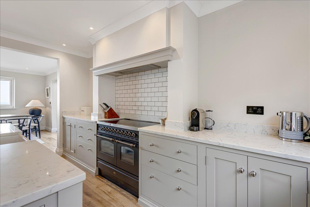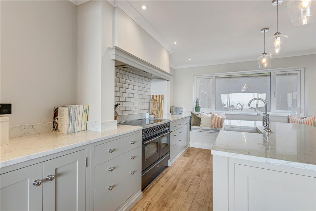 A stunning triple-aspect space with solid wood units, 5 burner electric range cooker and high end appliances. The large dining space, substantial kitchen island and inbuilt bench seating make this an ideal space for both entertaining and family life.