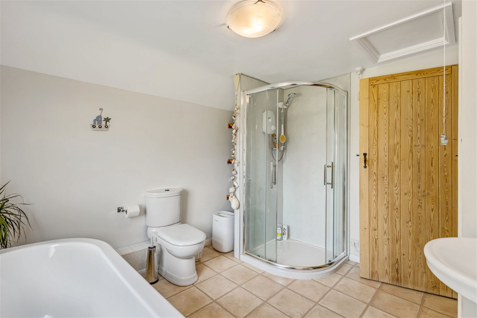 Upstairs, you'll find the master bedroom with dual-aspect windows, offering plenty of natural light and stunning views. There are three additional double bedrooms and a single bedroom, also all with wonderful views of the surrounding countryside. The bathroom features a charming clawfoot bath, a separate shower cubicle, and a WC.