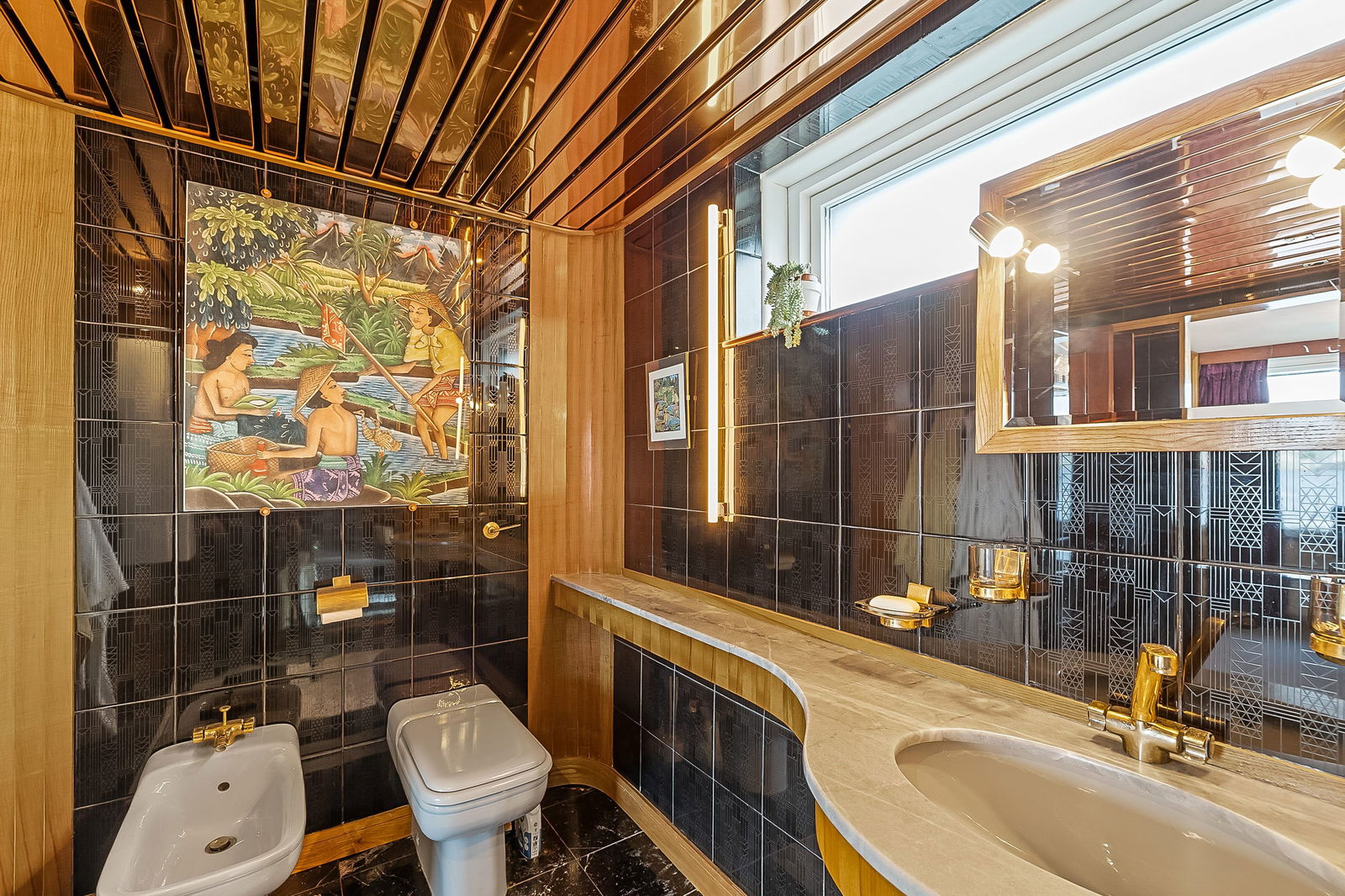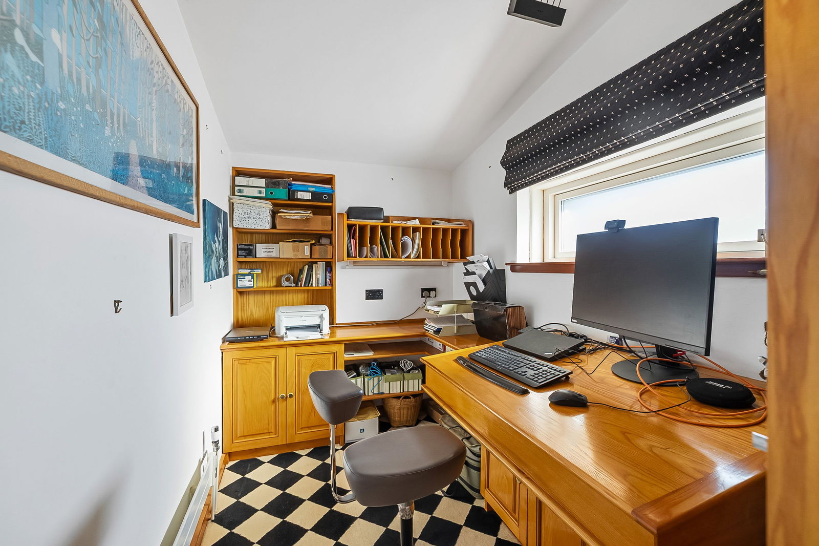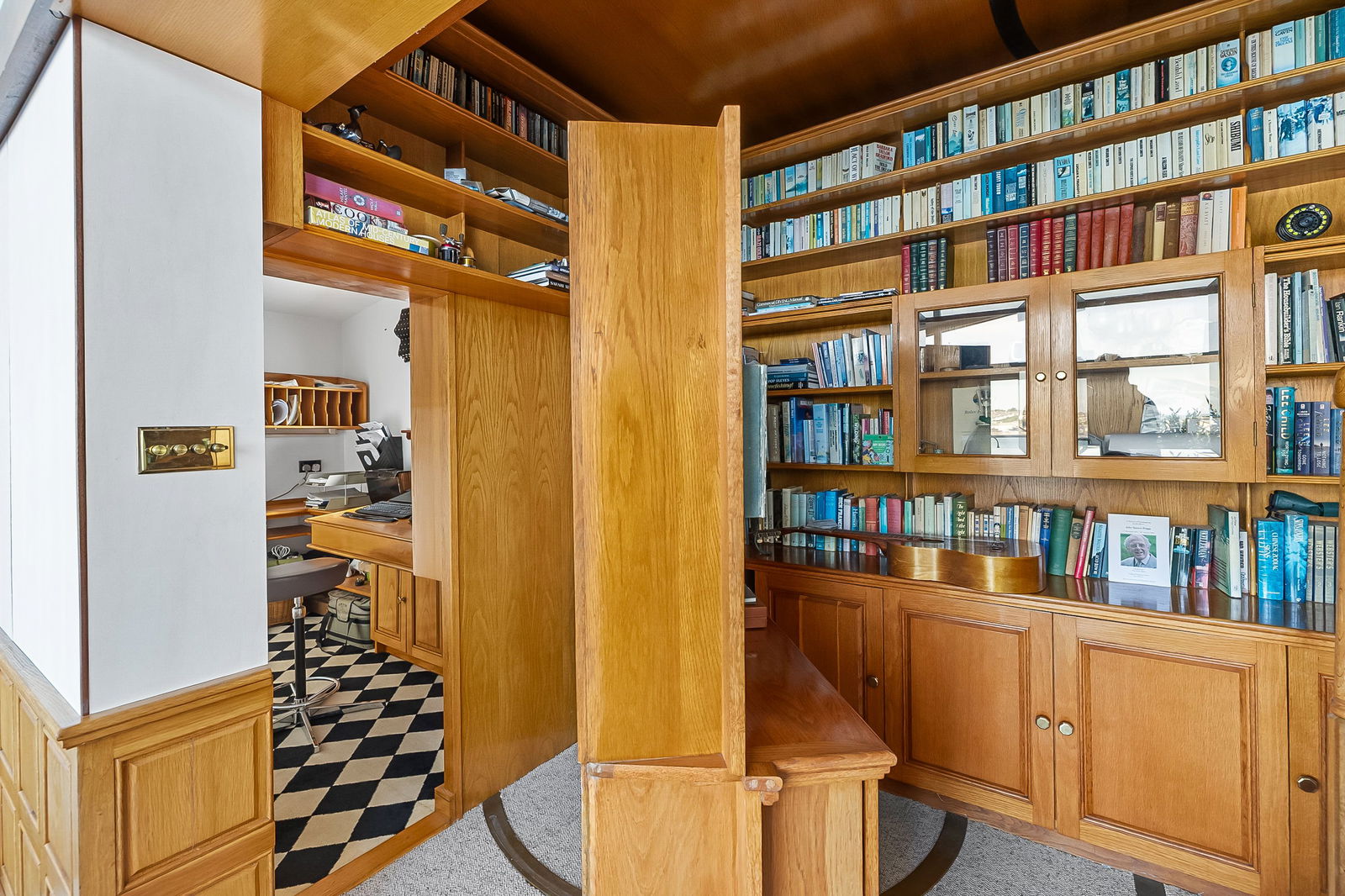 Adjacent is the main sitting room, a bright and spacious retreat with its own access to the balcony, wood burner and scenic outlook. A dedicated library offers a cosy reading nook or work-from-home space, while hidden secret office behind electrically operated bookcase door adds flexibility for those needing a private office or hobby room.