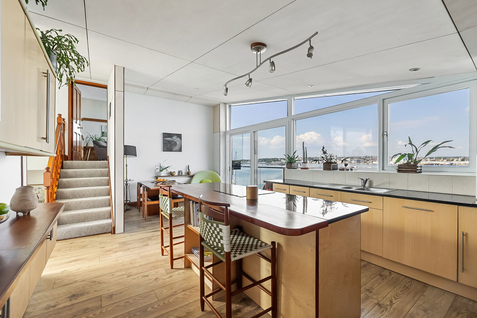 The main living levels form the vibrant heart of the home. A grand entrance hallway leads into an expansive open-plan kitchen and dining room, flooded with natural light from large glazed doors that open directly onto a wide balcony terrace. Here, you can enjoy uninterrupted views across the river—an ideal backdrop for entertaining or relaxing outdoors.