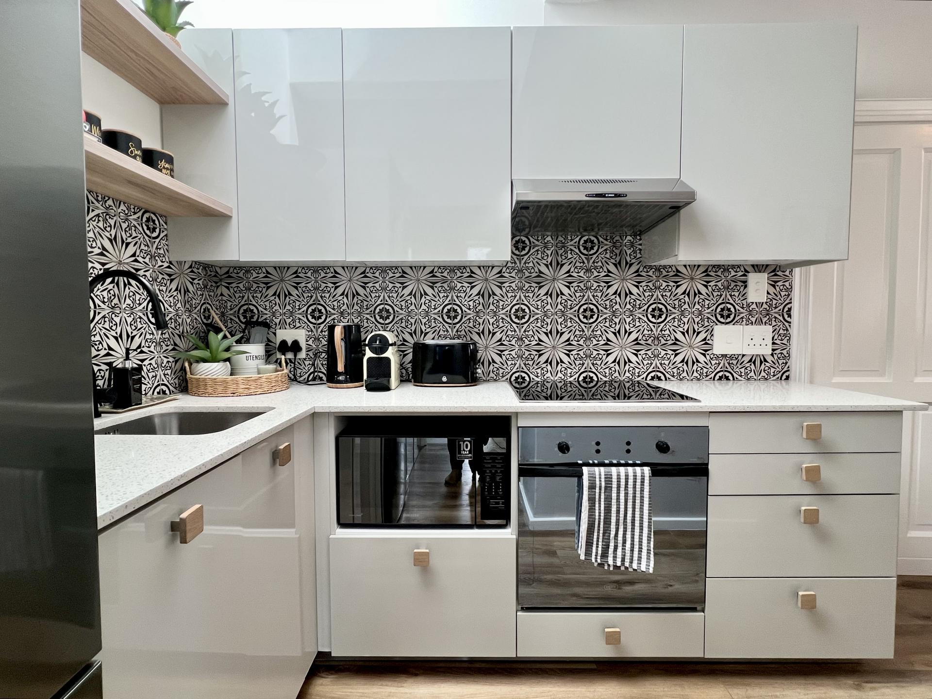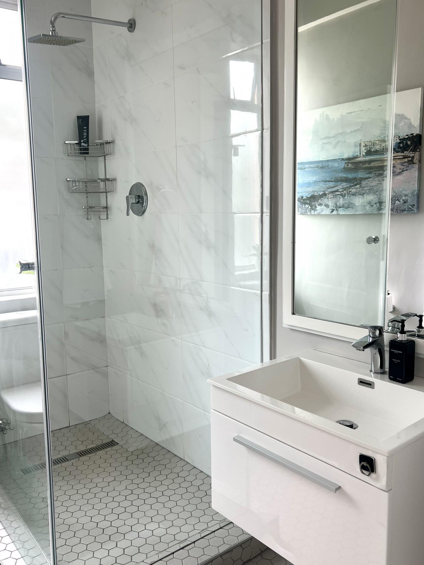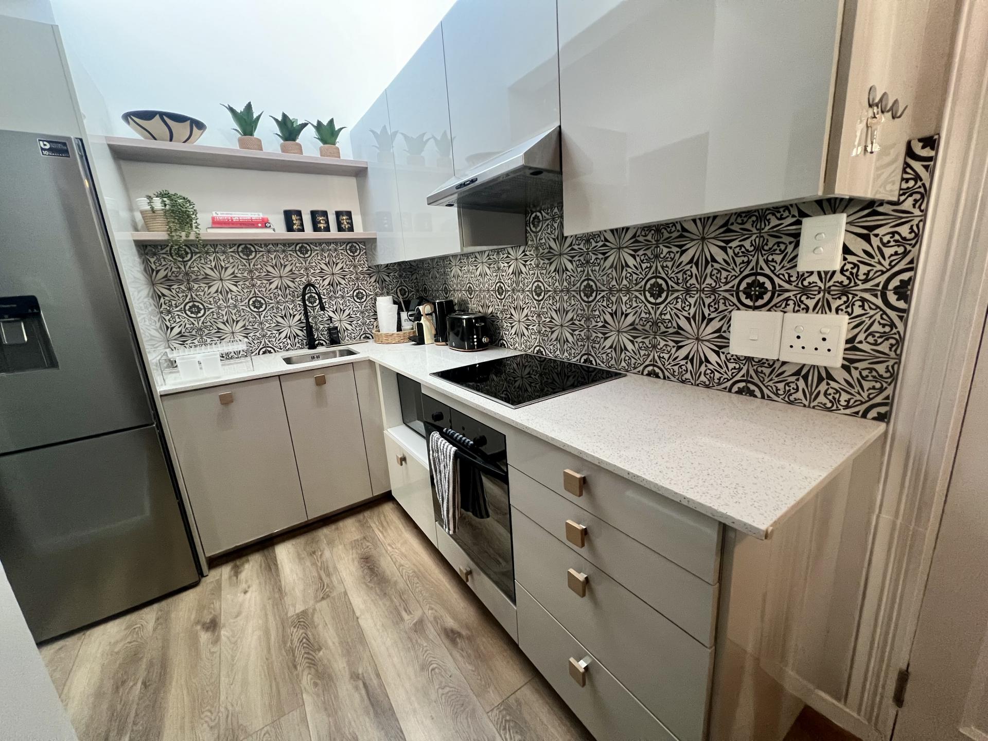 The sleek, skylit kitchen is equipped with premium appliances and comes fully stocked with crockery, cutlery, and essentials—ideal for effortless daily living. The spacious bedroom is a serene retreat. The gorgeous bathroom, with shower, adds to the peaceful ambience.