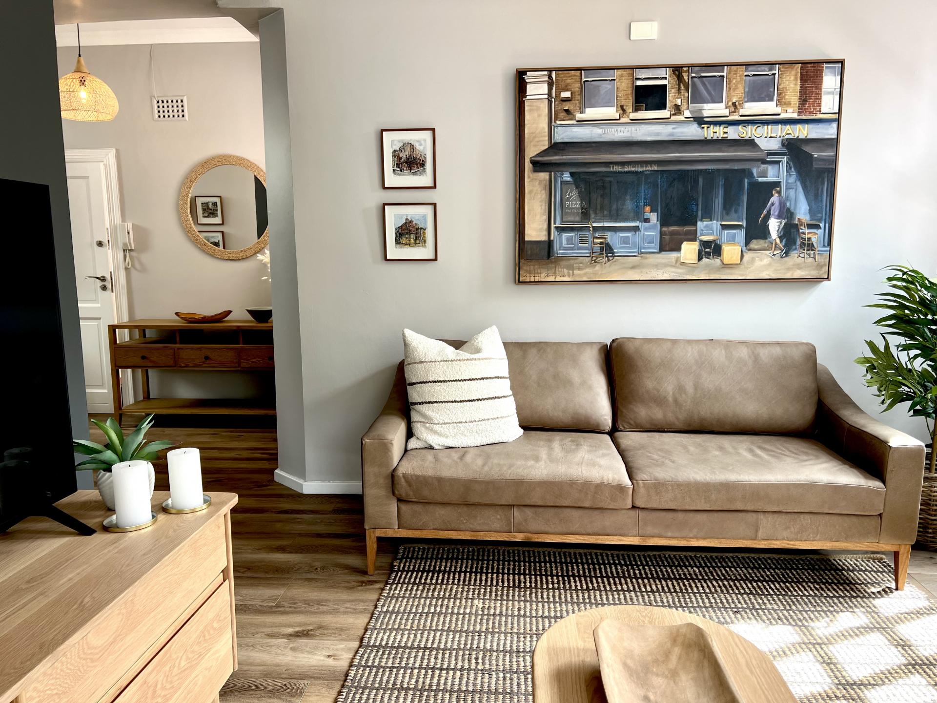 Thoughtfully furnished with an earthy, contemporary palette, the apartment features warm, wood vinyl flooring, high ceilings, and bespoke finishes throughout. Welcoming entrance and inviting, light-filled living area opening to a small balcony and adjoining the mountain-facing, open plan dining area.