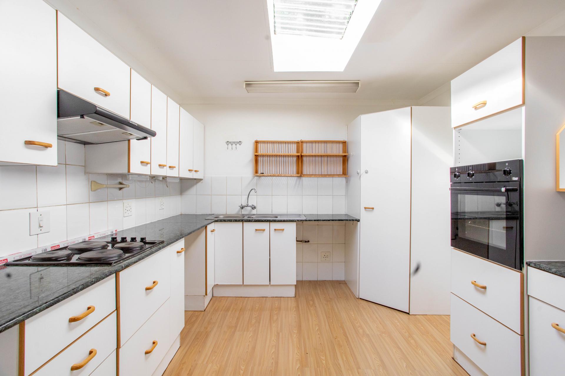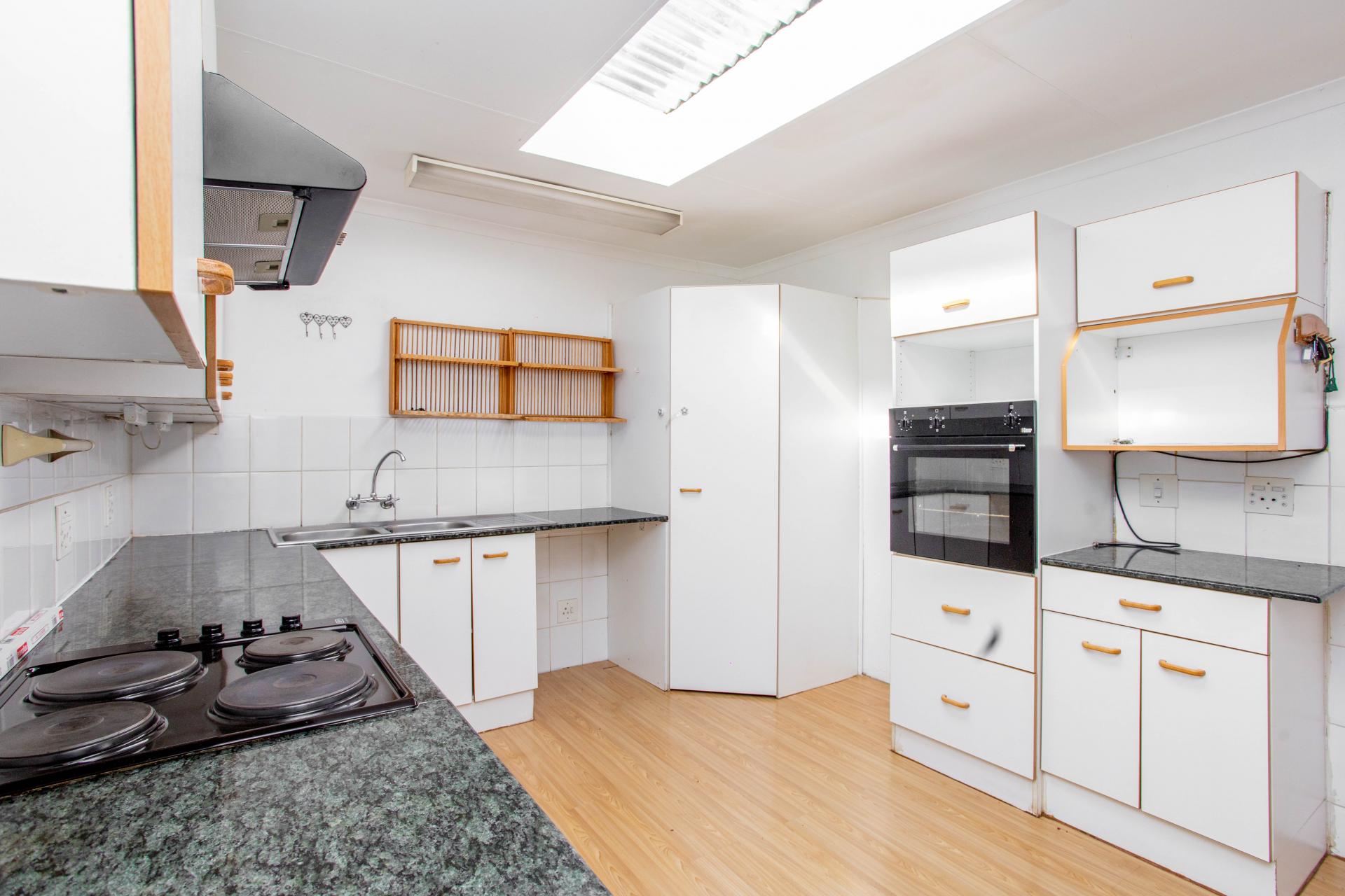 This home features an open-plan living and dining room with wooden flooring, and a wood-burning fireplace. The kitchen is equipped with an electric hob and oven, ample cupboard space, and room for a fridge and appliances.