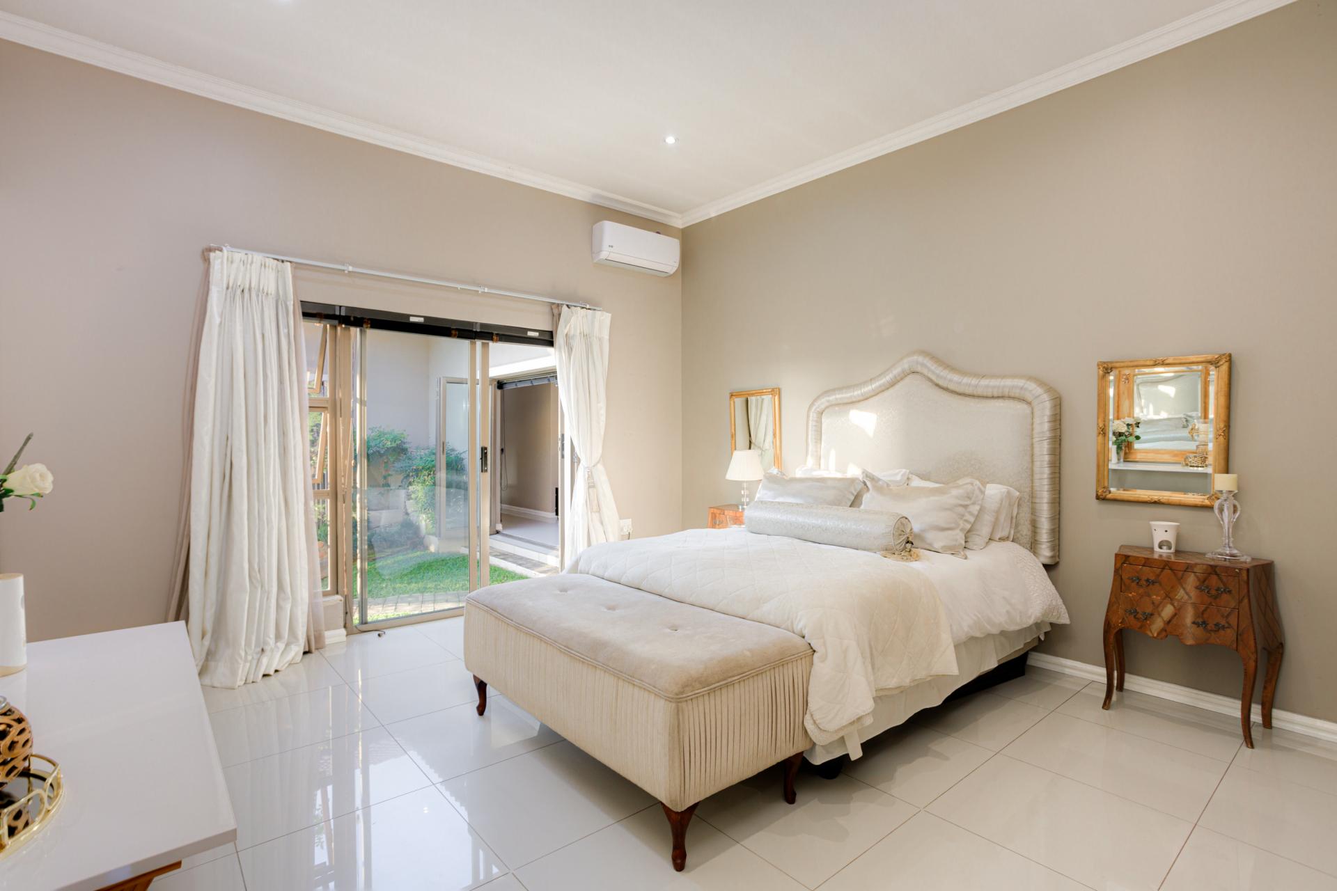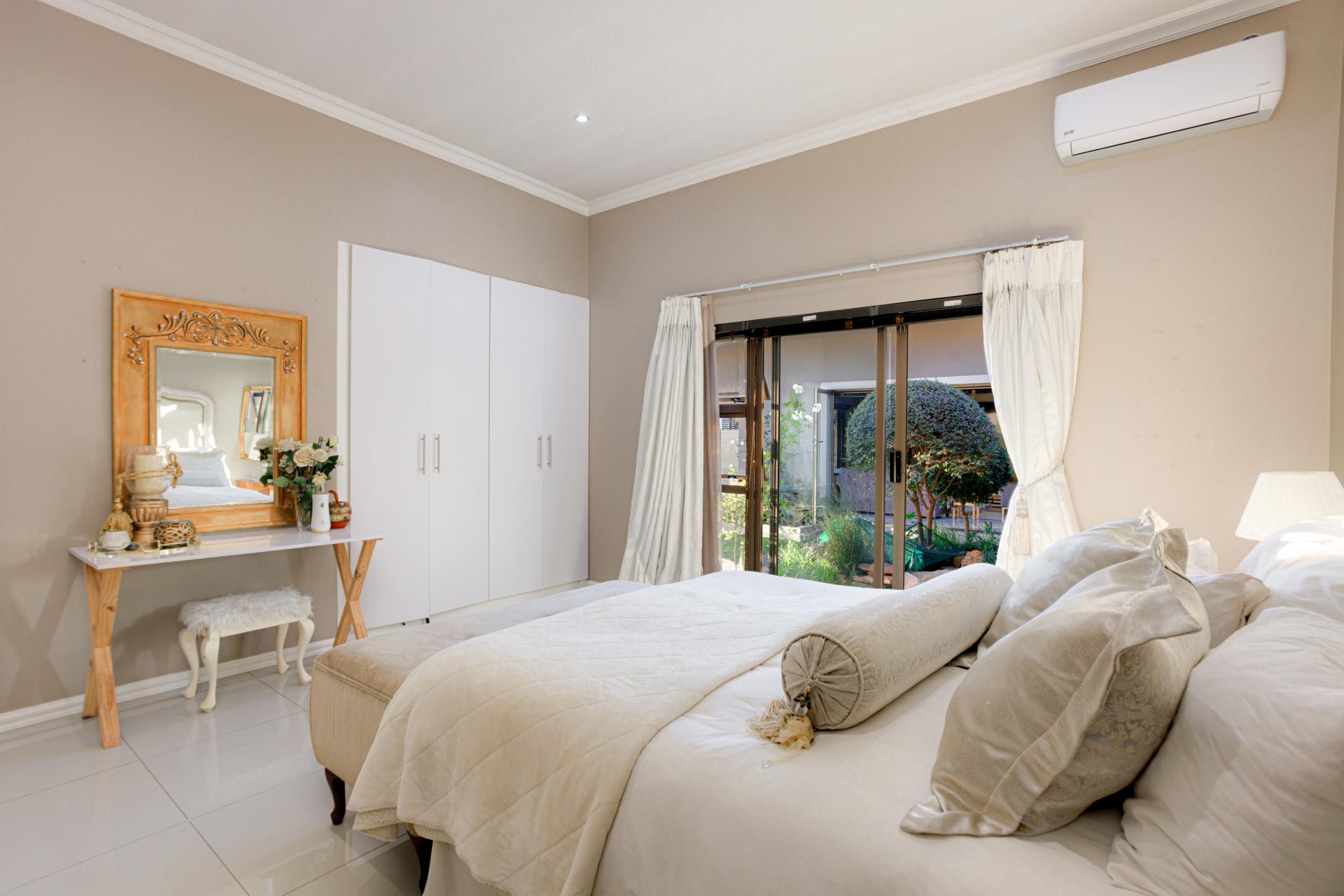 The home offers three generously sized bedrooms with air conditioning and direct garden access. The luxurious master suite includes a walk-in closet and a full en-suite bathroom with a double vanity and shower. A second full bathroom serves the additional bedrooms.