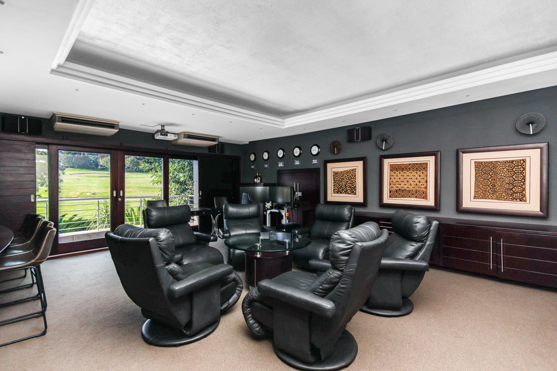 • Versatile Entertainment Room: A sweeping glass staircase leads to the fully equipped cinema/entertainment room with surround sound, projector, and lounge seating — adaptable as a meeting or work-from-home space thanks to the included desk and kitchenette.