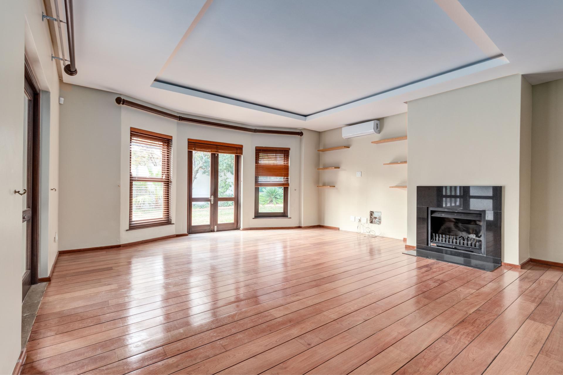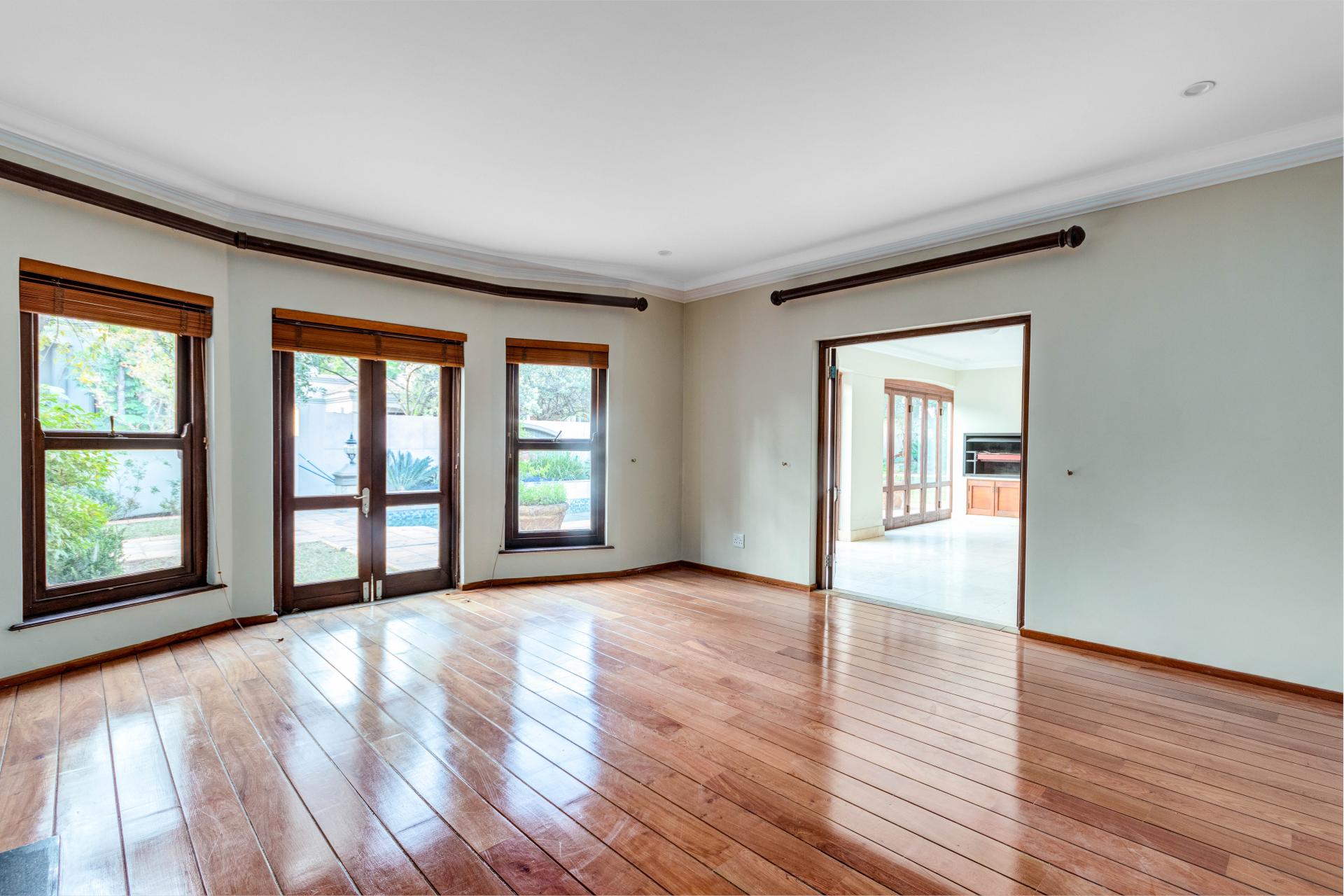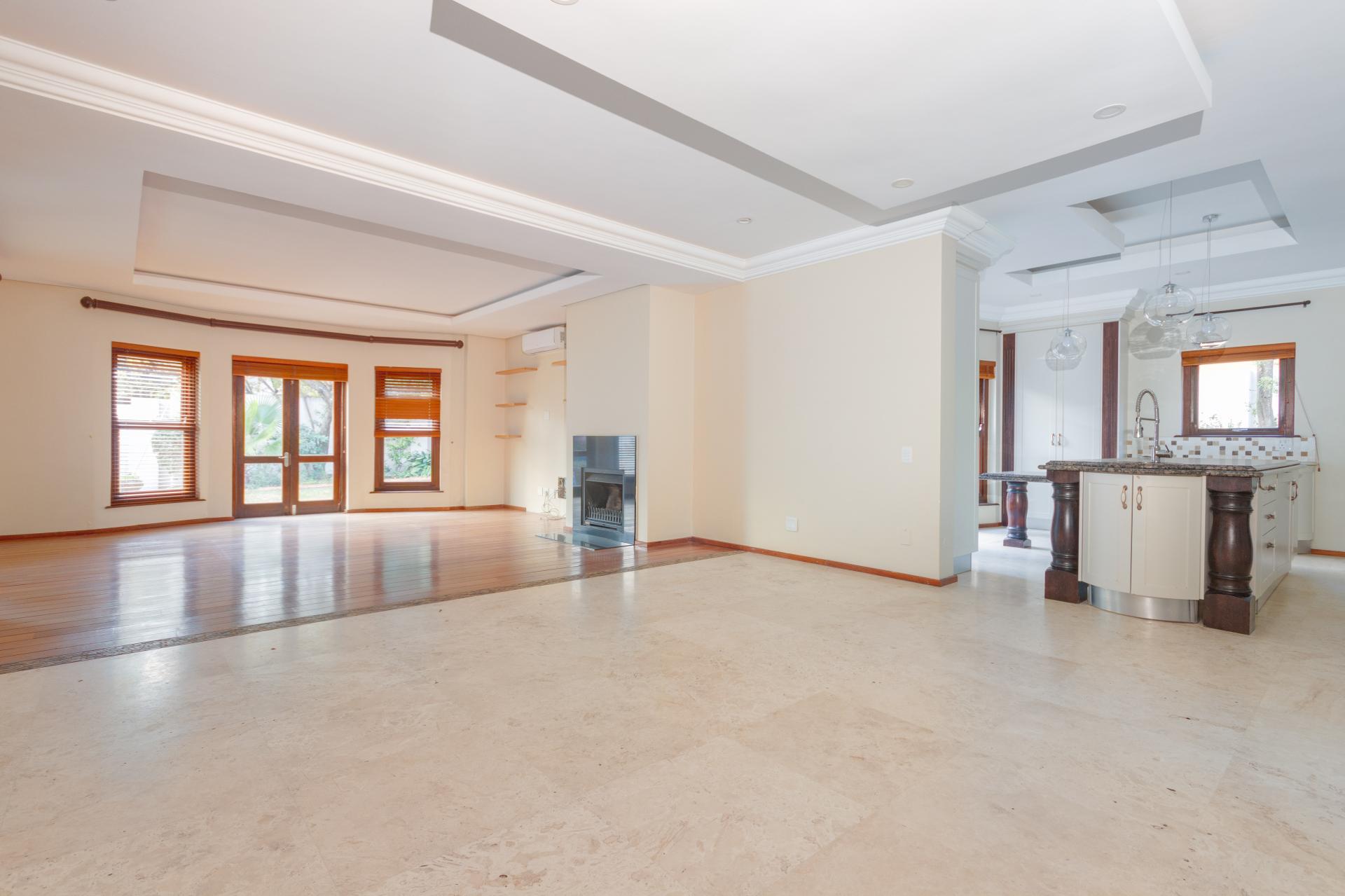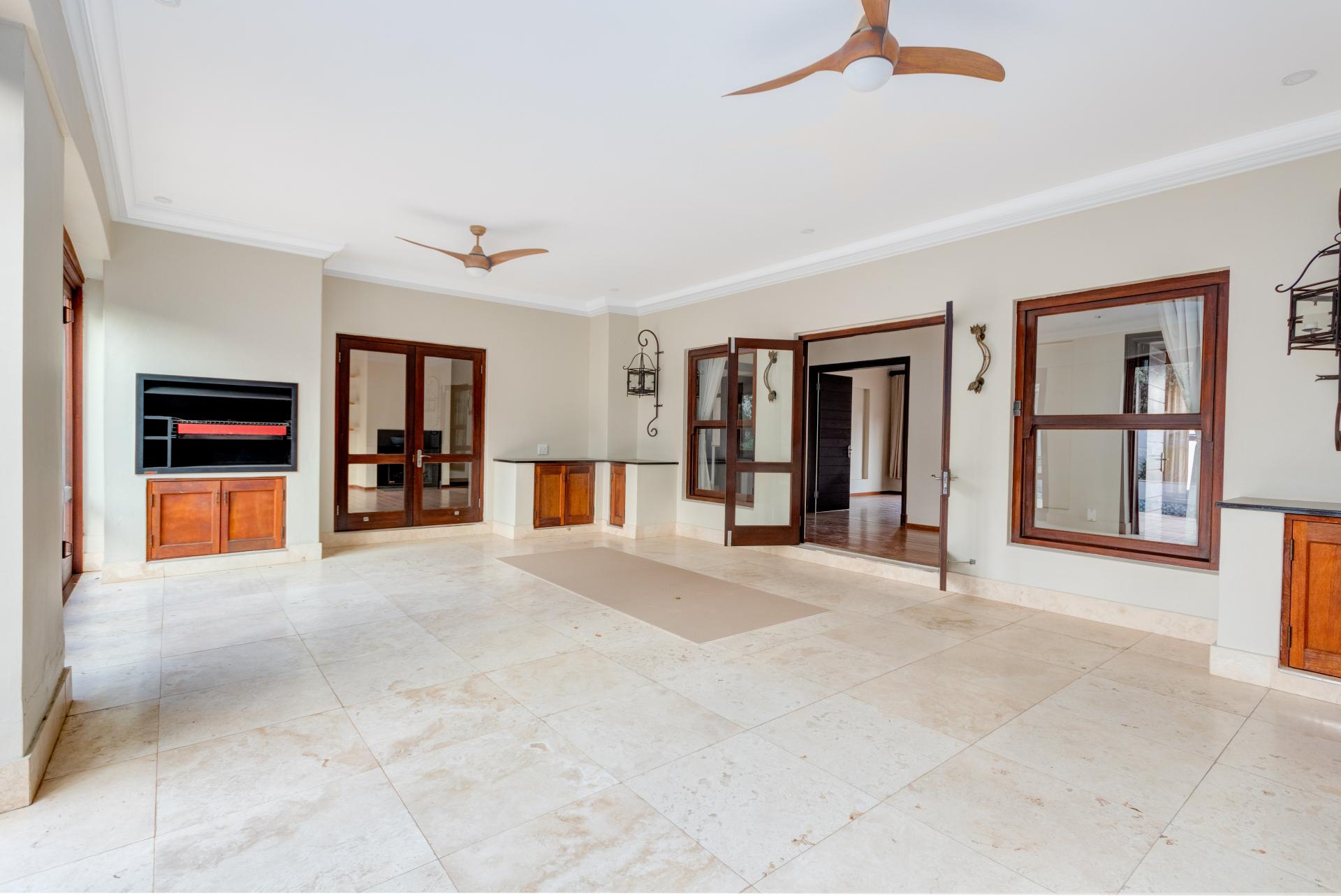 The north-facing ground floor boasts expansive reception areas with elegant solid wood flooring. An indoor/outdoor patio, ideal for casual gatherings, is equipped with a built-in braai, ceiling fans, and stack-back doors that seamlessly blend indoor and outdoor spaces, providing ample room for dining and lounging.