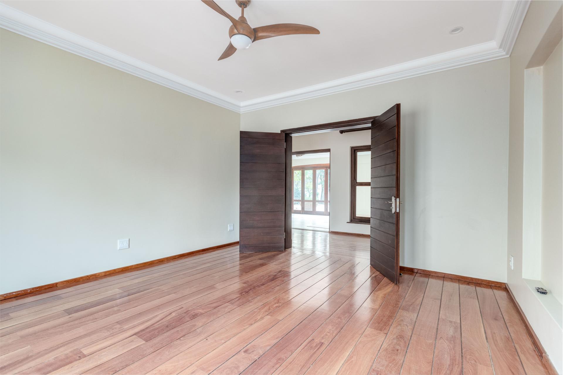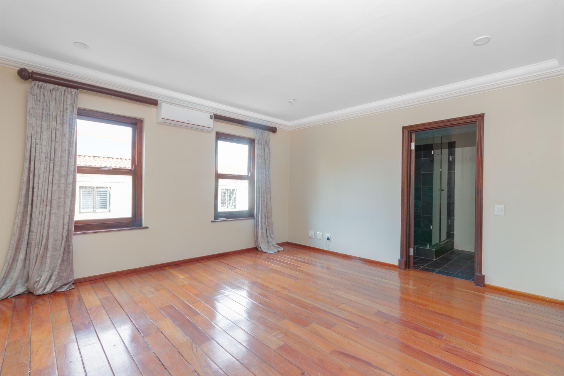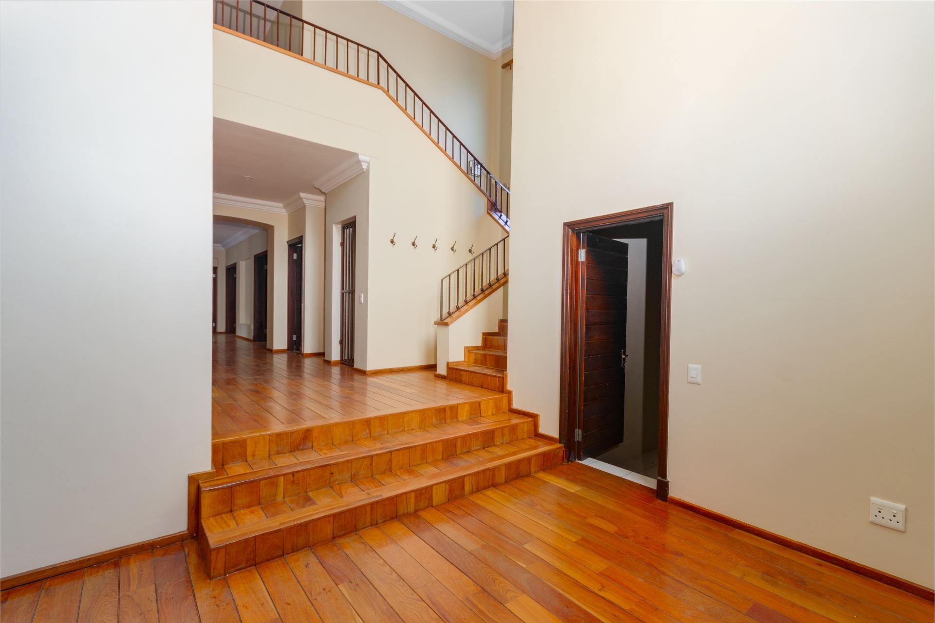 The north-facing ground floor boasts expansive reception areas with elegant solid wood flooring. An indoor/outdoor patio, ideal for casual gatherings, is equipped with a built-in braai, ceiling fans, and stack-back doors that seamlessly blend indoor and outdoor spaces, providing ample room for dining and lounging.