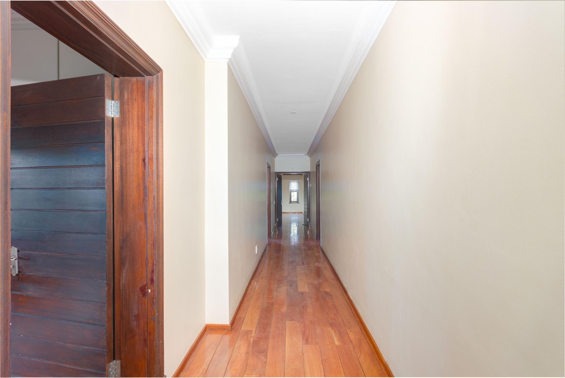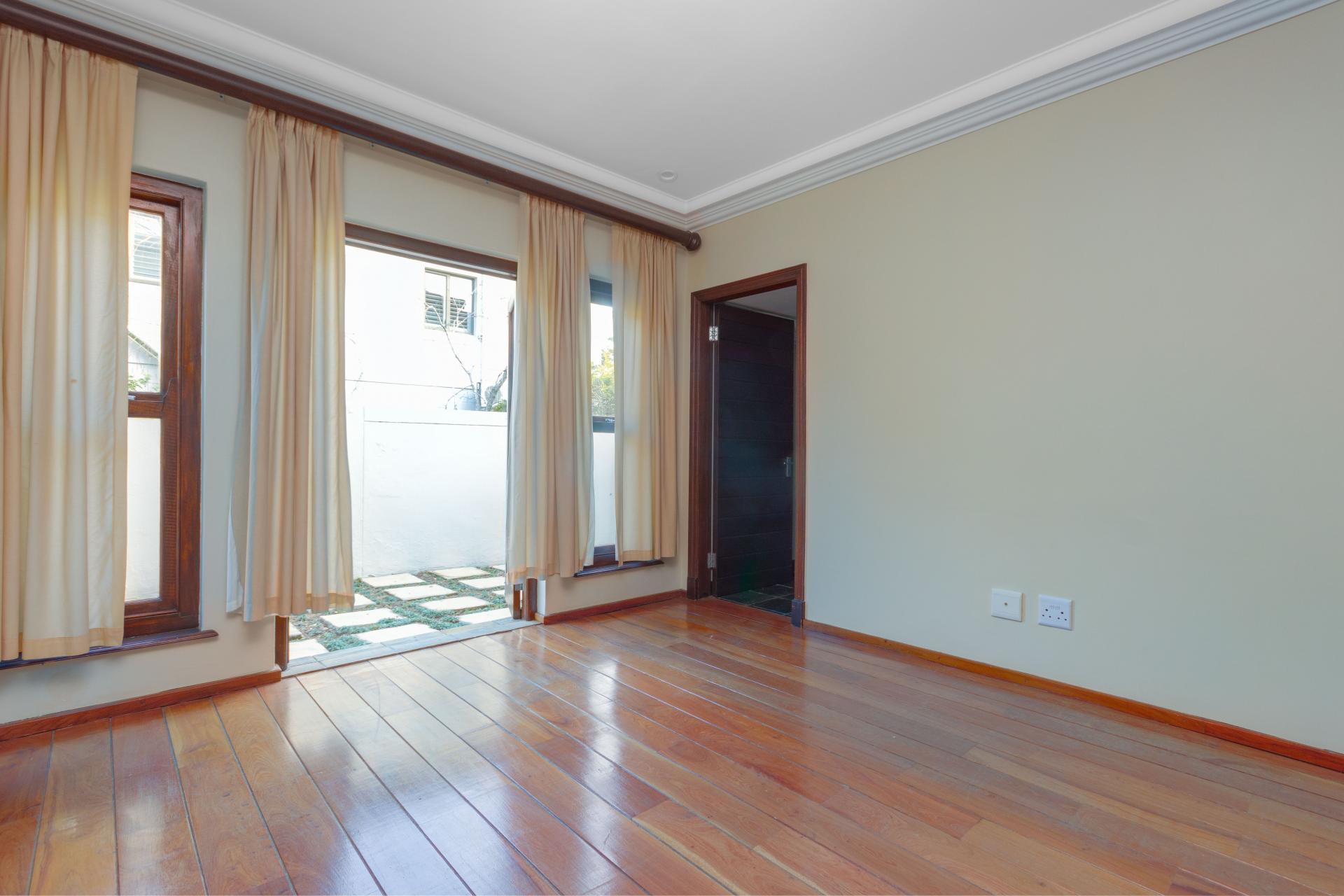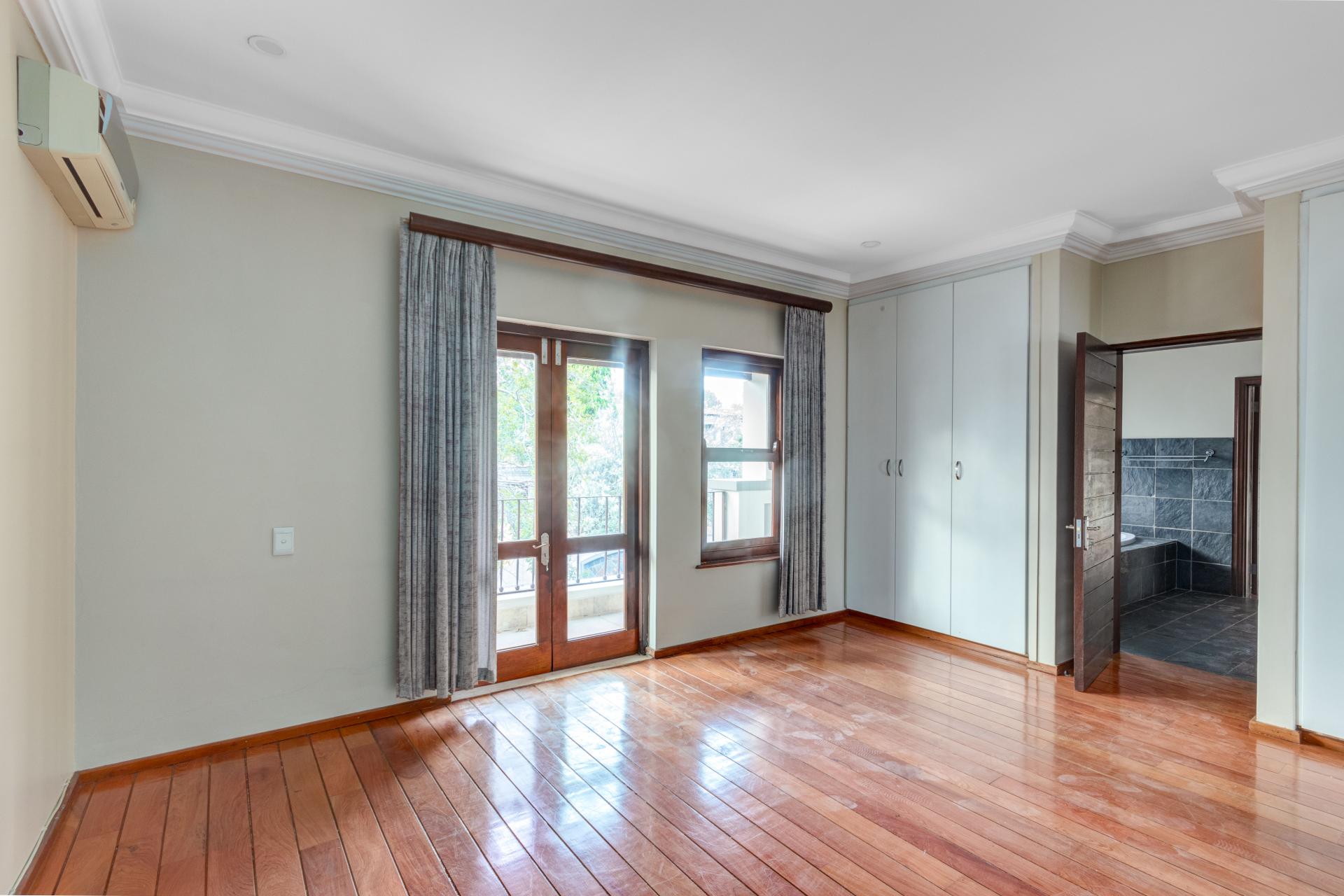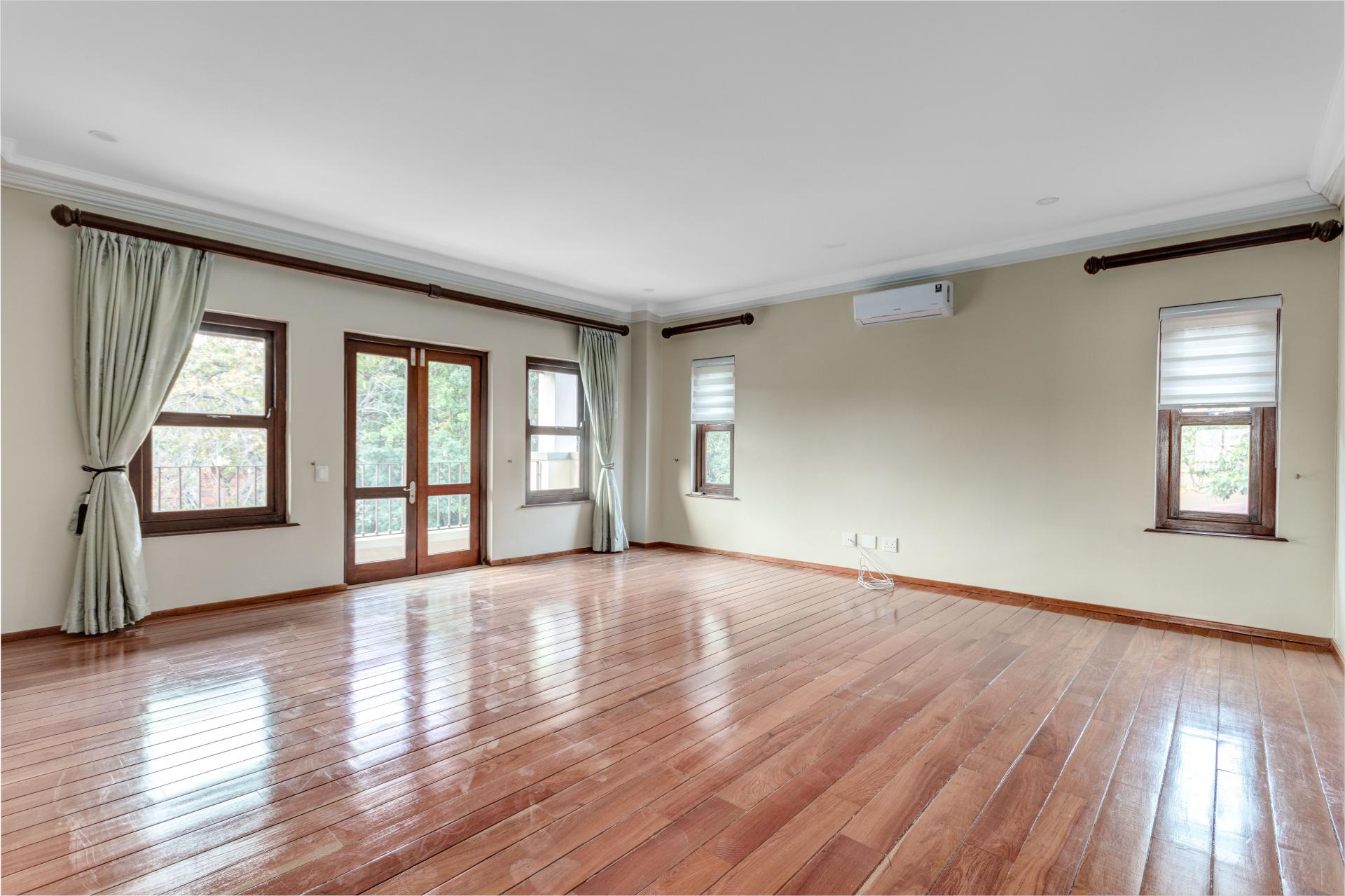 The north-facing ground floor boasts expansive reception areas with elegant solid wood flooring. An indoor/outdoor patio, ideal for casual gatherings, is equipped with a built-in braai, ceiling fans, and stack-back doors that seamlessly blend indoor and outdoor spaces, providing ample room for dining and lounging.