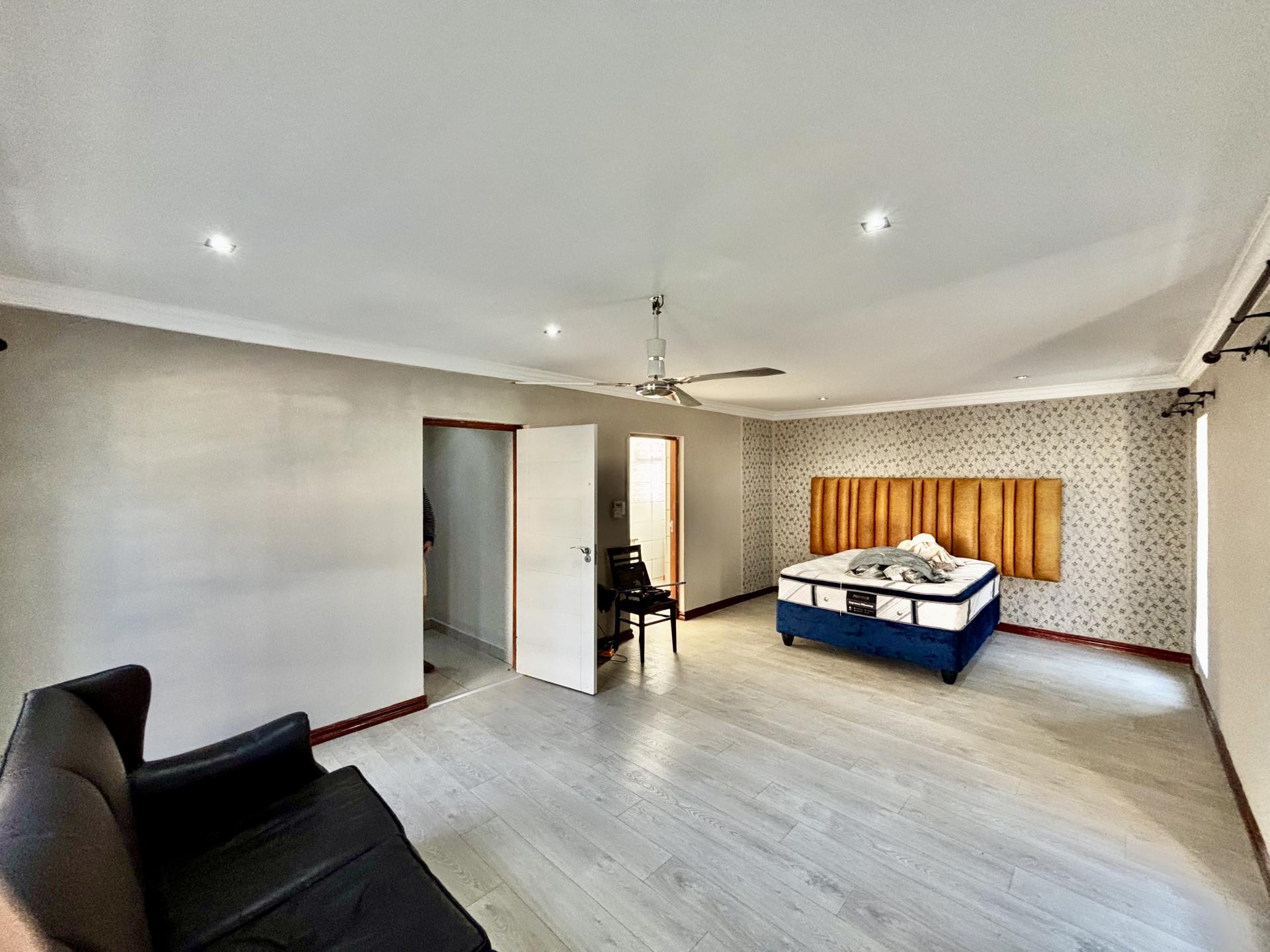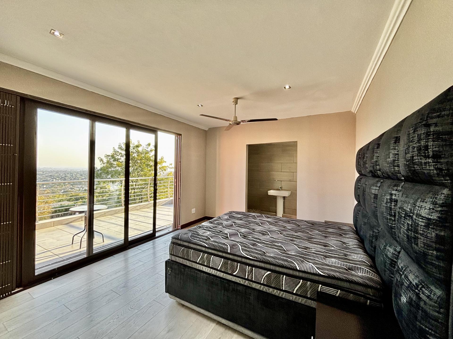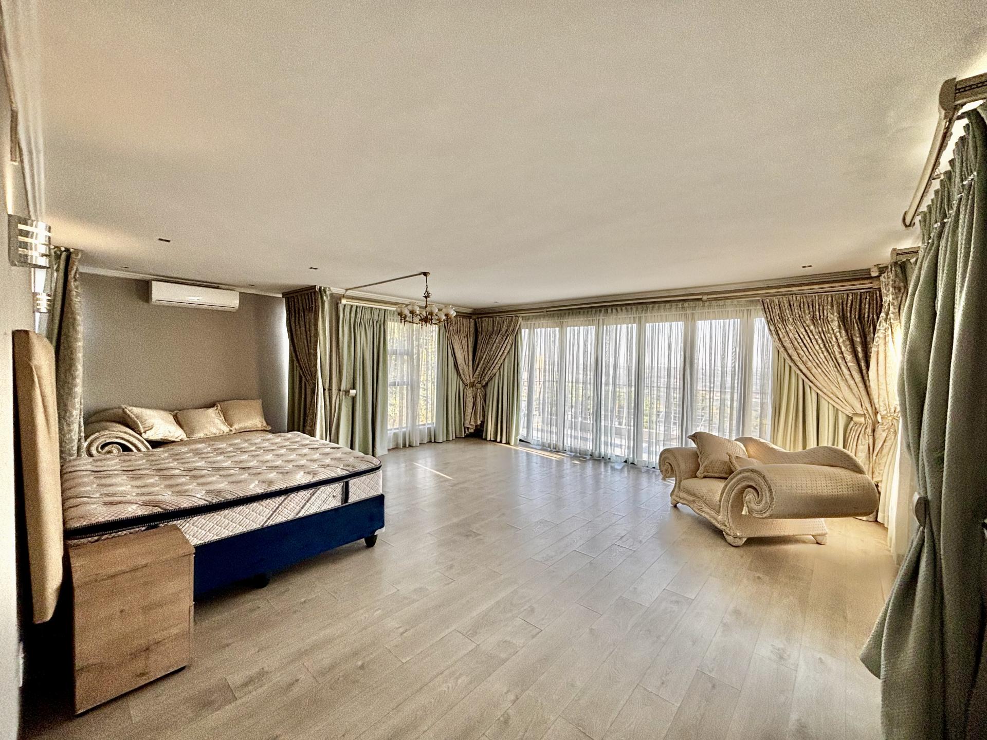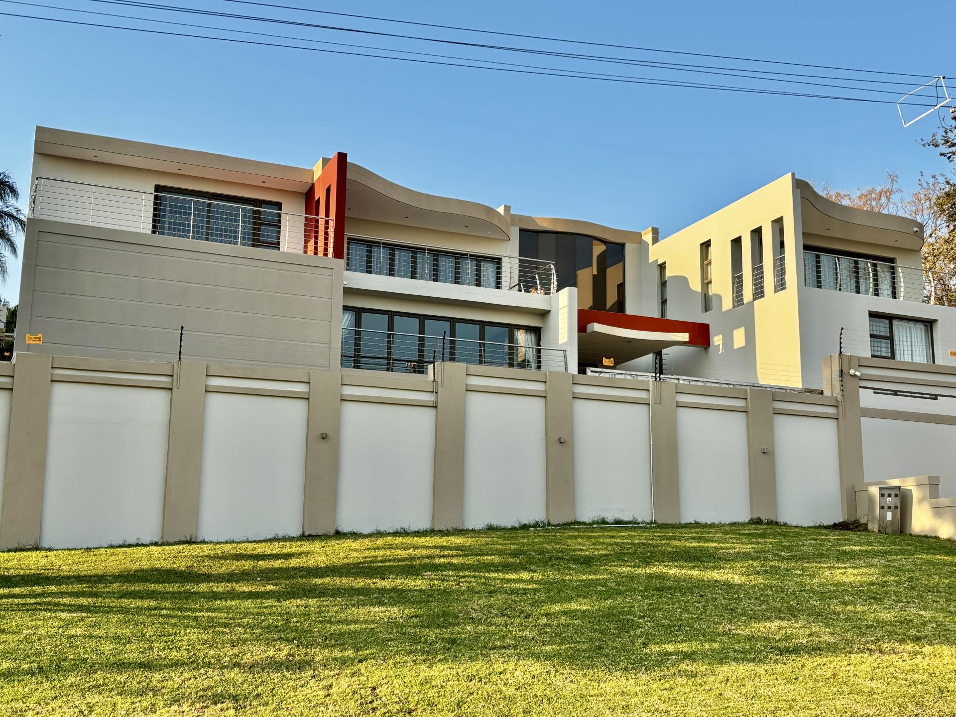 The sleek, ultra-modern kitchen is a chef’s dream, featuring premium appliances and seamless flow into a dining room built for grand gatherings. Upstairs, eight spacious bedrooms, each with its own luxurious en-suite bathroom, offer serene retreats. The upper-level rooms open onto a wide balcony, unveiling panoramic views of Waterkloof Ridge’s scenic beauty.