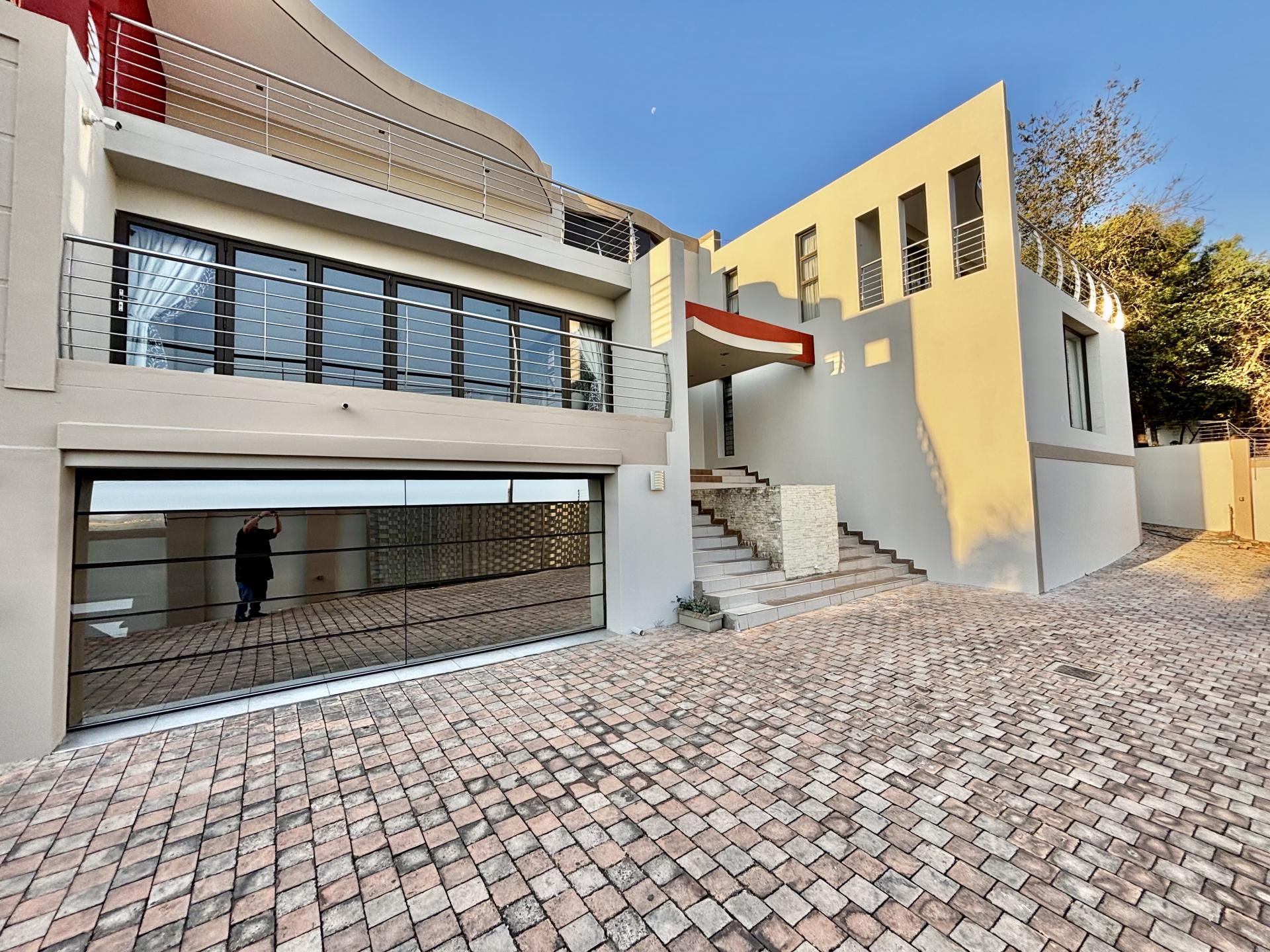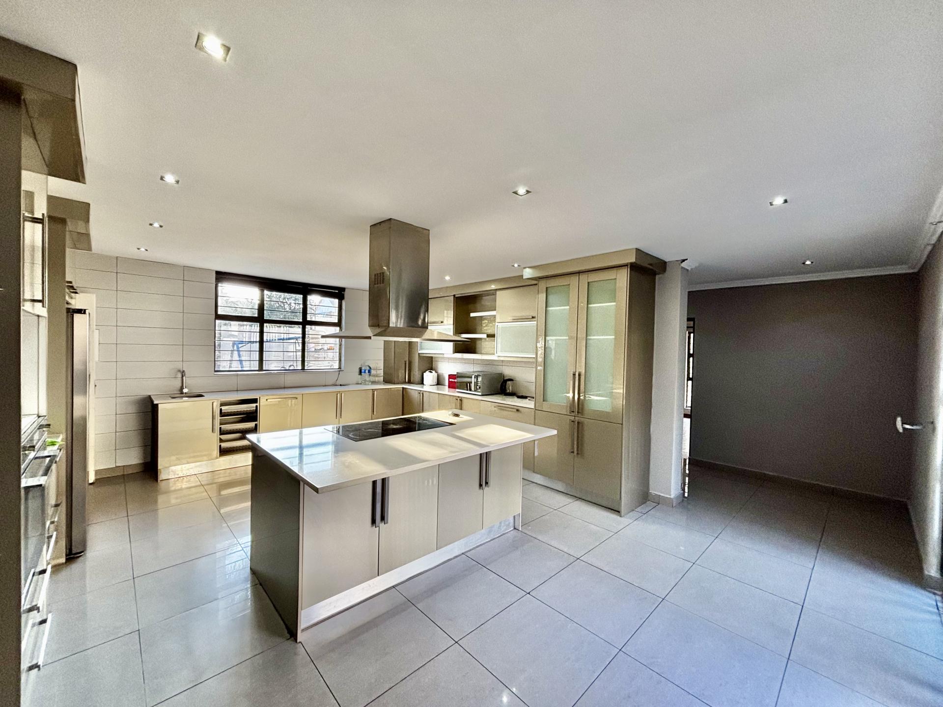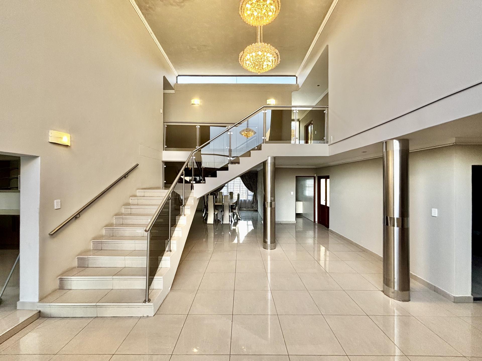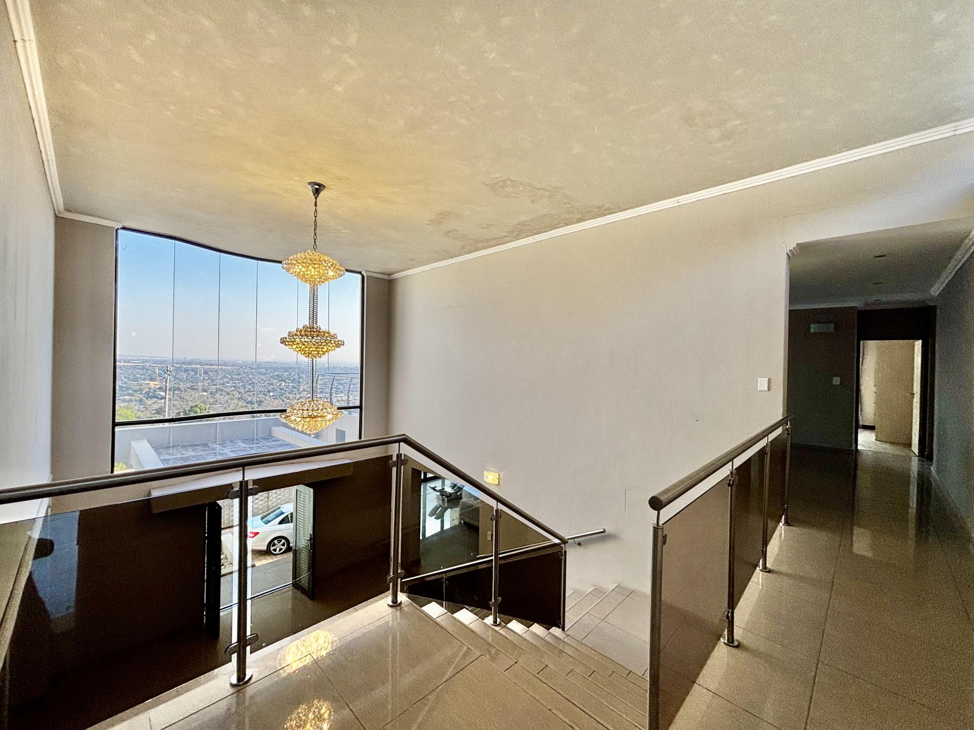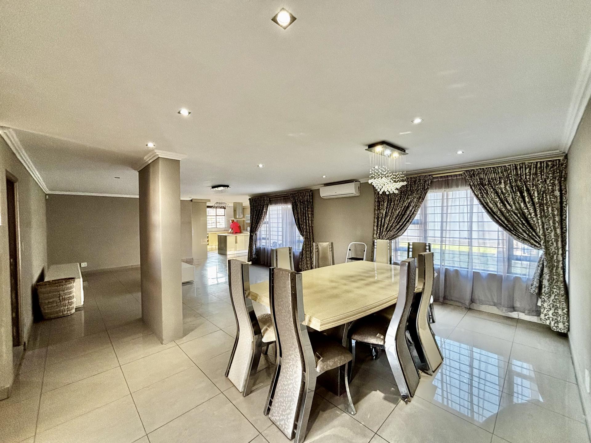The sleek, ultra-modern kitchen is a chef’s dream, featuring premium appliances and seamless flow into a dining room built for grand gatherings. Upstairs, eight spacious bedrooms, each with its own luxurious en-suite bathroom, offer serene retreats. The upper-level rooms open onto a wide balcony, unveiling panoramic views of Waterkloof Ridge’s scenic beauty.